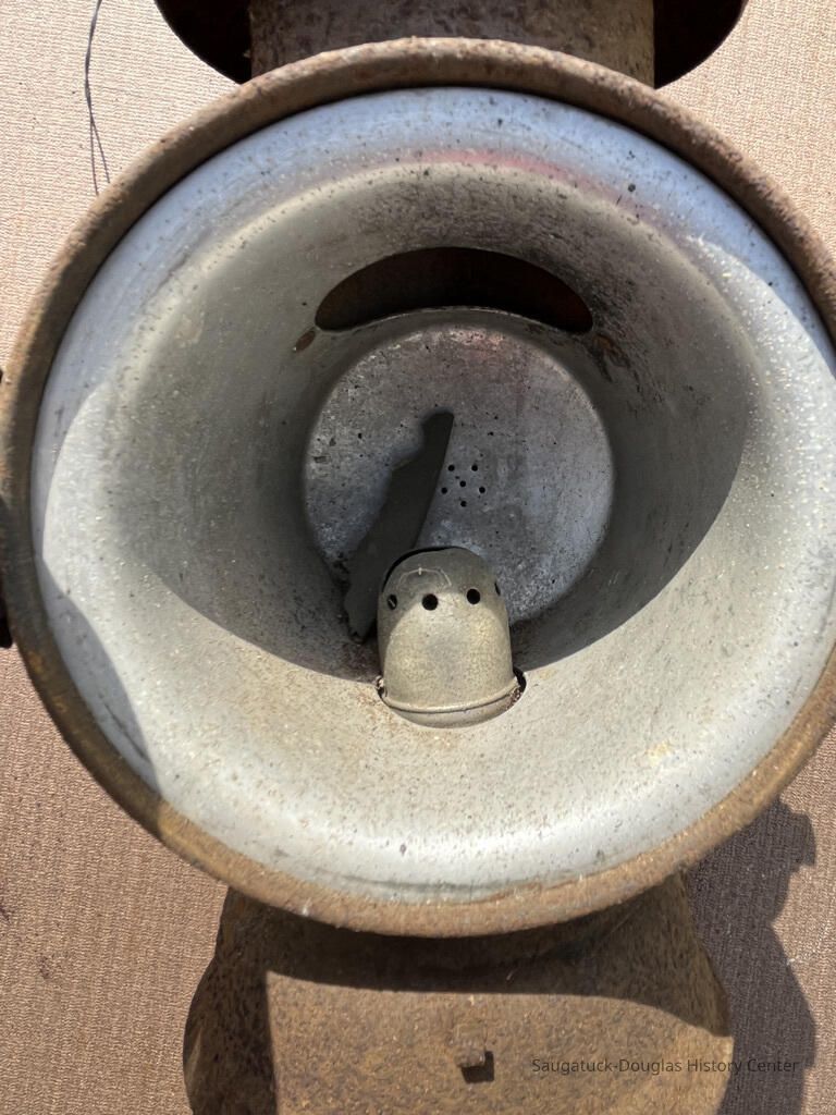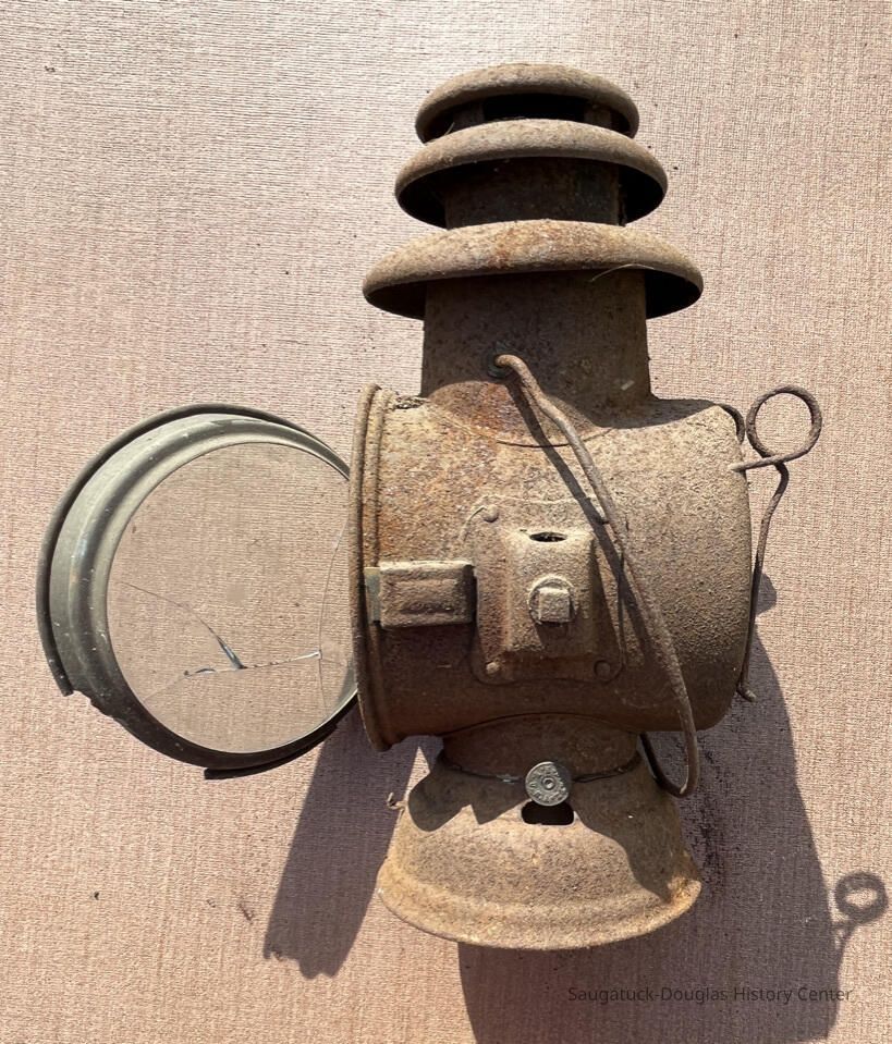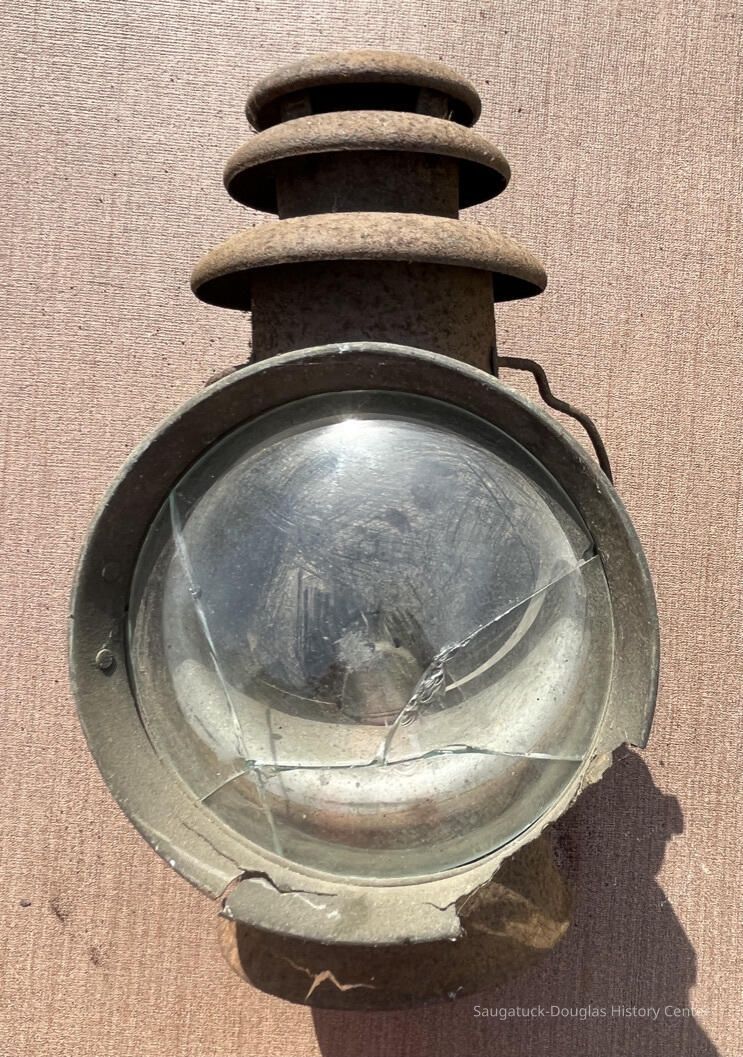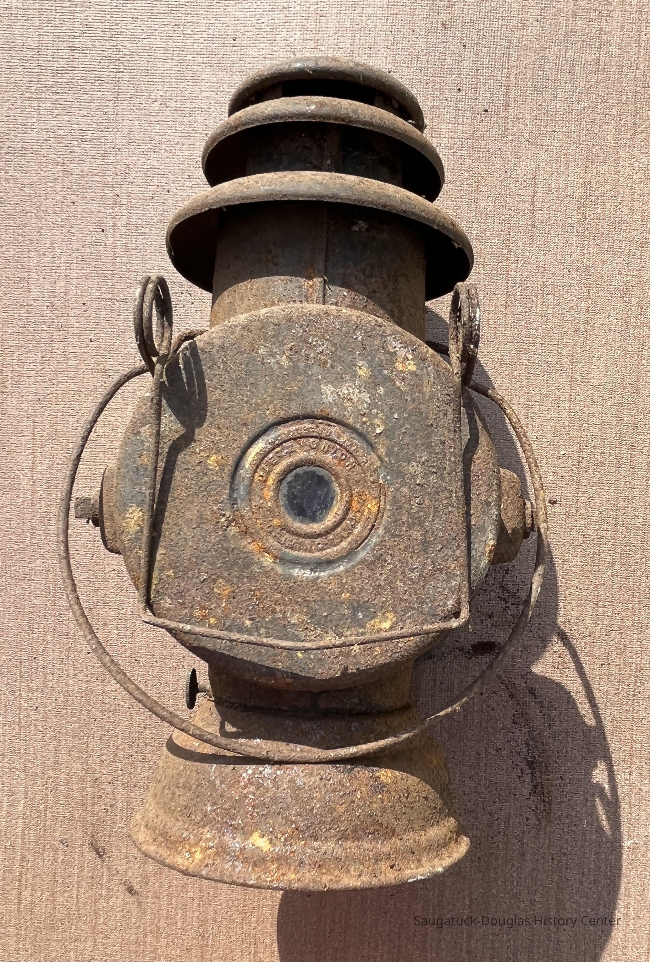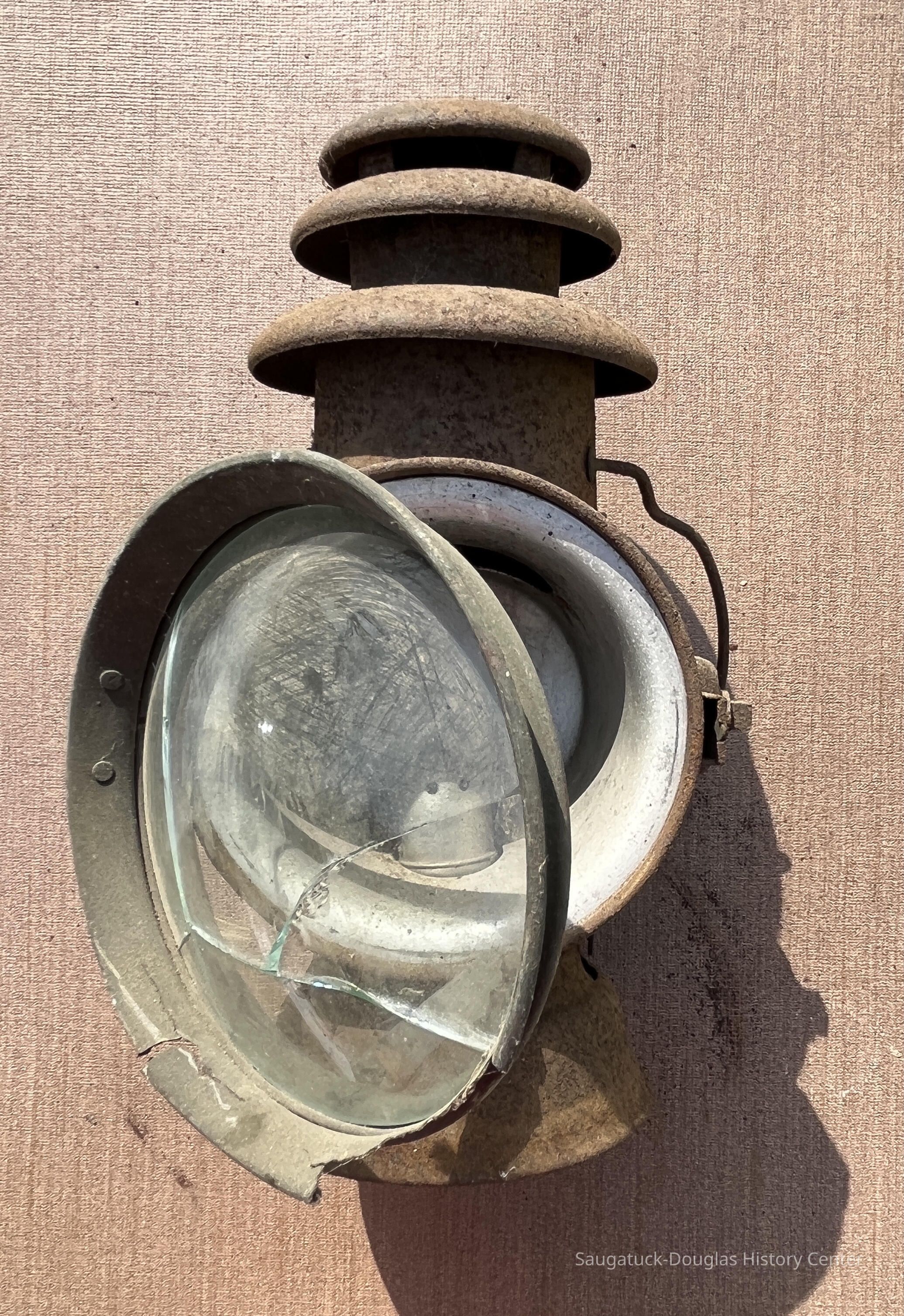 Lightweight metal lantern with latching clear glass lens, triple-roofed vented chimney and wire handle. Lantern burned a liquid fuel like kerosene or oil that was held in a reservoir in the base. Wick is missing. Glass lens and lens rim is broken. Spring-tension clip on back suggest lamp could be attached to a boat, carriage or fence post. Body of lantern is covered in fine haze of rust.Acquisition
