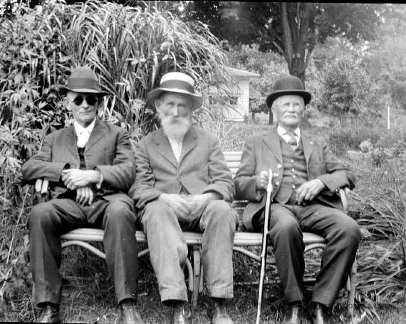 This image was featured as History Mystery #21 with the question "We believe that these three gents posing ca 1910 had something in common. What was it and can you identify any of them?" and the solution "The men are the last survivors of the Civil War. The gentleman in the middle is Charles Billings. The others are unidentified."Photograph Details