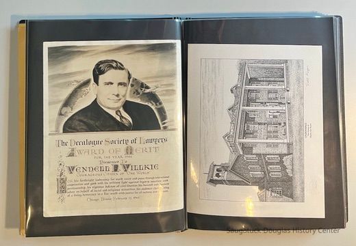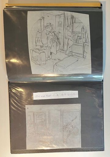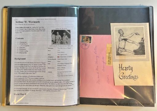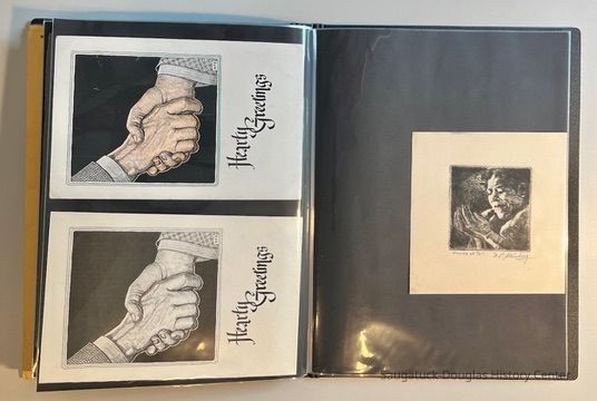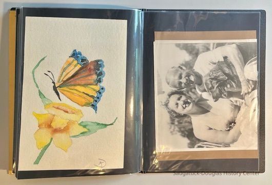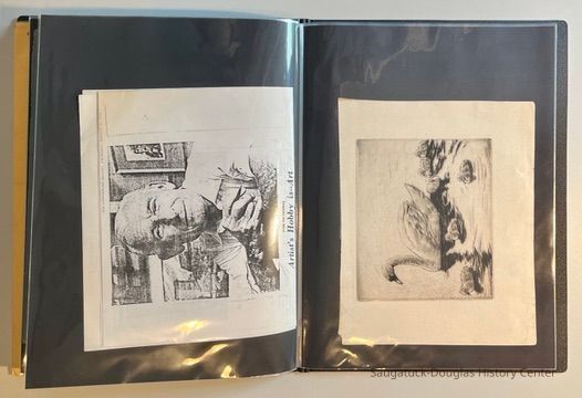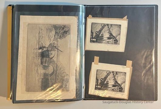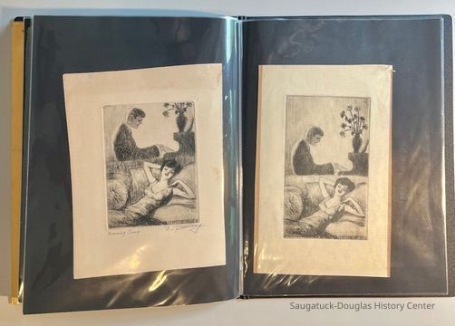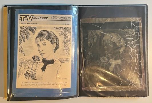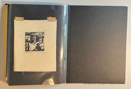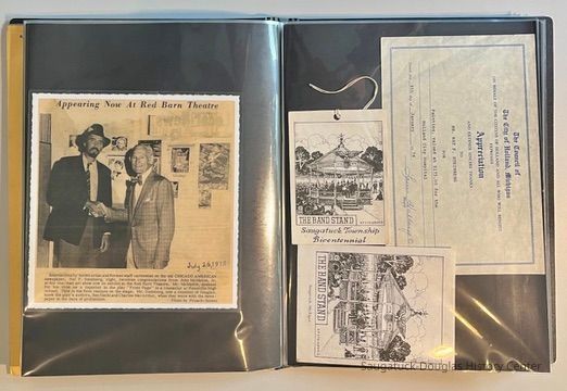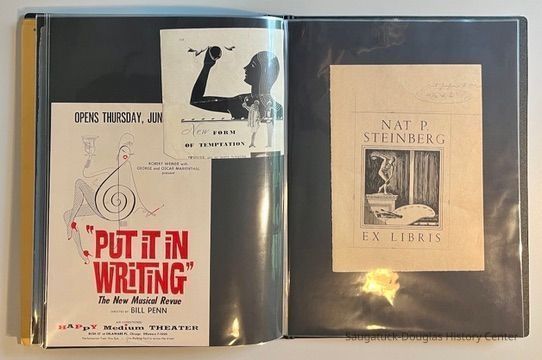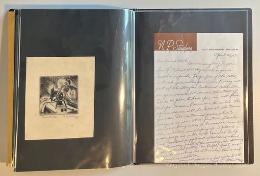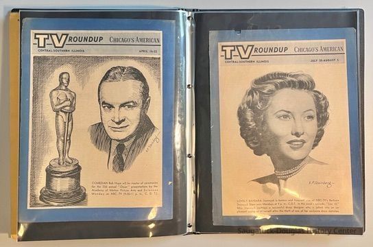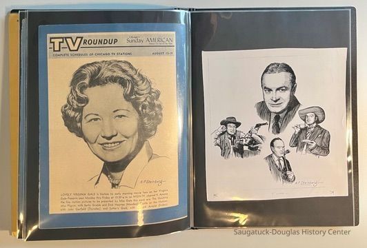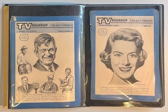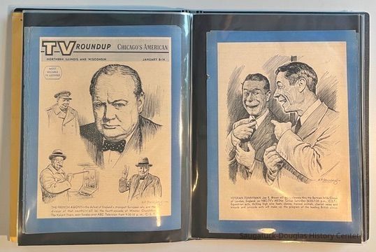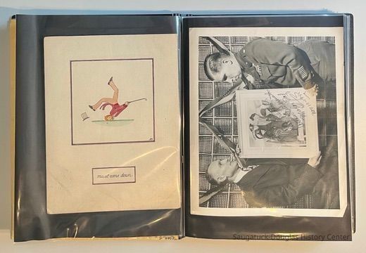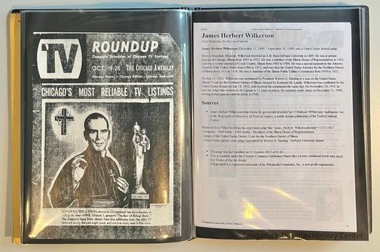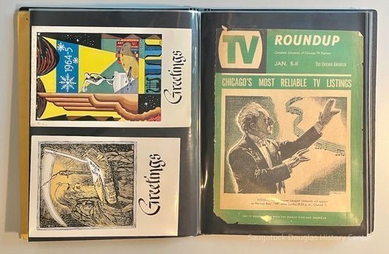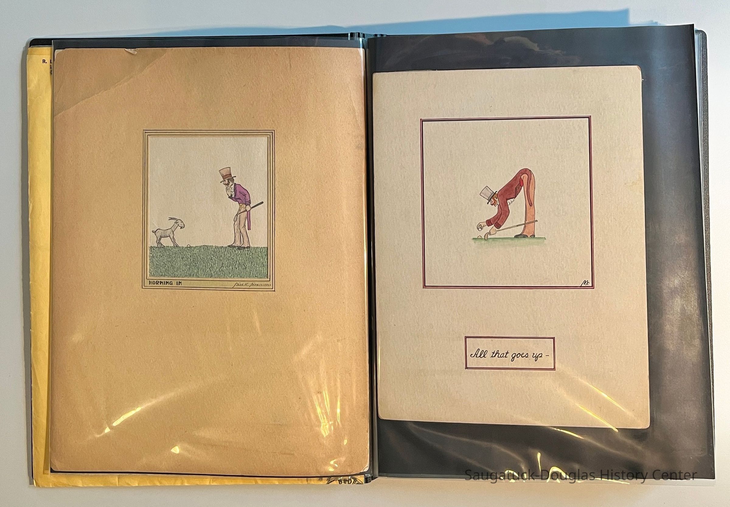 Left: Envelope address to Mr. & Mrs. Henry Latas, 13 Cour Versailles, Palos Hills, IL 60465 from R. Lloyd & Company, Ltd., 15100 S. LaGrange Rd., Orland Park, IL 60462, postmarked 1986. The envelope contains a copy of the Oct. 19-25, 1958 The Chicago American TV Roundup (a television programing guide) with an illustration of Bishop Fulton J. Sheen by Nat Steinberg on the cover. Right: Matted and hand colored print titled "Hog-in" the Green, with an ink drawing or print of a Victorian golfing gentlemen about to kick the rump of a pig who is blocking the gent's access to his golf ball. The image is signed Bill R. Simmons and has a note about reproduction rights reserved on the verso.