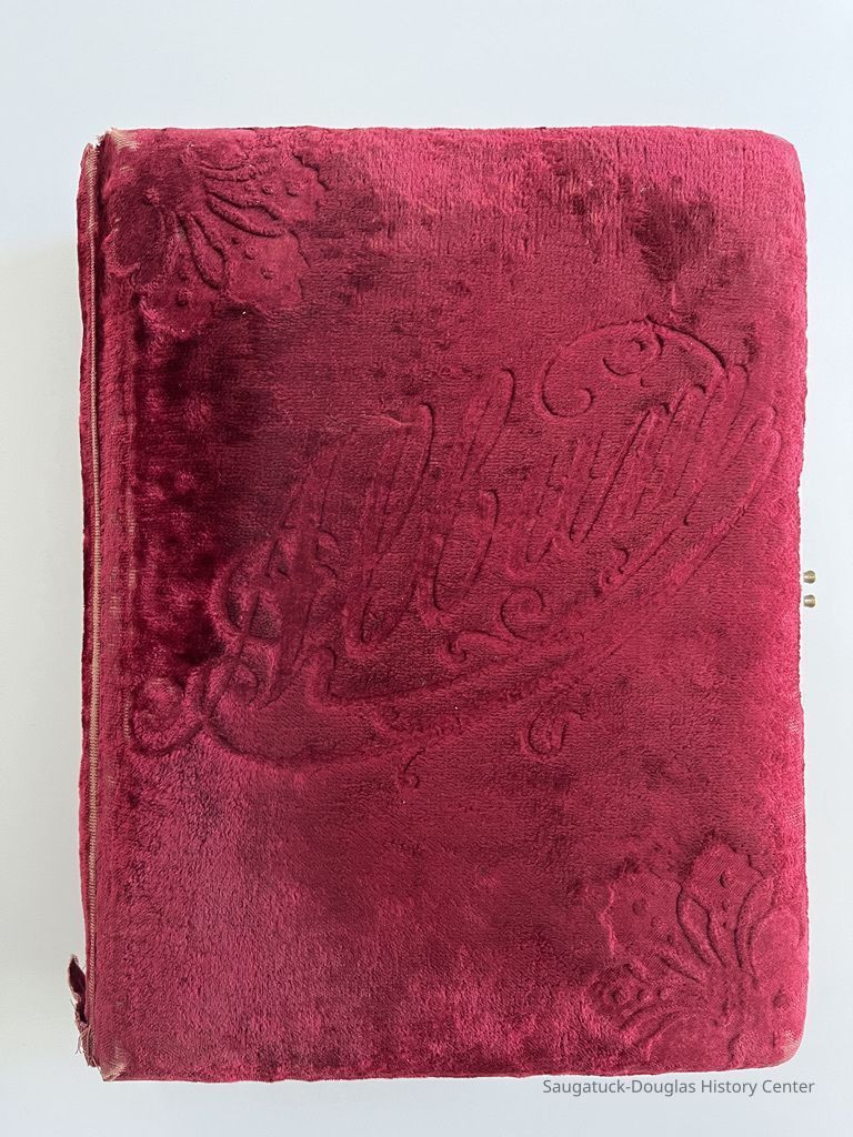 Large photo album loaded with cabinet card portraits of members of the Lee Leland family. Album cover is upholstered with red-pink velvet with embossed "Album" and flower motifs Twenty pages, with gilt edges, are designed to hold cabinet-card photos in multiple sizes.