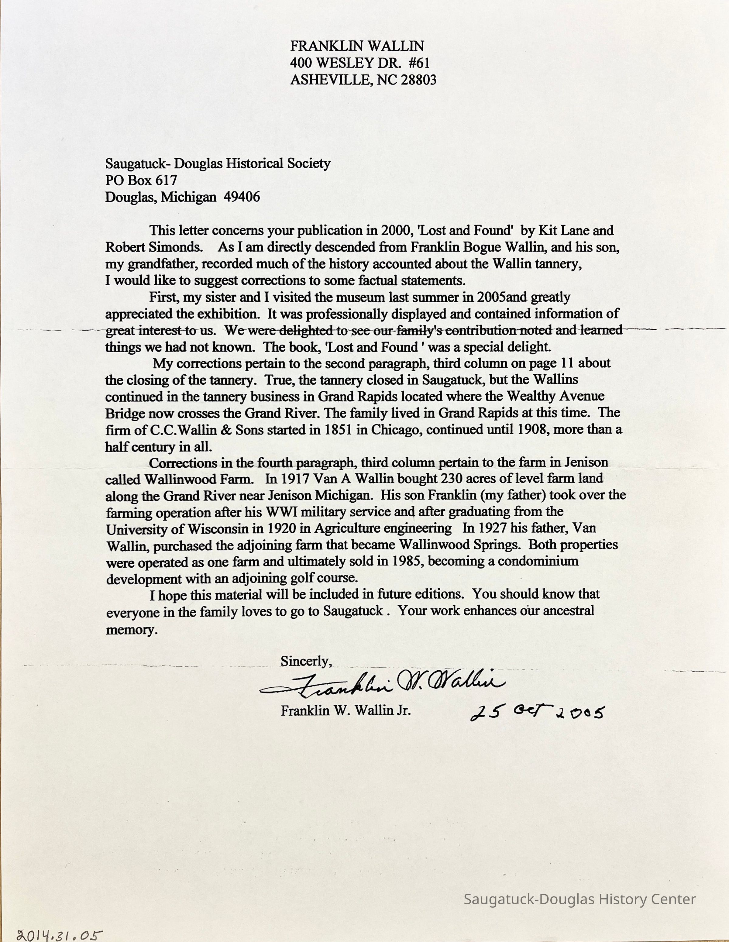 This letter concerns your publication in 2000, Lost and Found' by Kit Lane and Robert Simonds. As I am directly descended from Franklin Bogue Wallin, and his son, my grandfather, recorded much of the history accounted about the Wallin tannery, I would like to suggest corrections to some factual statements.