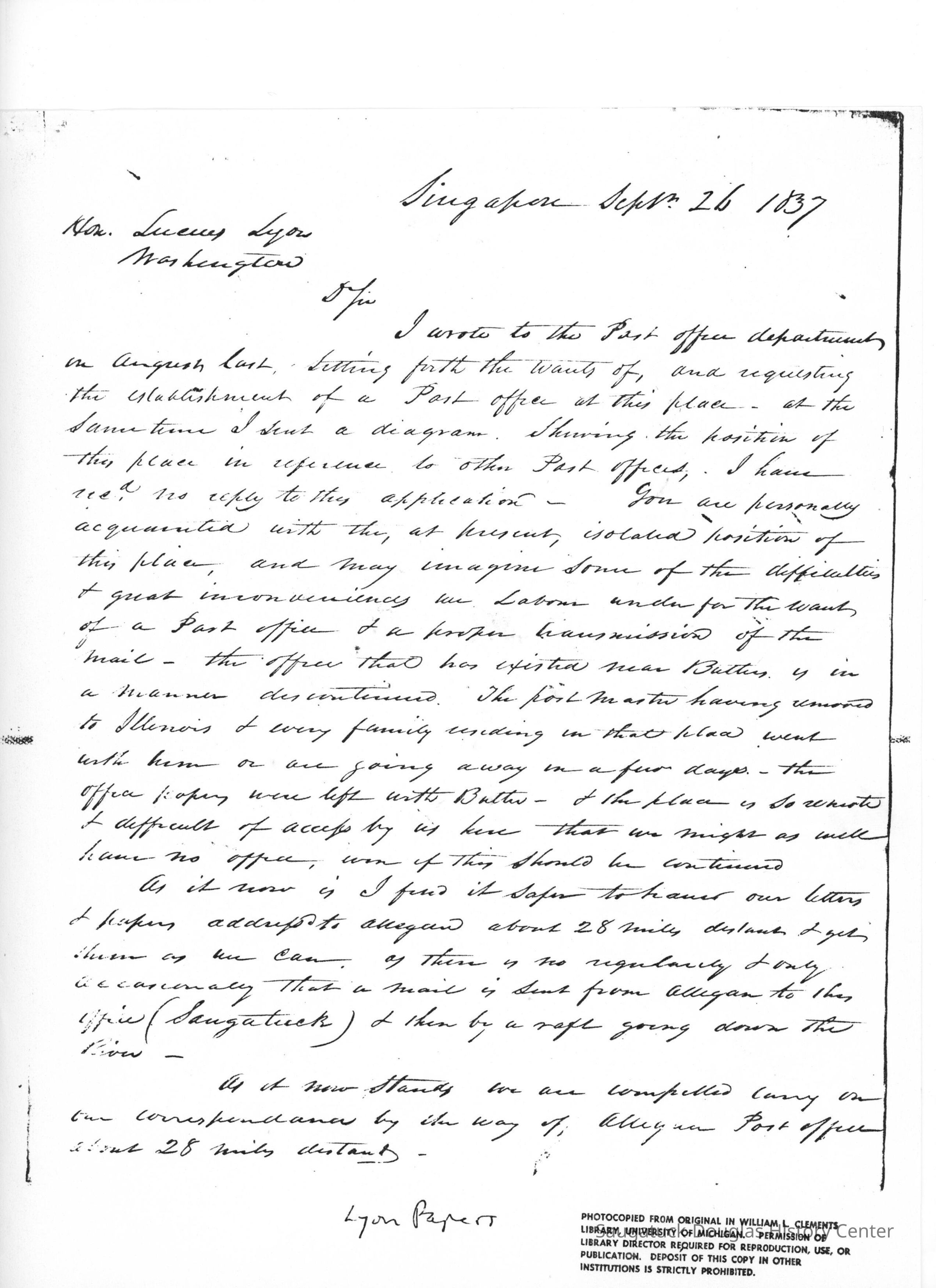 Letter from Oshea Wilder to Lucius Lyon (1837)Entry/Object ID