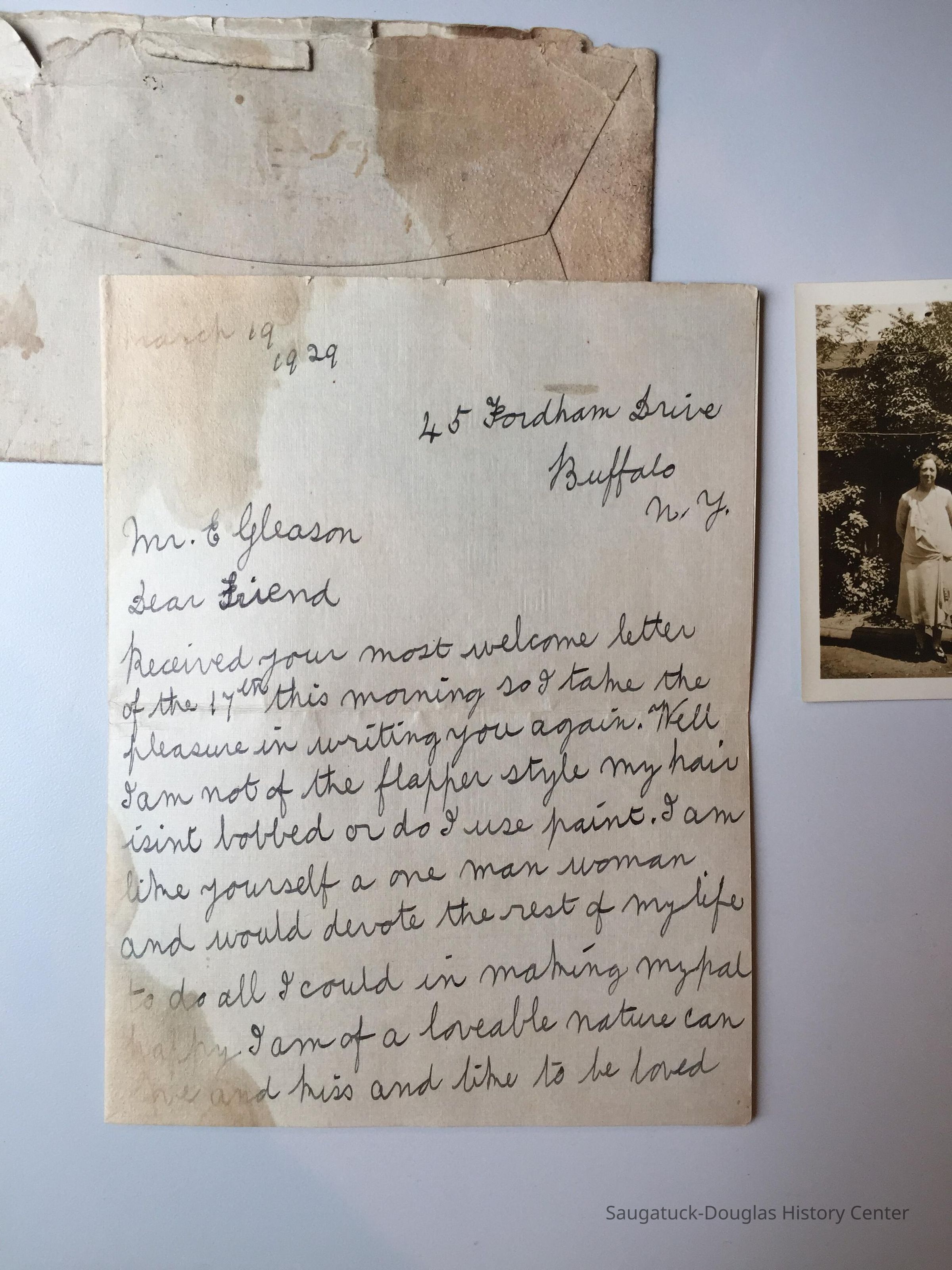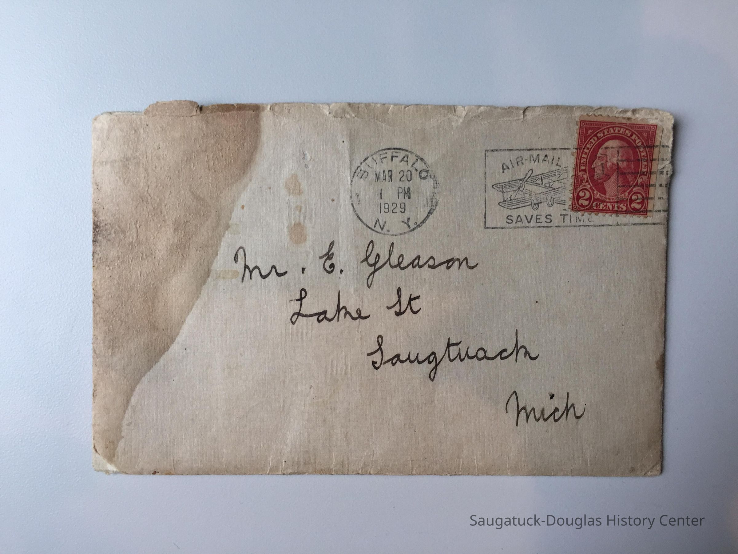 Envelope is postmarked Mar 20, 1pm 1929, Buffalo New York. 2 cents stamp. Addressed to Mr. F. Gleason, Lake St. Saugatuck, Mich. No house number.Context