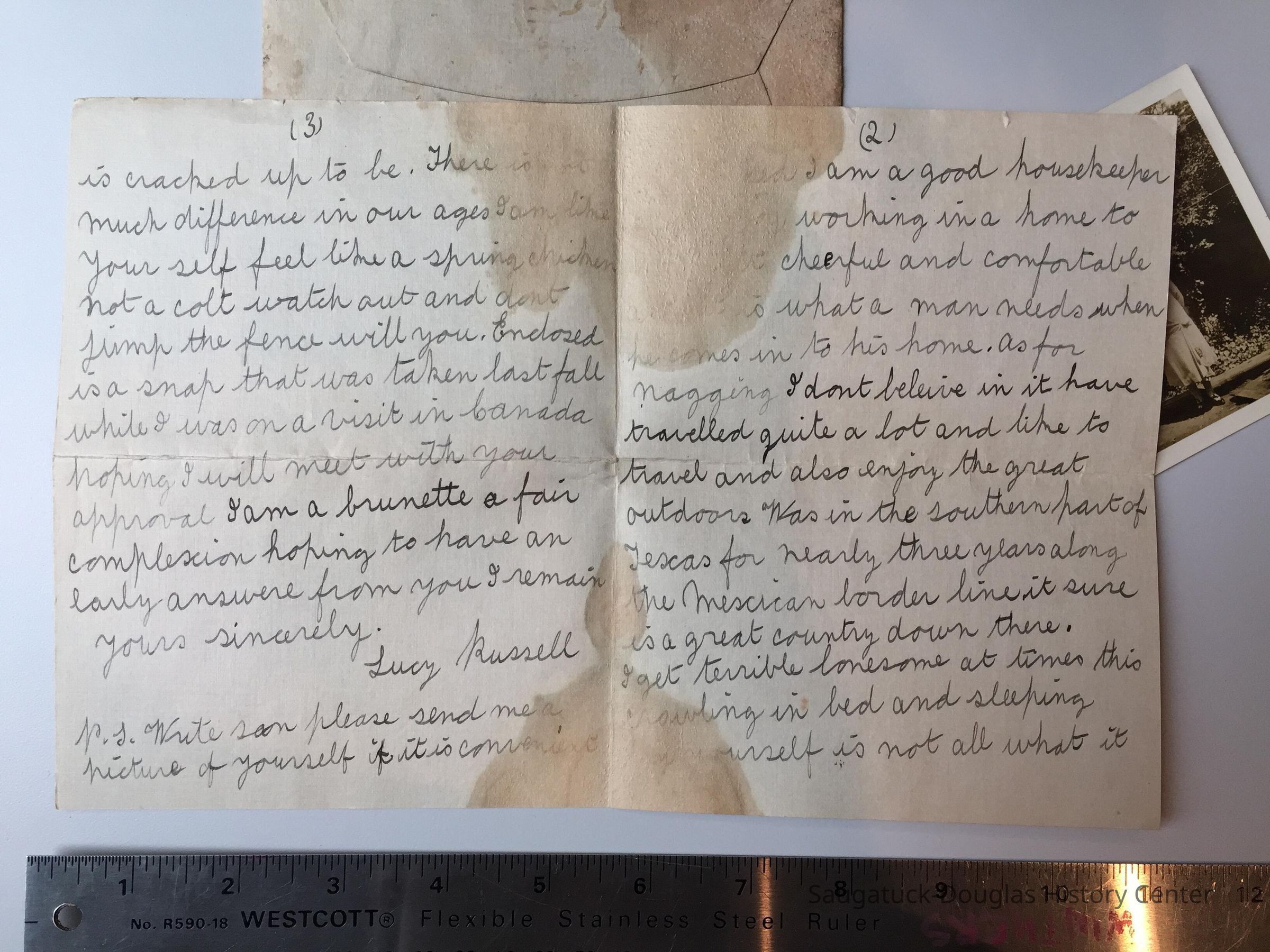 Folded letter, envelope and photograph sent in reply to letter from Mr. Gleason