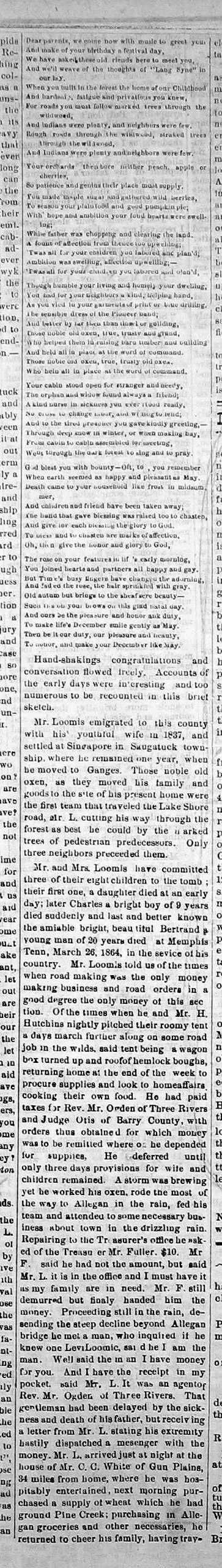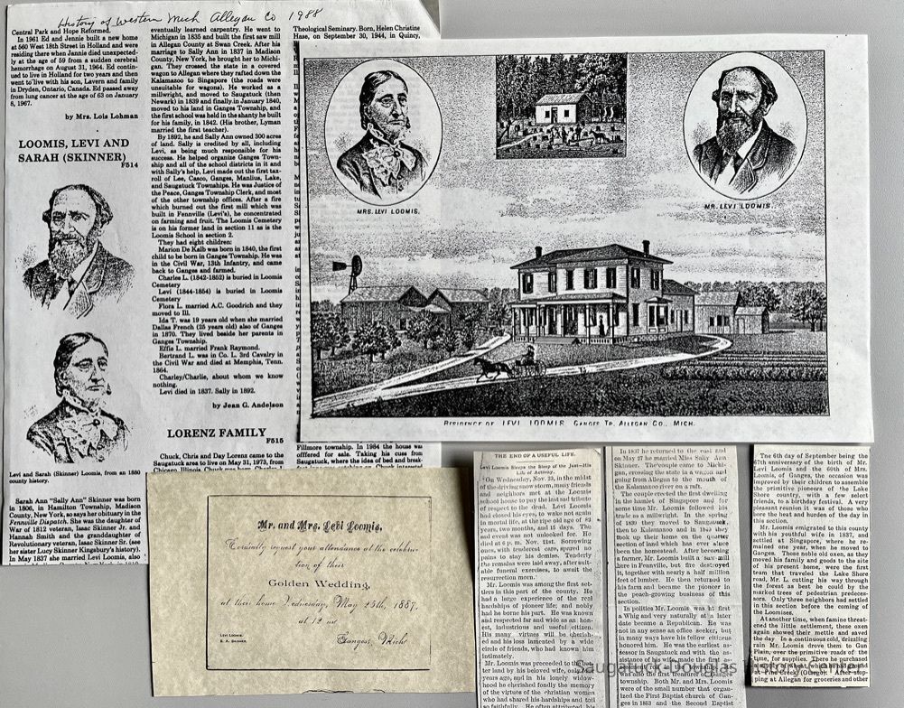 Photocopies of page from Kit Lane's "History of Western Allegan County; of Loomis farm illustration from unknown source [possibly "History of Allegan and Barry Counties, Michigan, with illustrations and biographic sketches of their prominent Men and Pioneers." 1880, published by D.W. Ensign & Co.], of golden wedding party invitation 1887, newspaper clipping obituary "The End of a Useful Life, Levi Loomis Sleeps the Sleep of the Just -- His Life of Activity"
