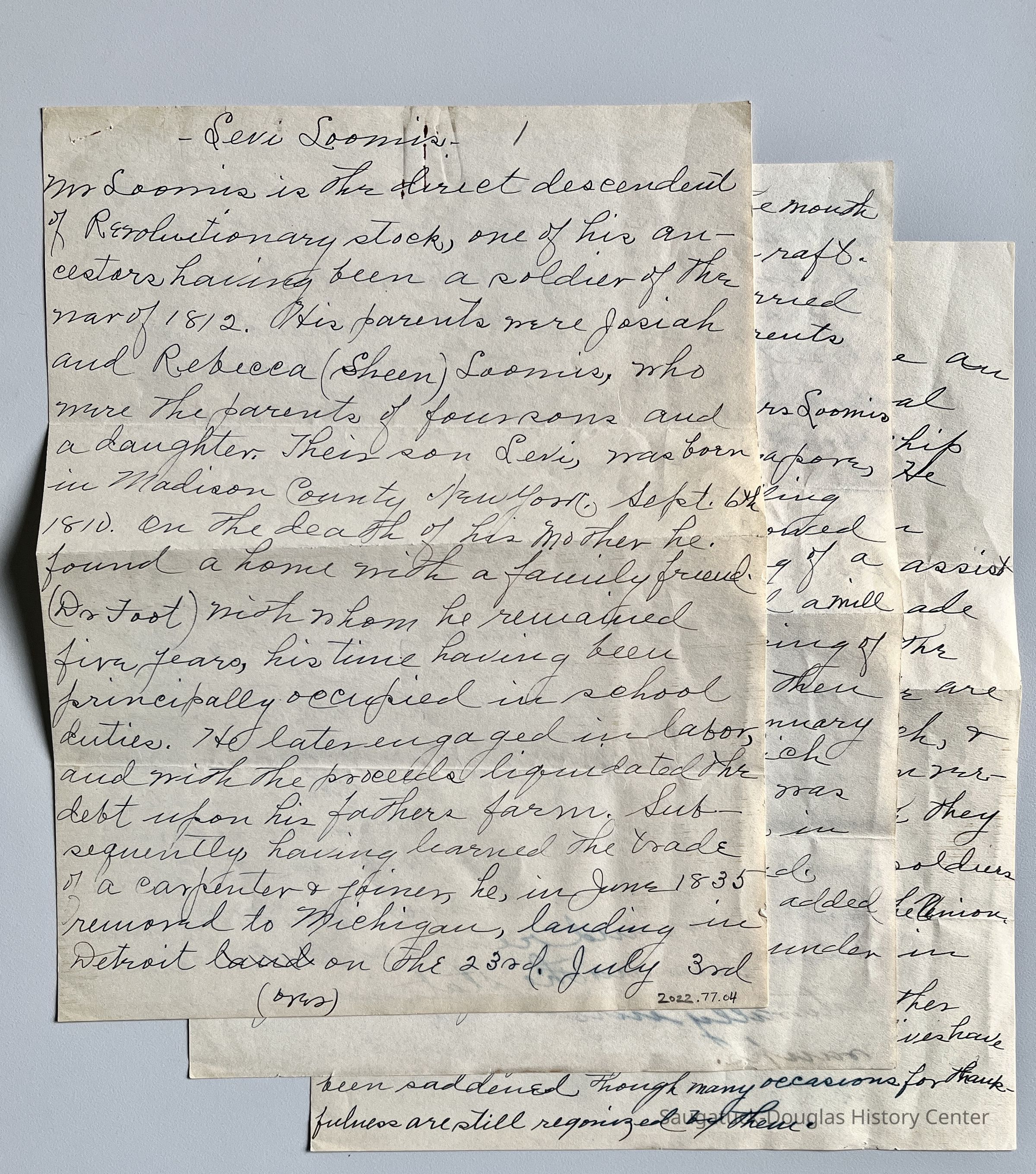Handwritten biography of Ganges pioneer Levi Loomis, author unknown and undated.