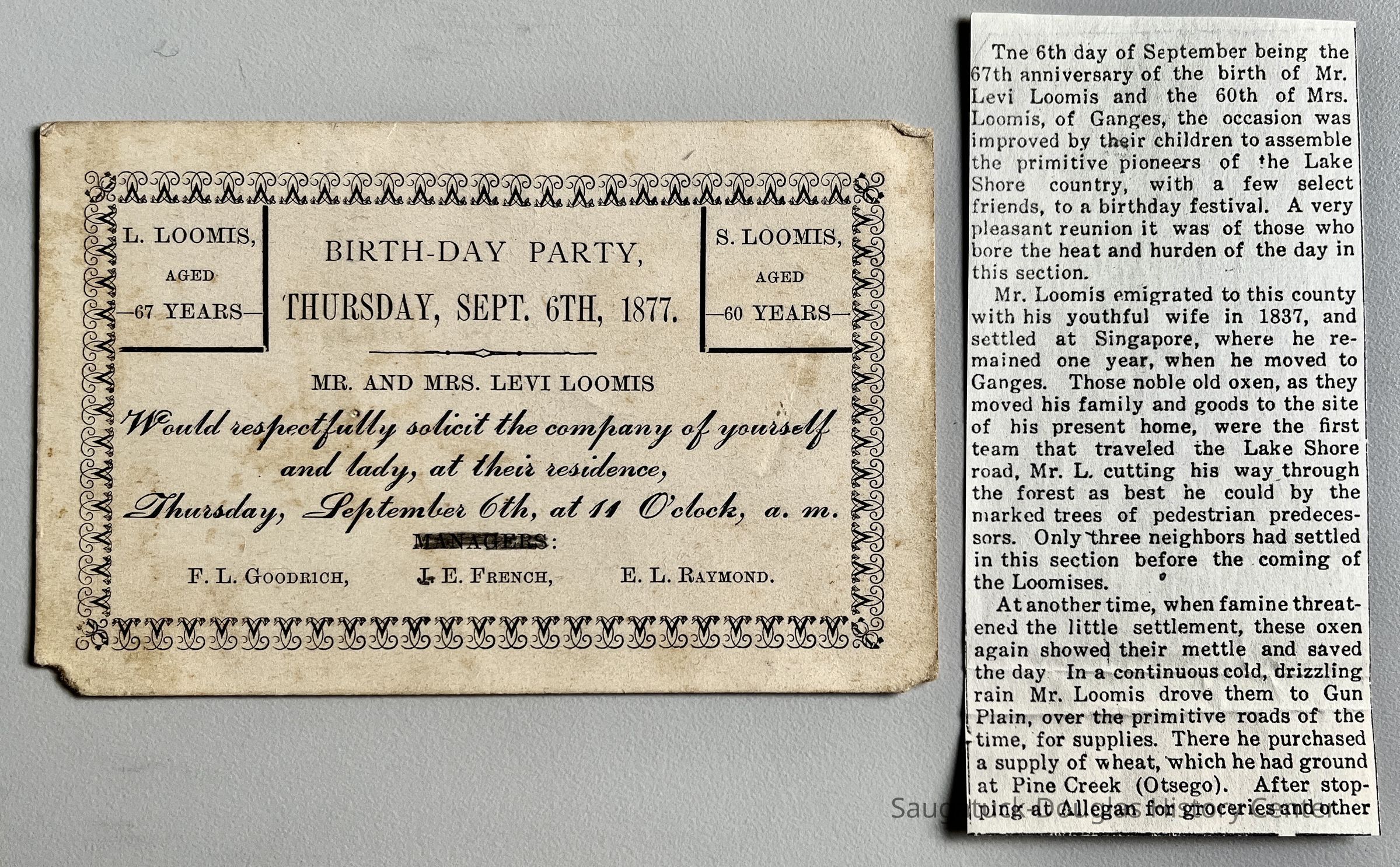 Invitation for joint birthday party for Levi Loomis and Sarah Loomis on 6 Sept. 1877 managed by F.L Goodrich, J.E. French and E.L. Raymond. Two of the celebration managers were likely daughters Florence Loomis Goodrich and Effie L. Loomis Raymond. Also newspaper clipping about event that includes an ode to "those noble old oxen."