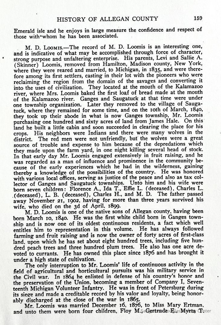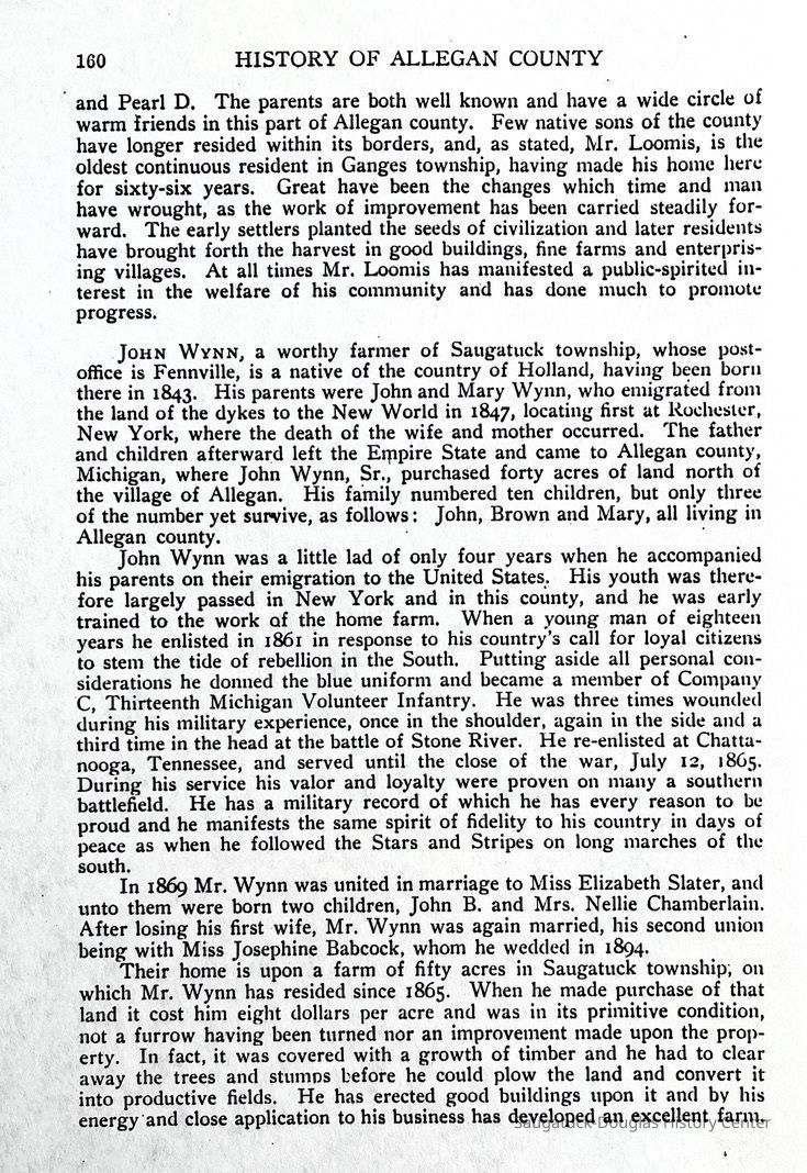 Photocopy of pages 159-160 from the "A Twentieth Century History of Allegan County" by Dr. Henry F. Thomas, 1907, about M.D. Loomis (Marion DeKalb Loomis) and John Wynn.Context