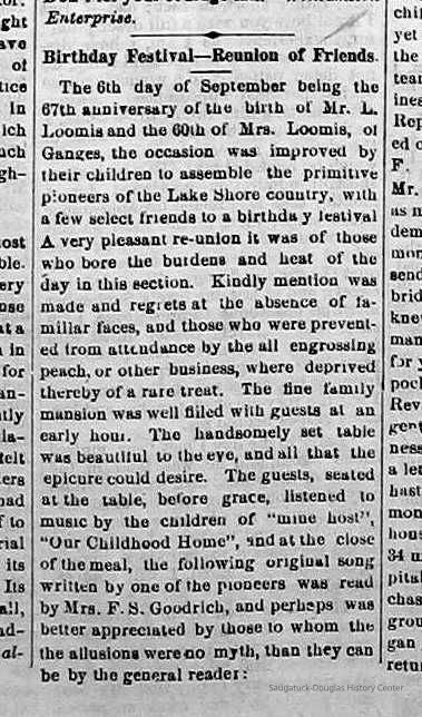 Information about Levi and Sarah Loomis of Ganges and their family. [For information about daughter Ida Loomis French Bronson, see 2022.77.06]