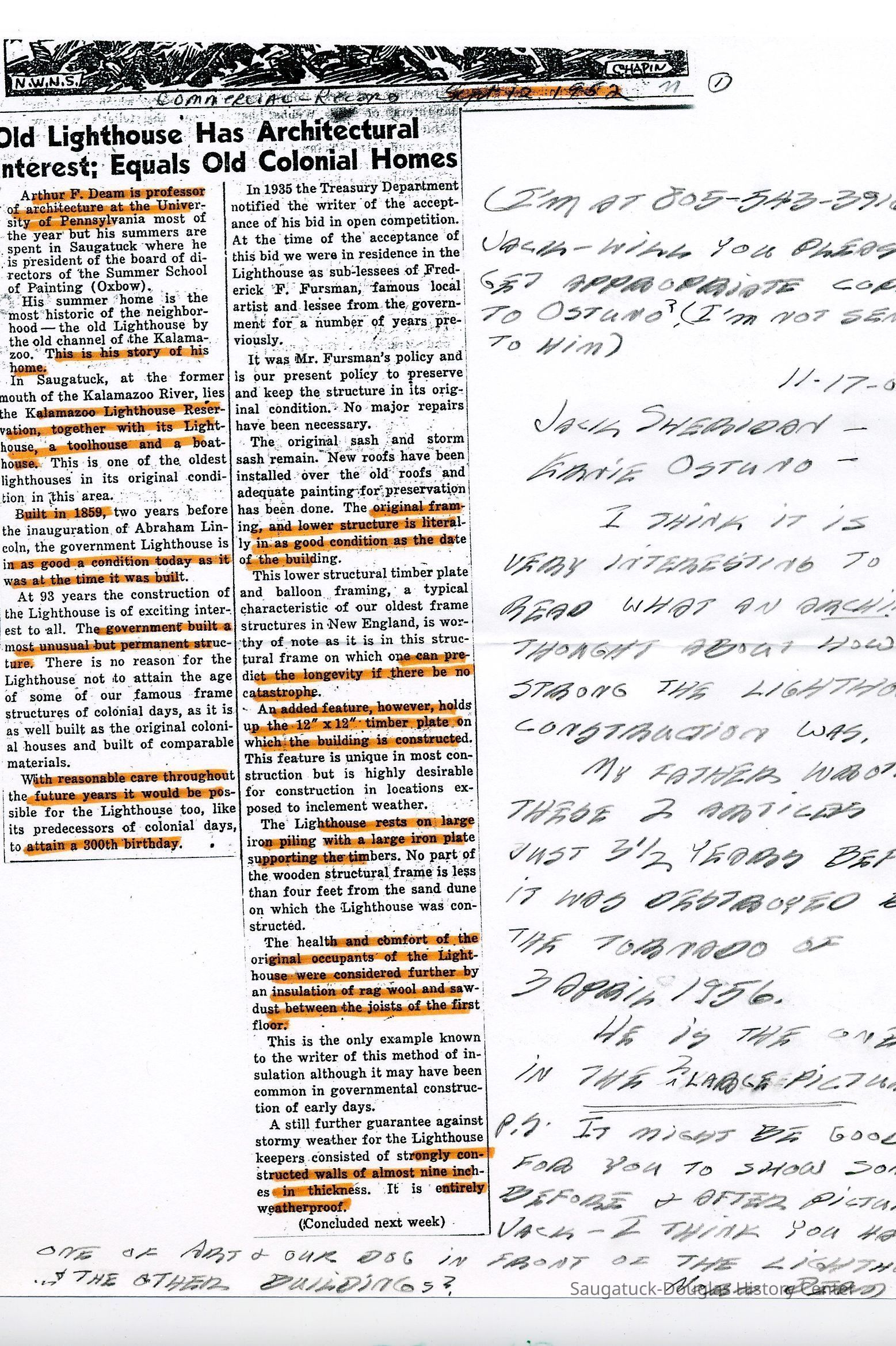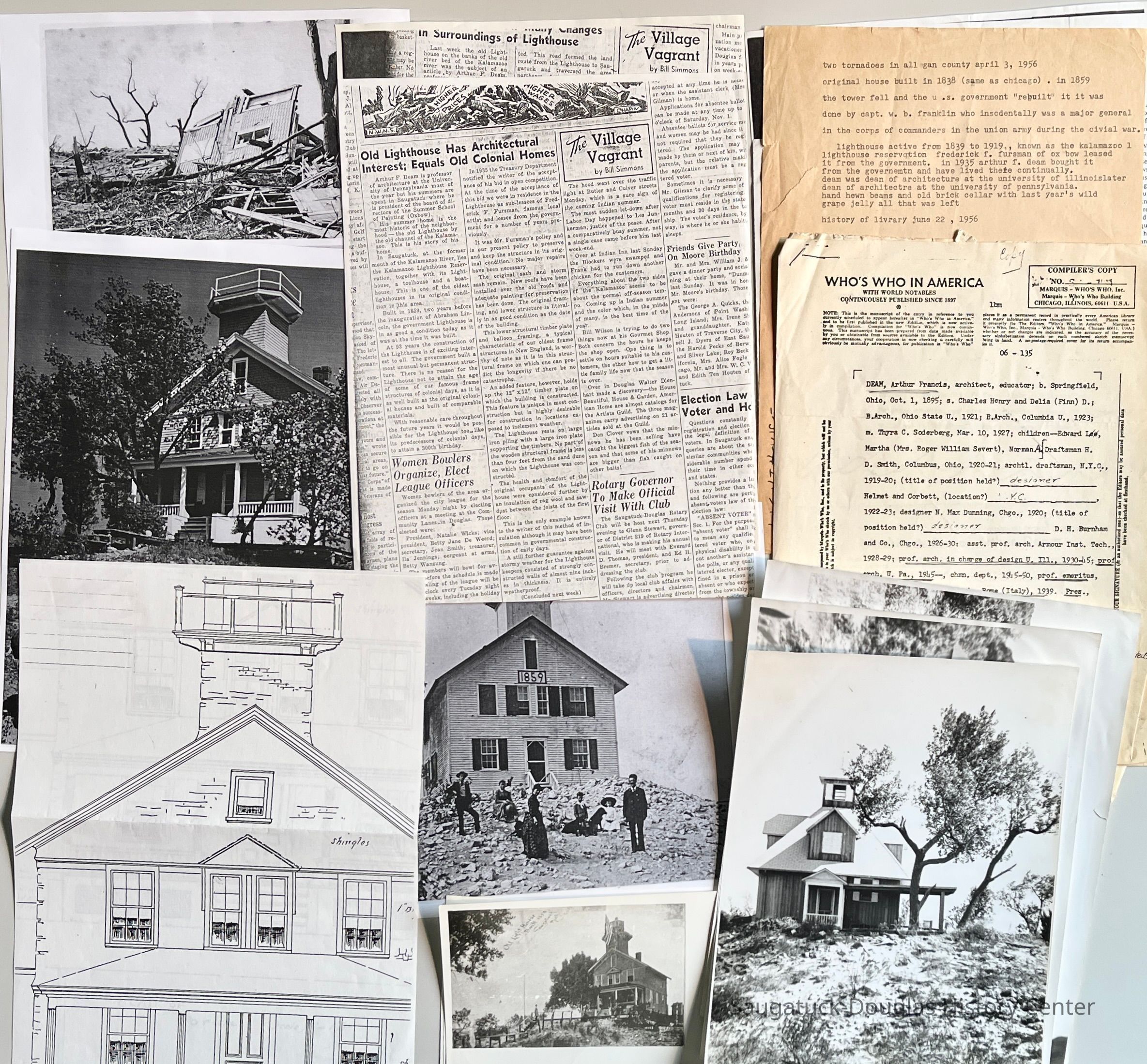 Photos, photocopies of drawings, notes, and newspaper clippings about the navigational Kalamazoo Lights, the 1956 tornado that destroyed it, and the replica cottage built on the same site, and the cottage's builder Arthur Deam.Collection