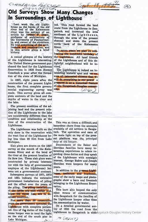 Baker, George Harris 1841-1910, Sheridan, George Henry 1868-1915, Sheridan, Sarah (Unwin) 1878-1967, Kalamazoo Lighthouses 1839/1858/1956-present, Old Harbor/Channel piers pre-1906/Ox-Bow Lagoon, Fishtown, Kalamazoo Lighthouses 1839/1858/1956-presentCollection