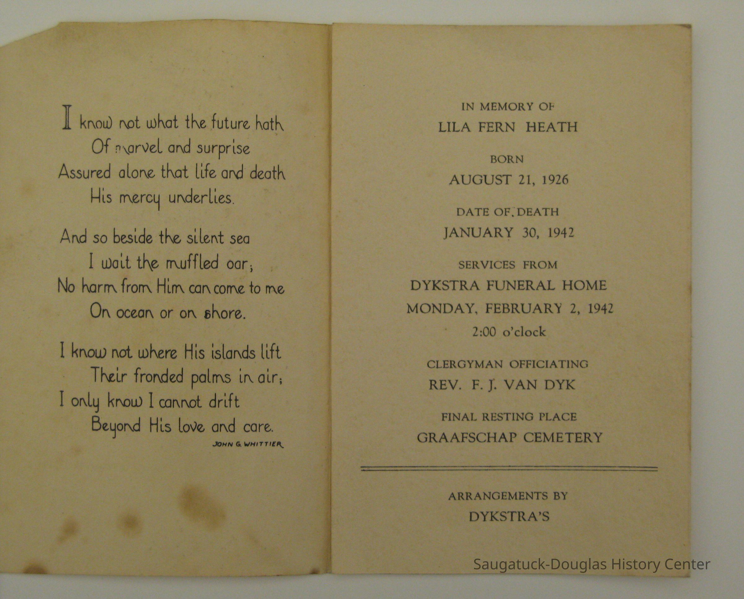 Paper memorical card for the service for Lila Fern Heath. The card is small and has a trifold. The cover has a printed image of church windows while the inside folds contain a poem by John Whittier and details about the service. It was held on February 2, 1942 at the Dykstra Funeral Home at 2:00 PM. Lila Heath's final resting place was in the Graafschap Cemetary. It is very likely that the Moker family knew Lila Heath and attended her memorial service, keeping the card afterwards.Collection