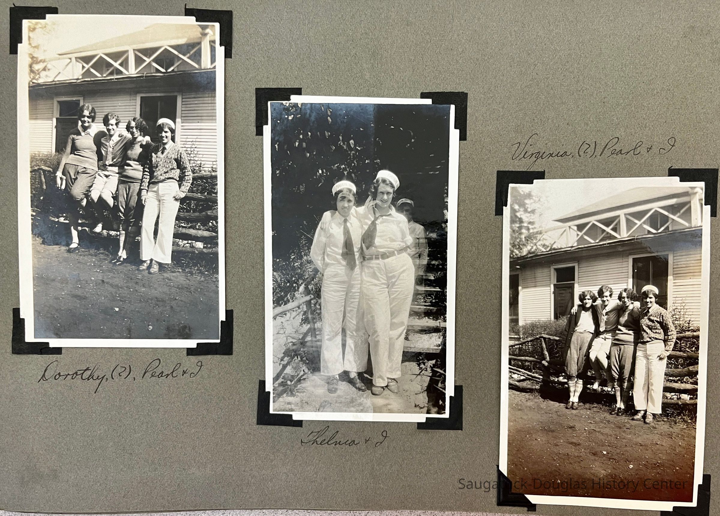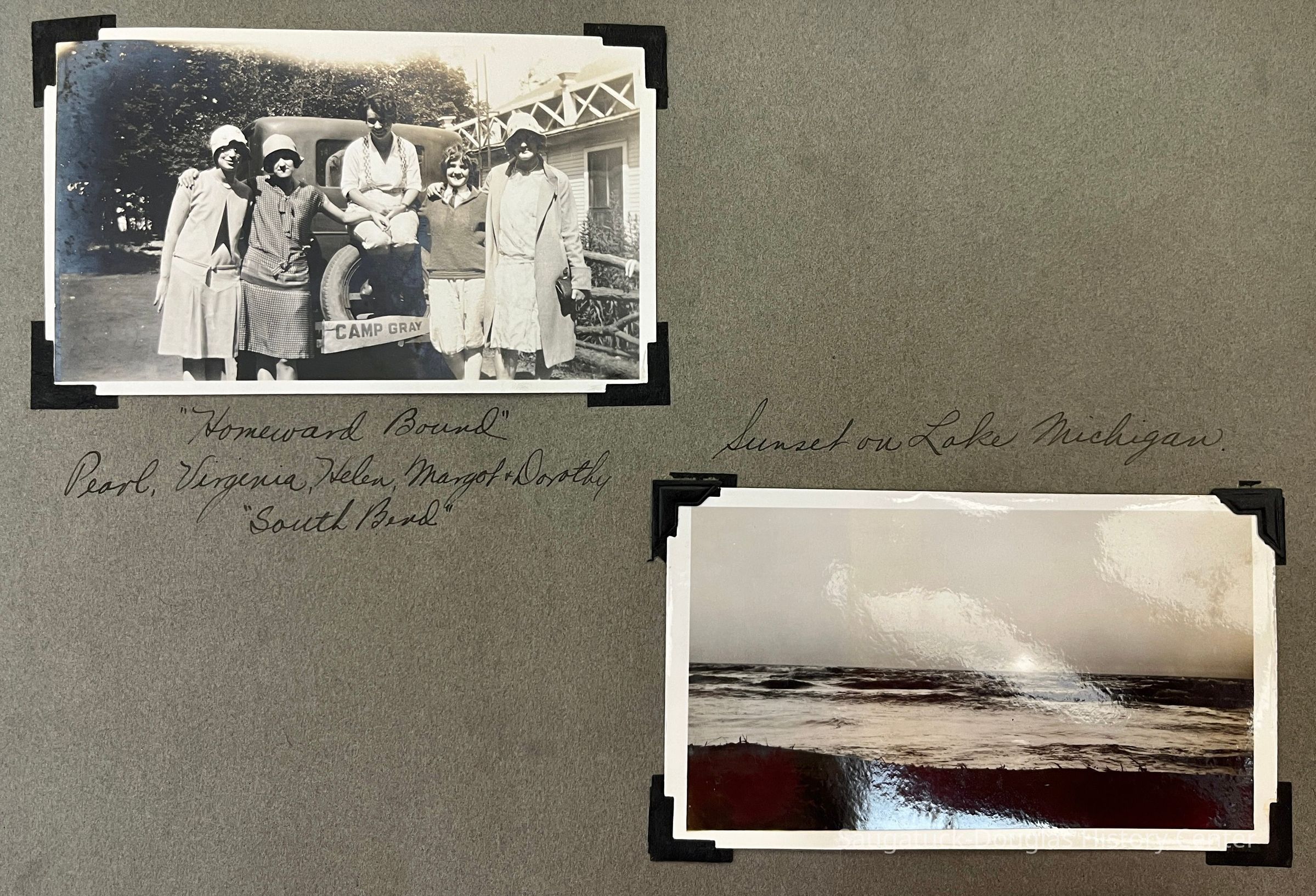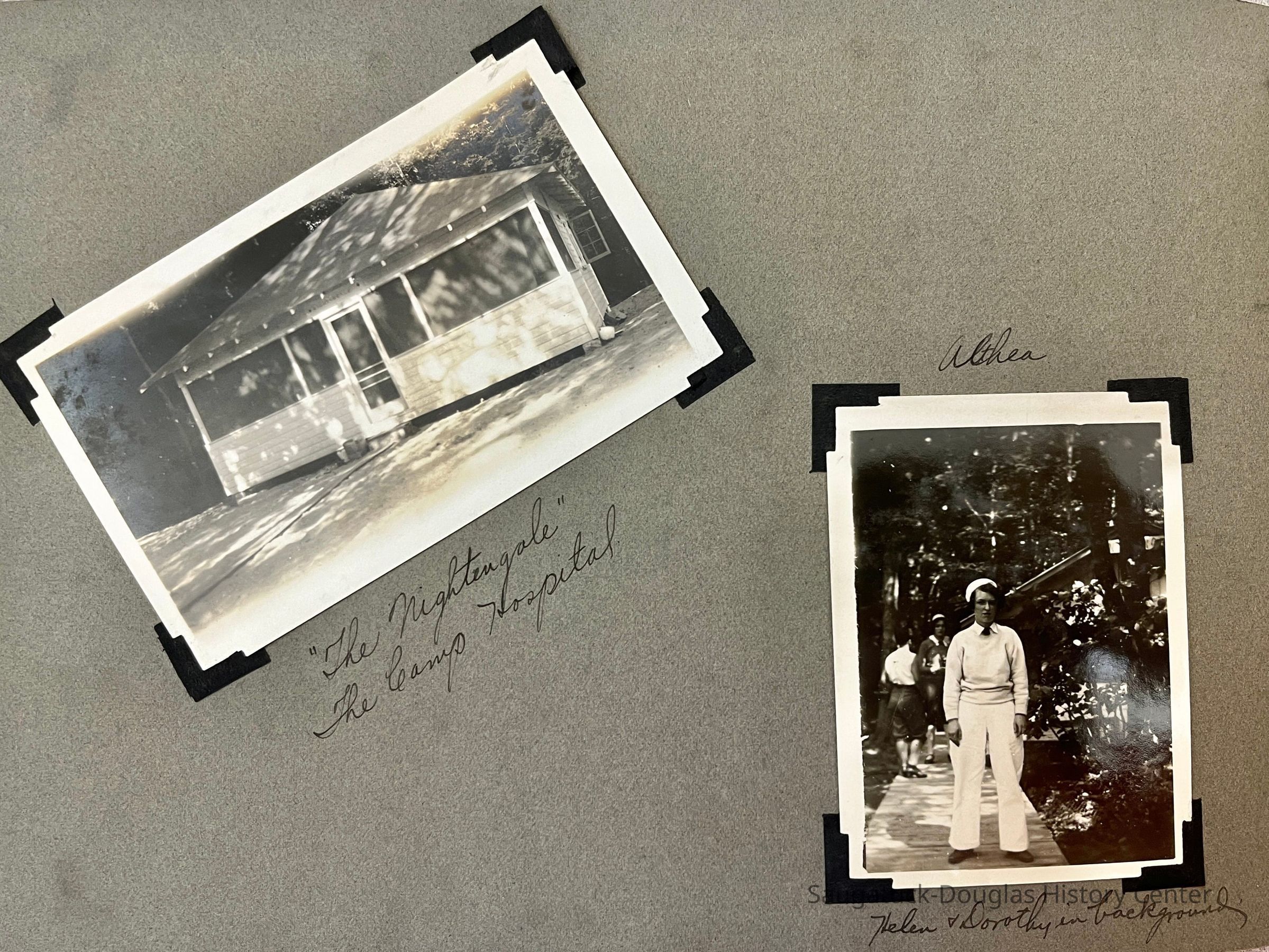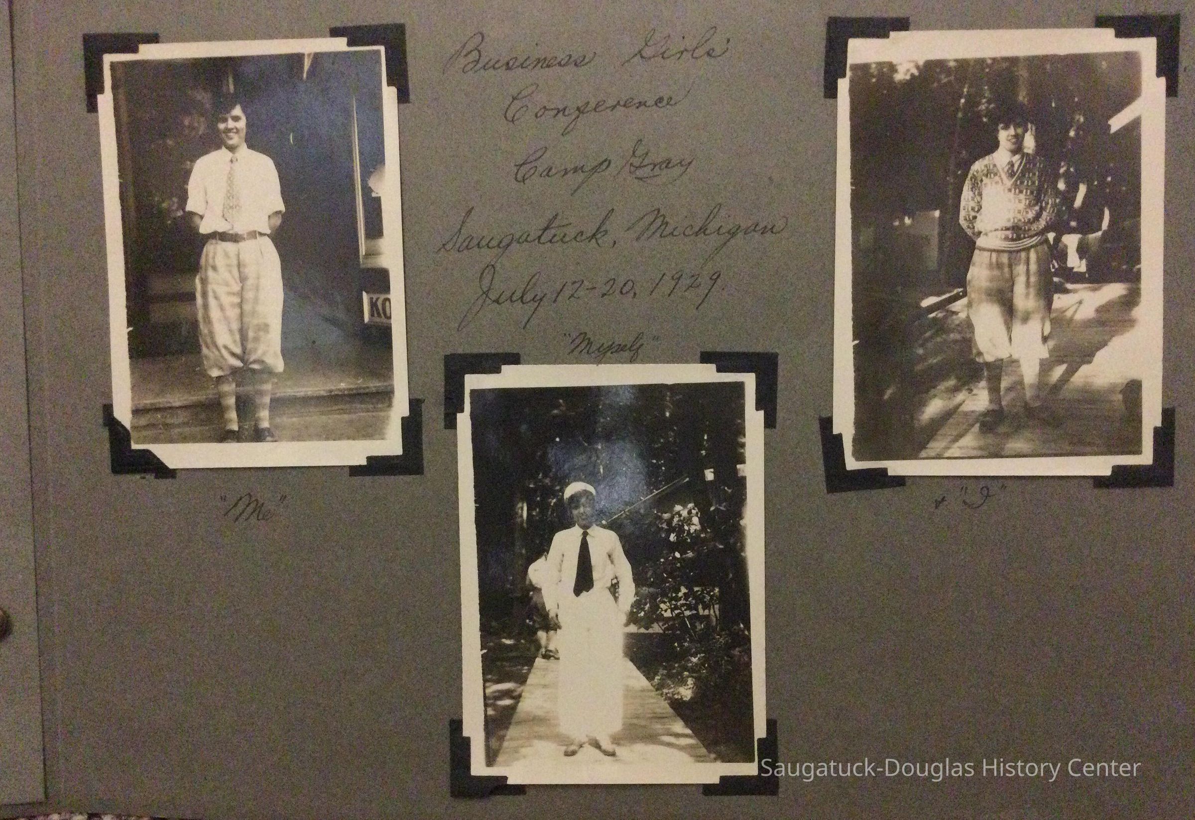 Photo album of 50 photographs taken during the week Mildred Reece Lintner was at Camp Gray. The gray paper 16-page album has no cover and is bound with brass brads. The first page has the handwritten title "Business Girls Conference Camp Gray ... July 12-20, 1929" and three photos captioned Me, Myself and I.
