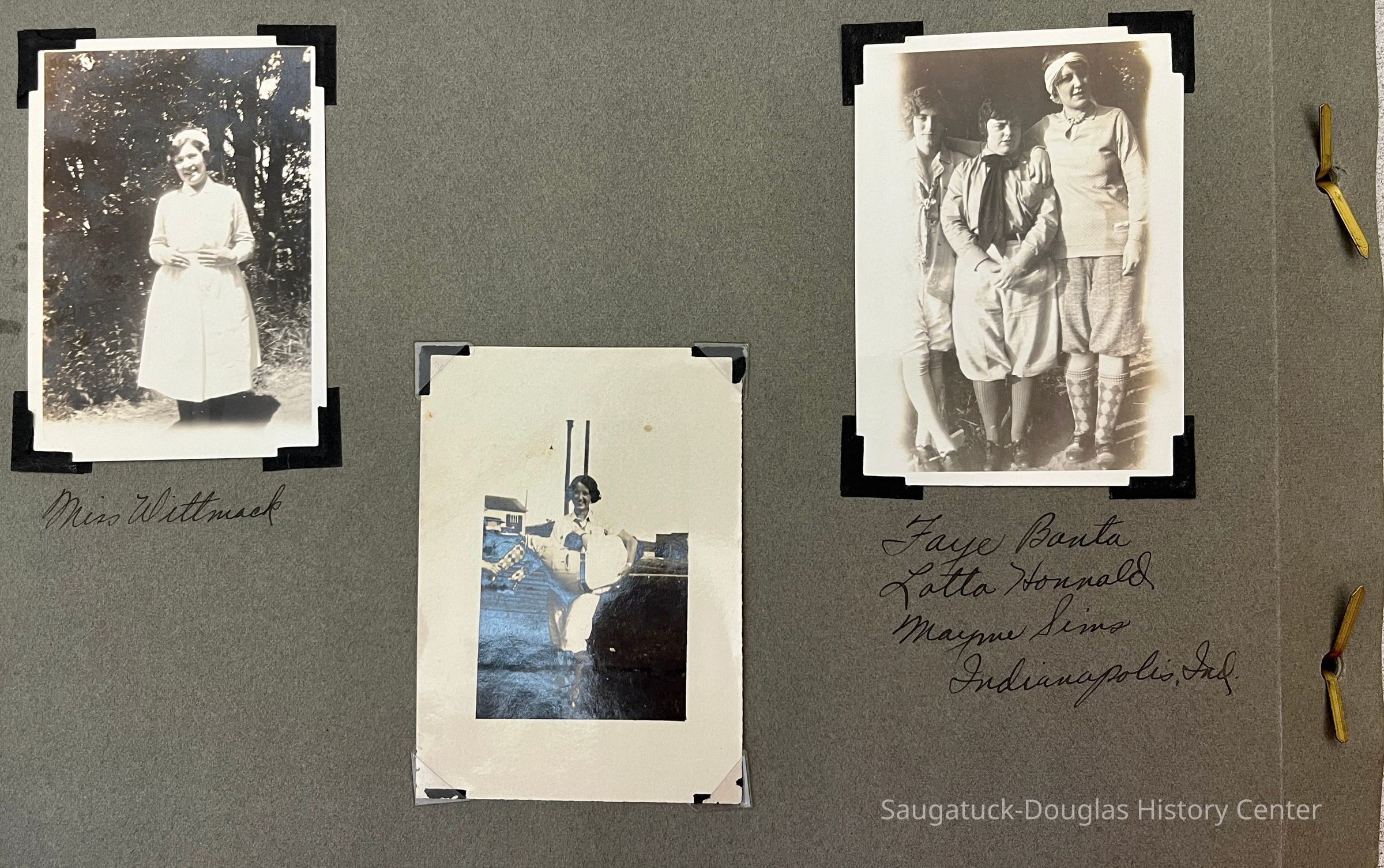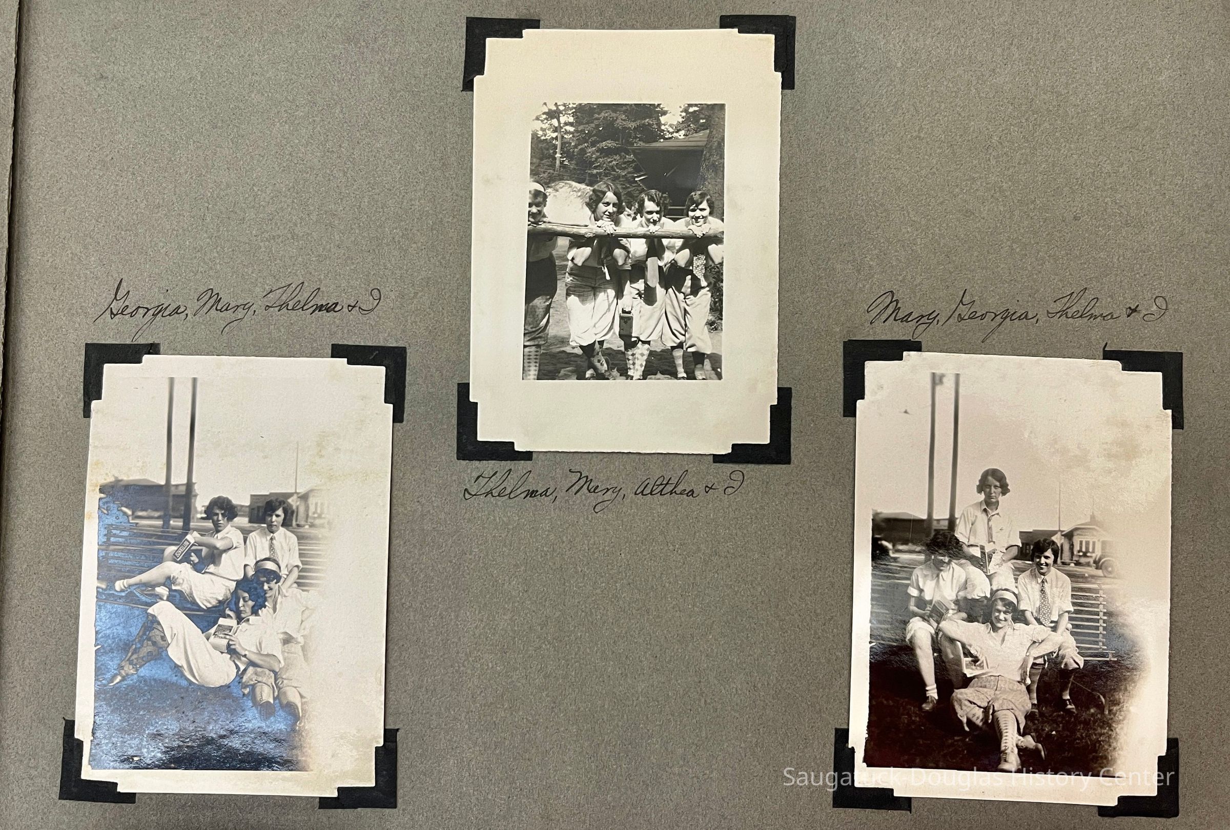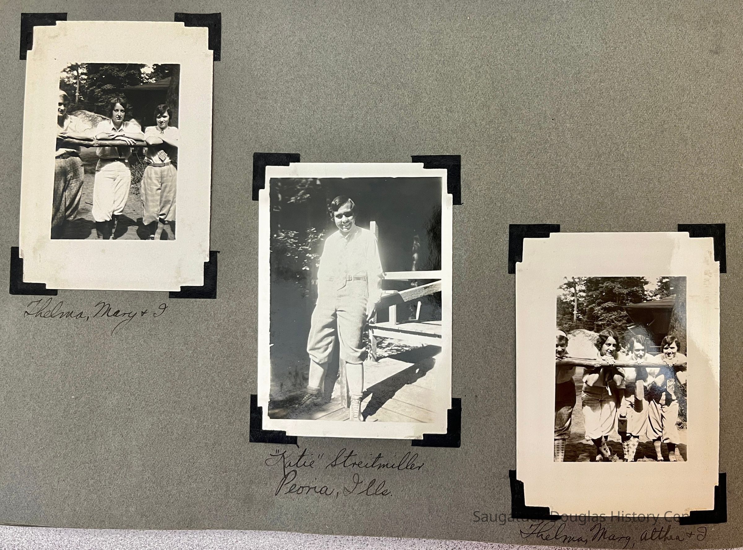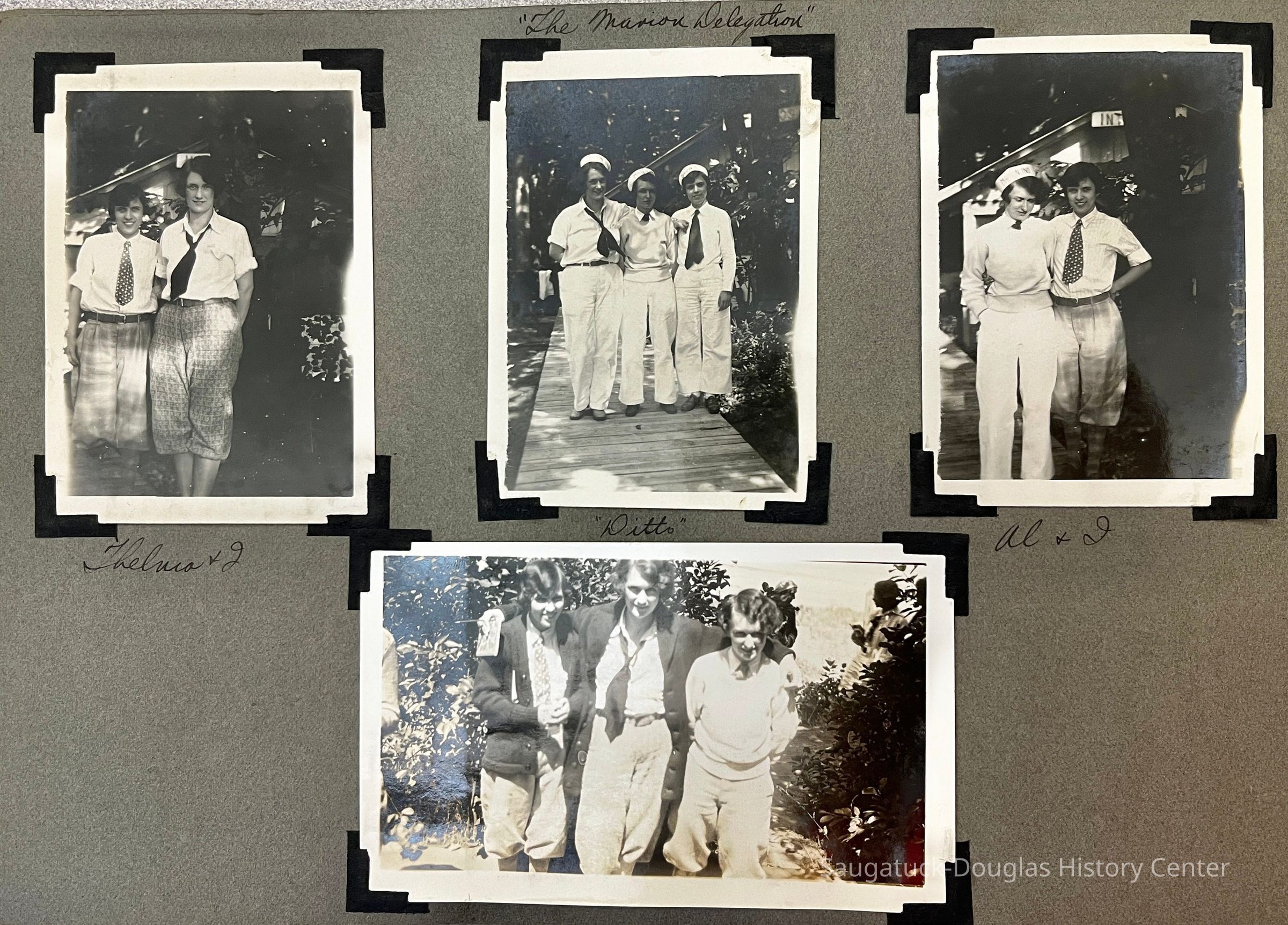 Photo album of 50 photographs taken during the week Mildred Reece Lintner was at Camp Gray. The gray paper 16-page album has no cover and is bound with brass brads. The first page has the handwritten title "Business Girls Conference Camp Gray ... July 12-20, 1929" and three photos captioned Me, Myself and I.