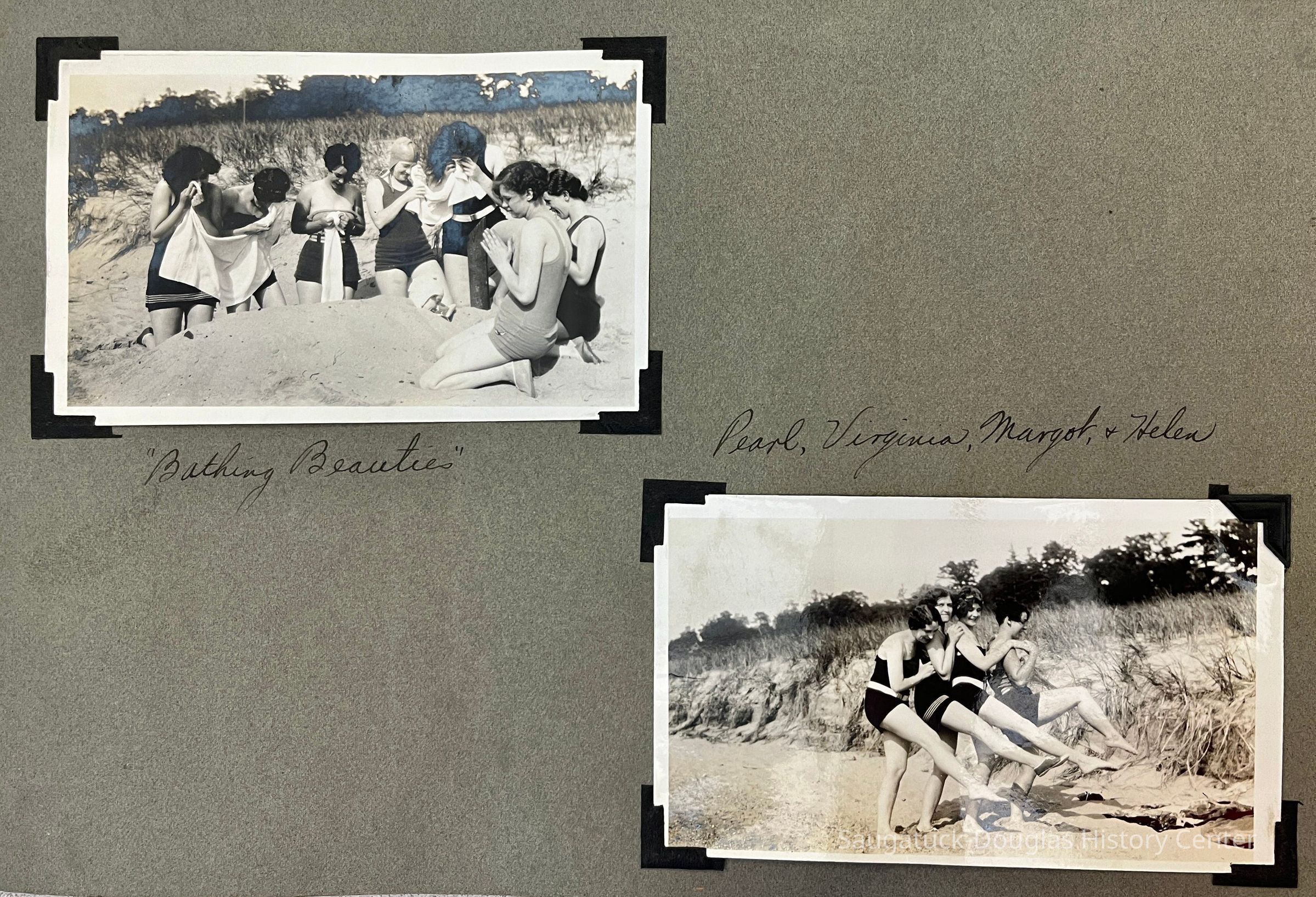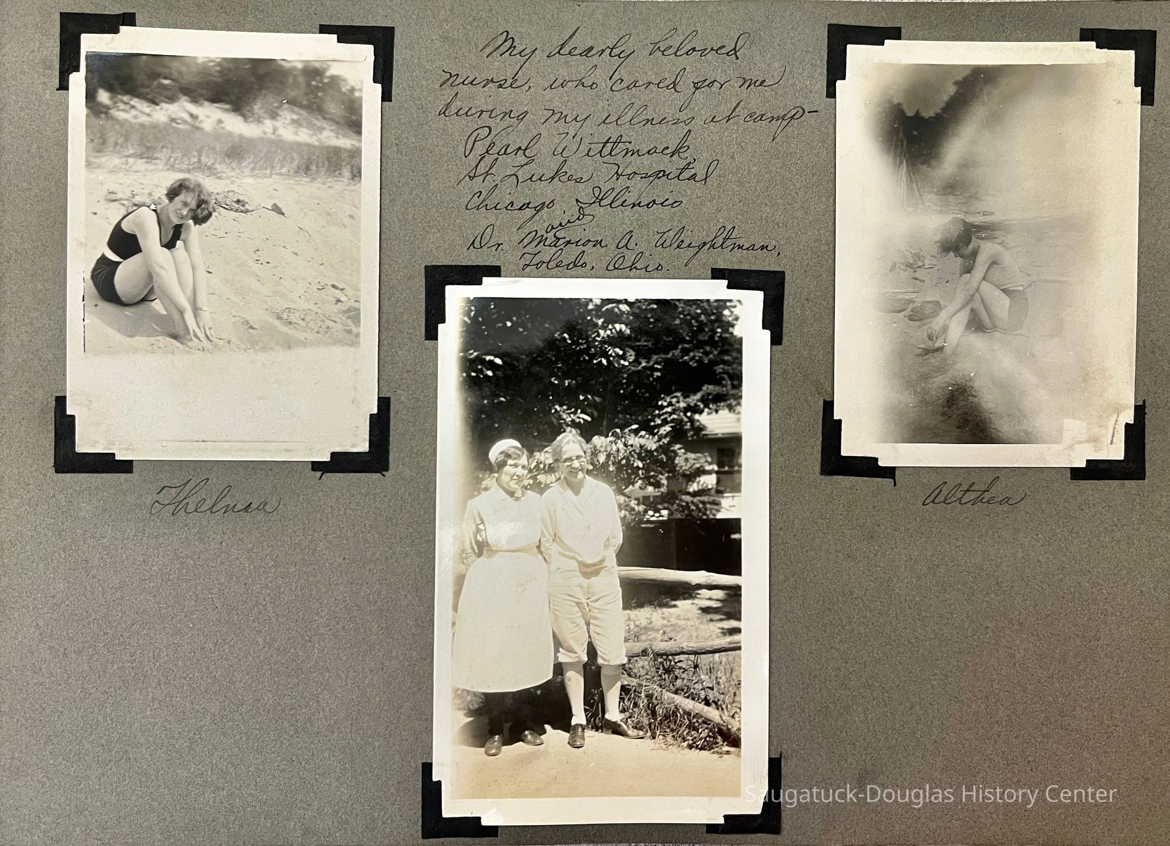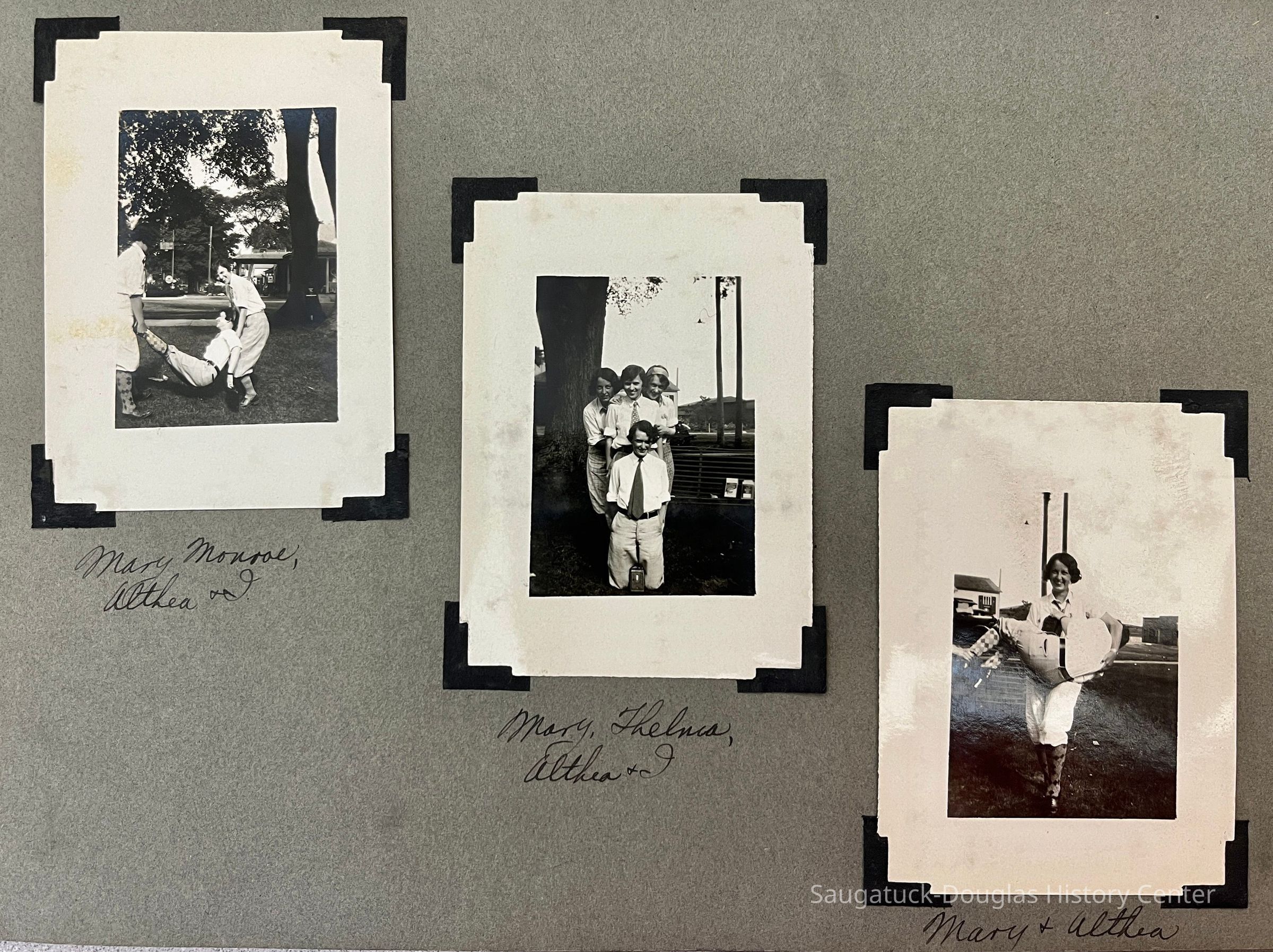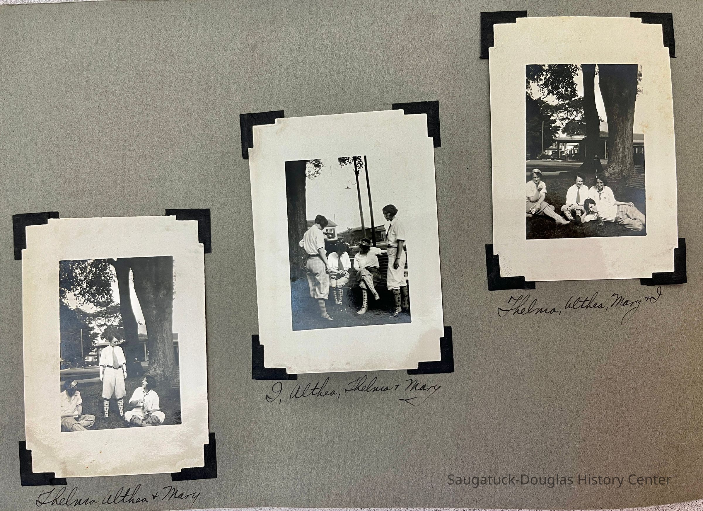 Photo album of 50 photographs taken during the week Mildred Reece Lintner was at Camp Gray. The gray paper 16-page album has no cover and is bound with brass brads. The first page has the handwritten title "Business Girls Conference Camp Gray ... July 12-20, 1929" and three photos captioned Me, Myself and I.
