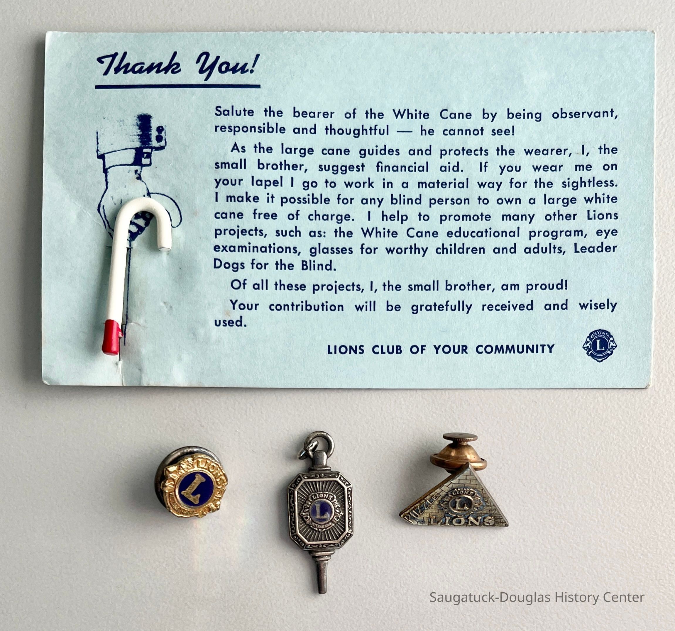 Three metal Lions club lapel pins, a pendant, a plastic White Cane pin and six White Cane pins attached to blue cards.Context