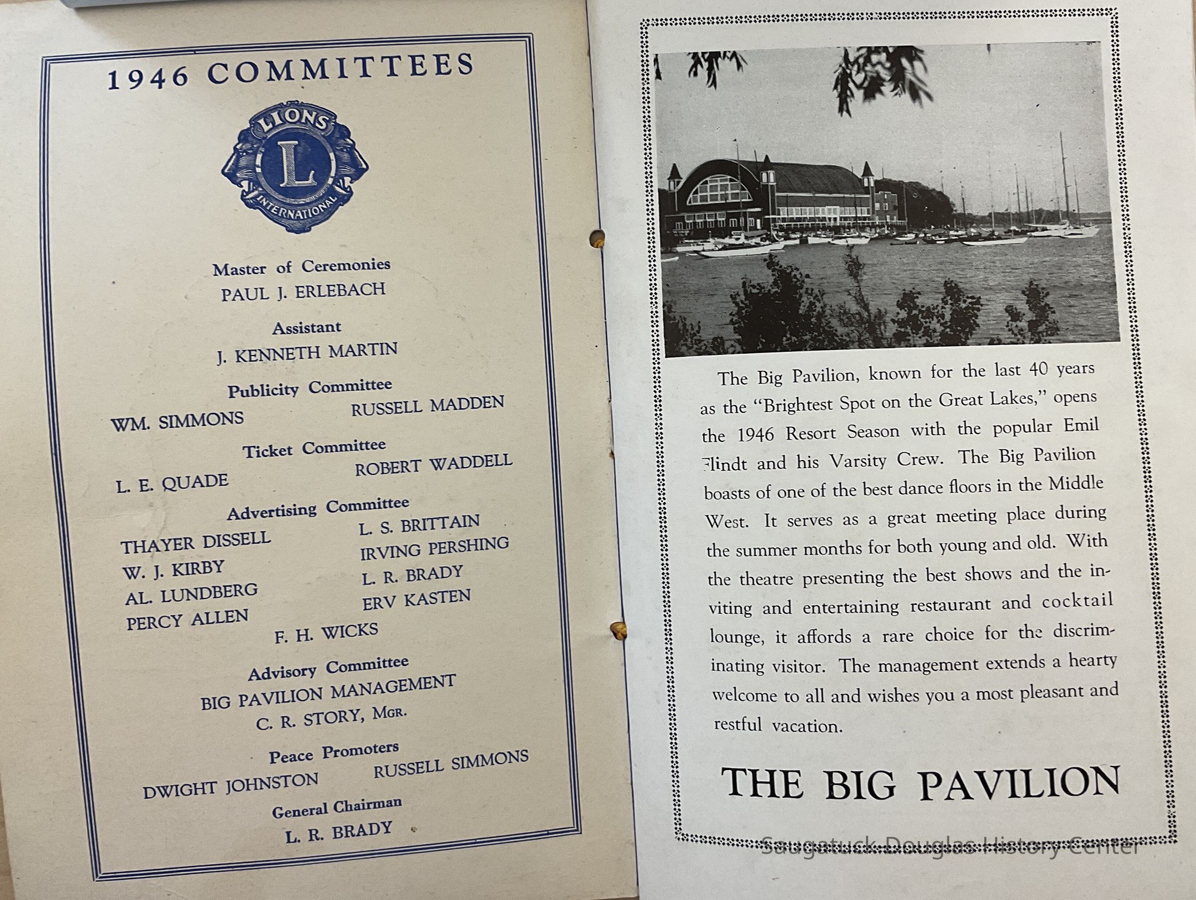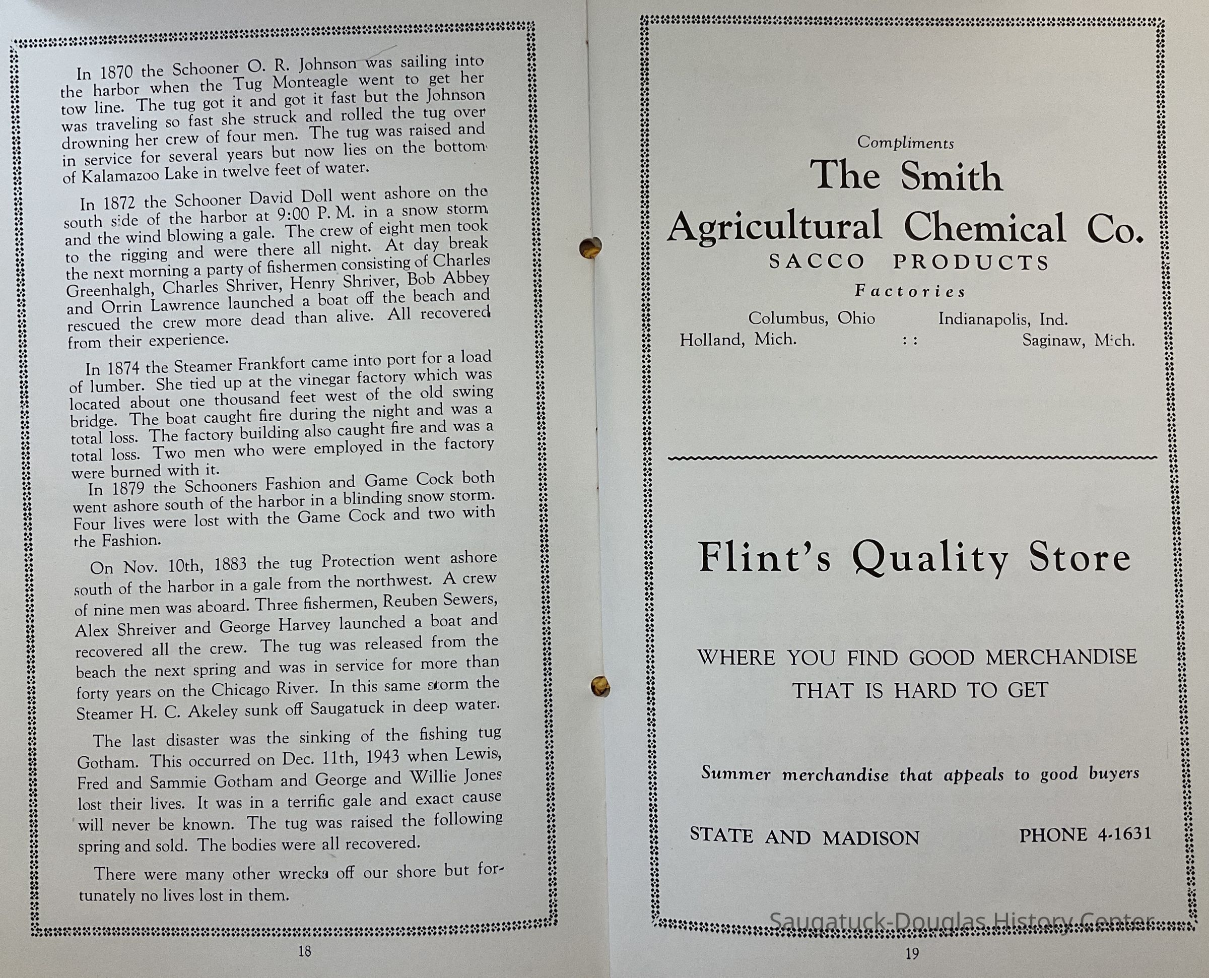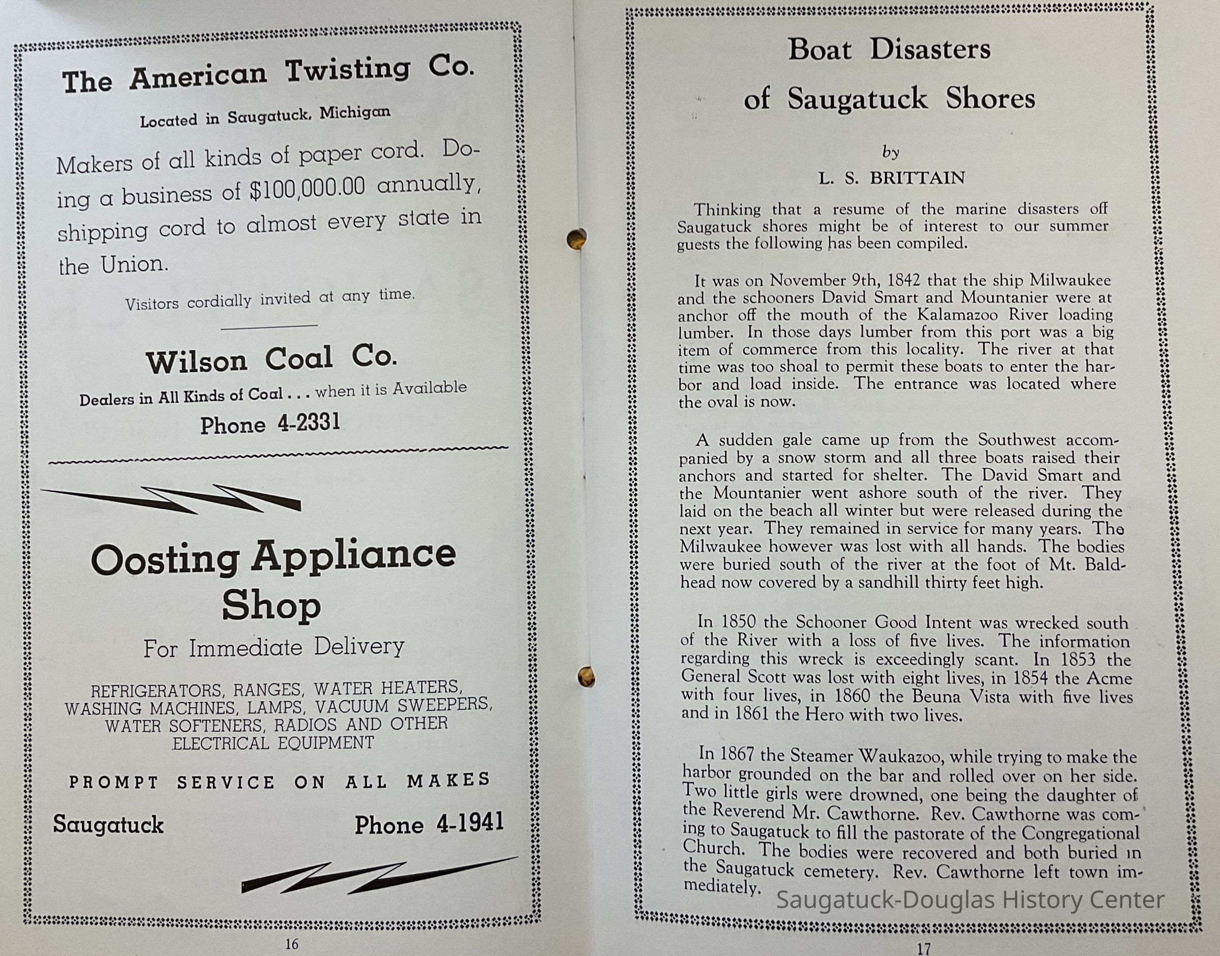 1946 directory of the Saugatuck Douglas Lion's Club. It is made to serve as a souvenir for visitors to the area. it contains a brief history, of the area, history of boat disasters and advertisements of area businesses. (Pages 17-18 include an article written by L. S. Brittain: “Boat Disasters of Saugatuck Shores”.)