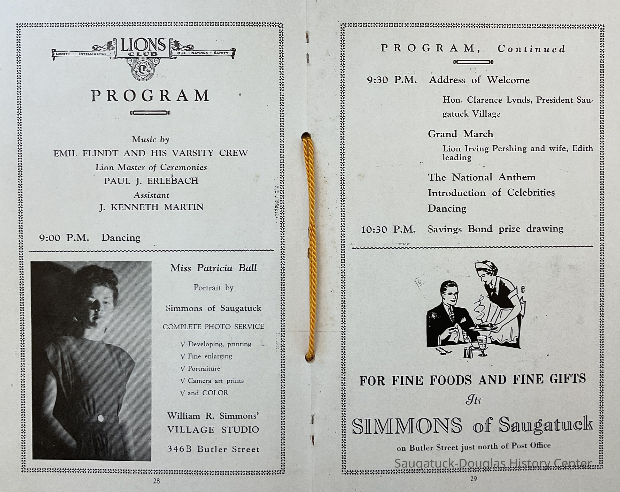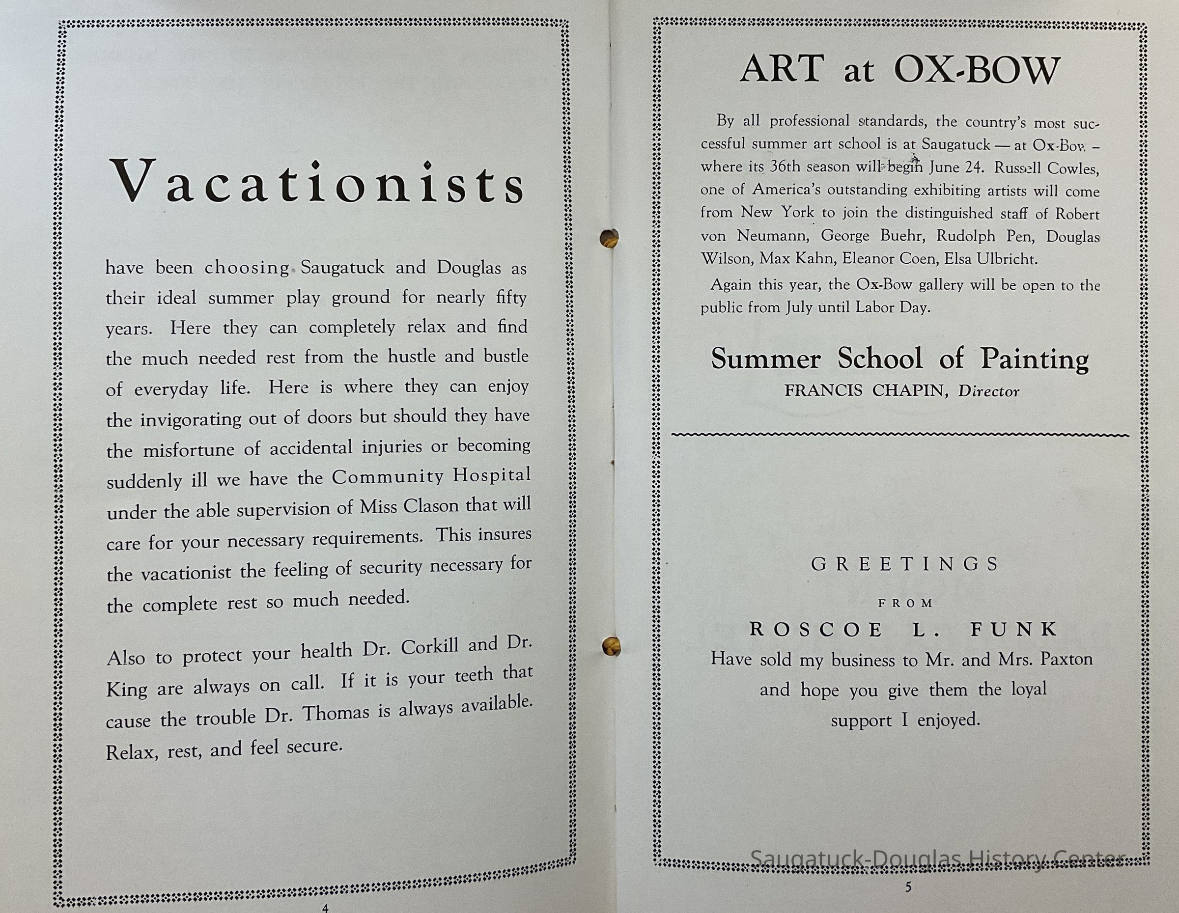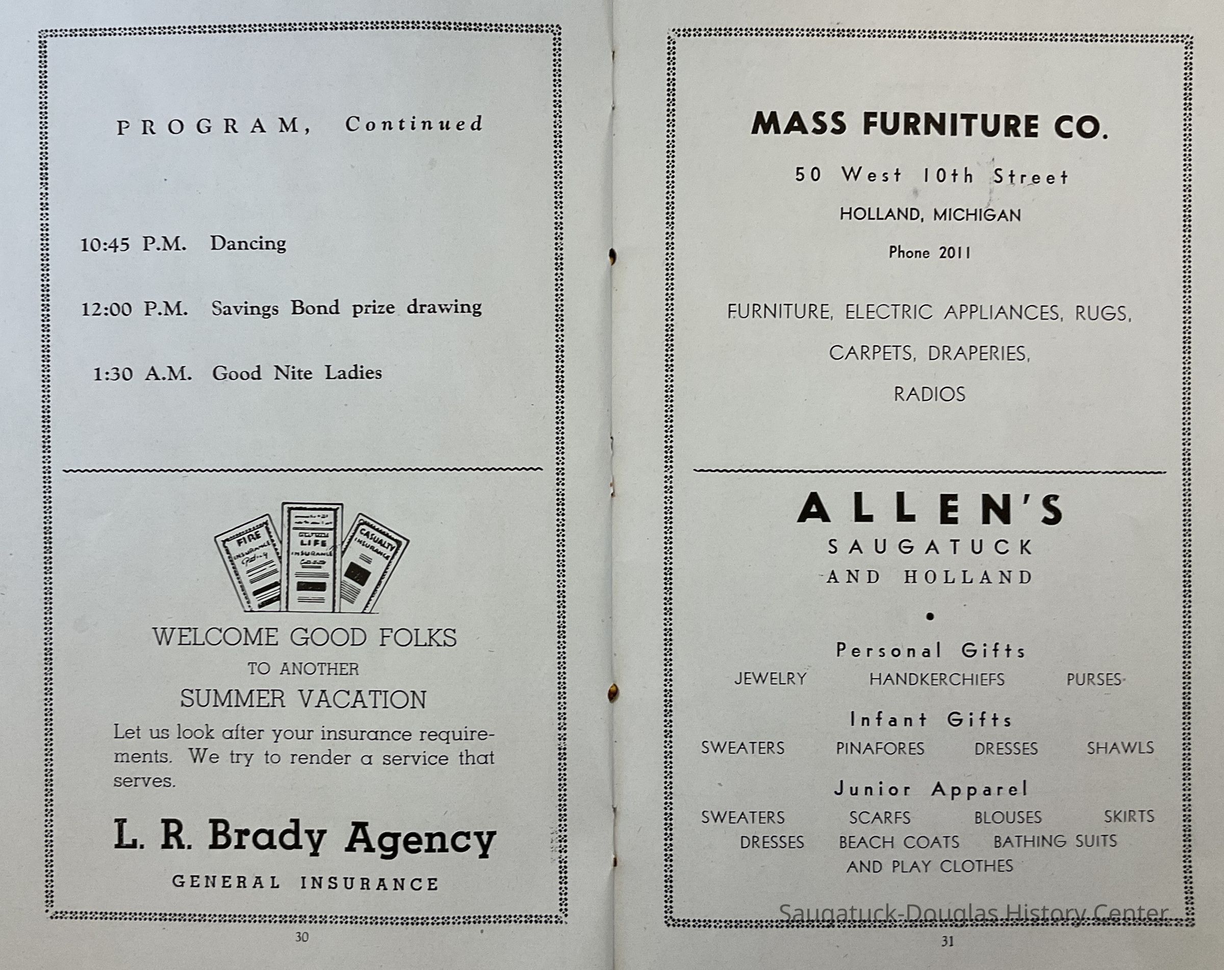 1946 directory of the Saugatuck Douglas Lion's Club. It is made to serve as a souvenir for visitors to the area. it contains a brief history, of the area, history of boat disasters and advertisements of area businesses. (Pages 17-18 include an article written by L. S. Brittain: “Boat Disasters of Saugatuck Shores”.)