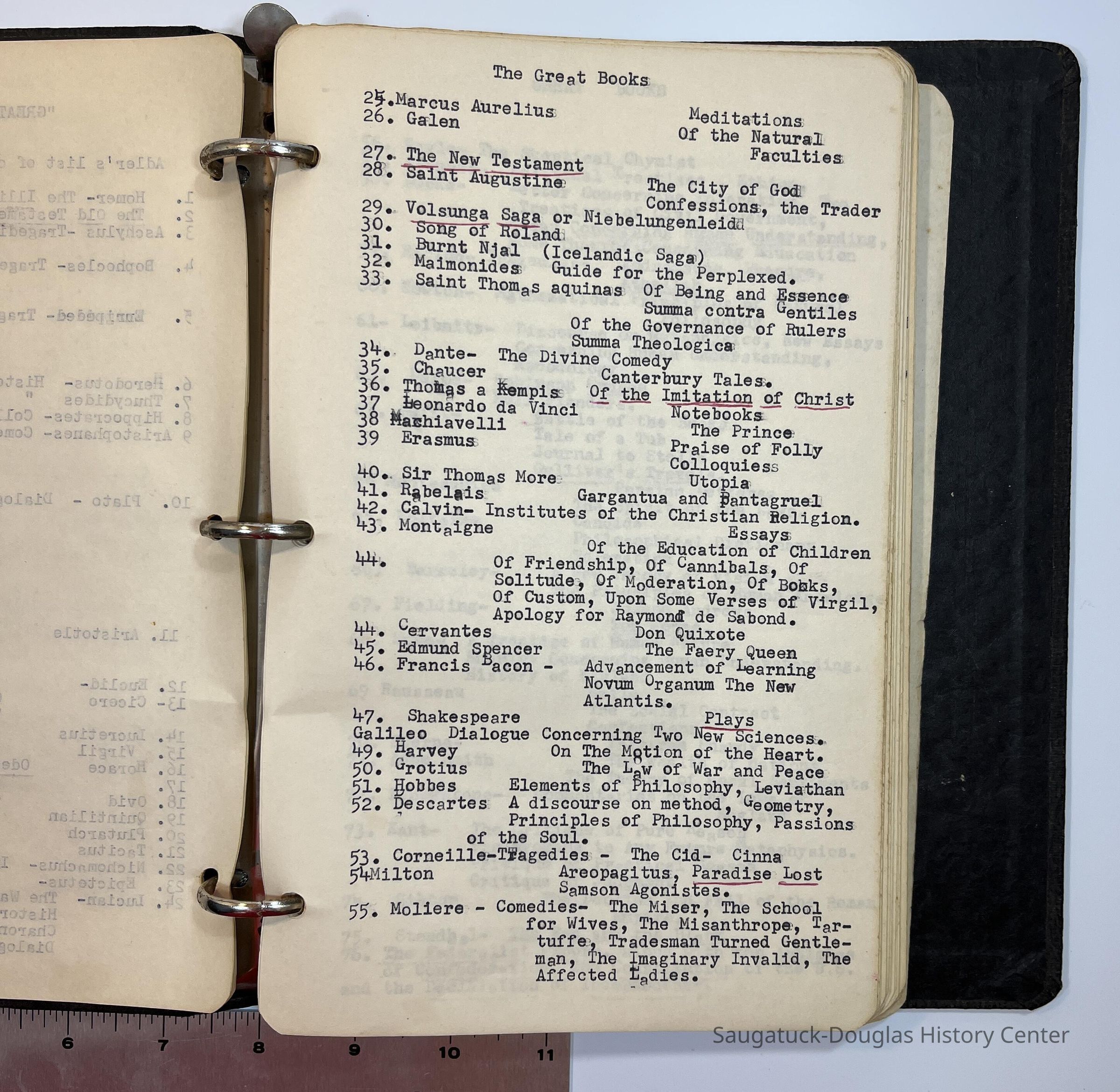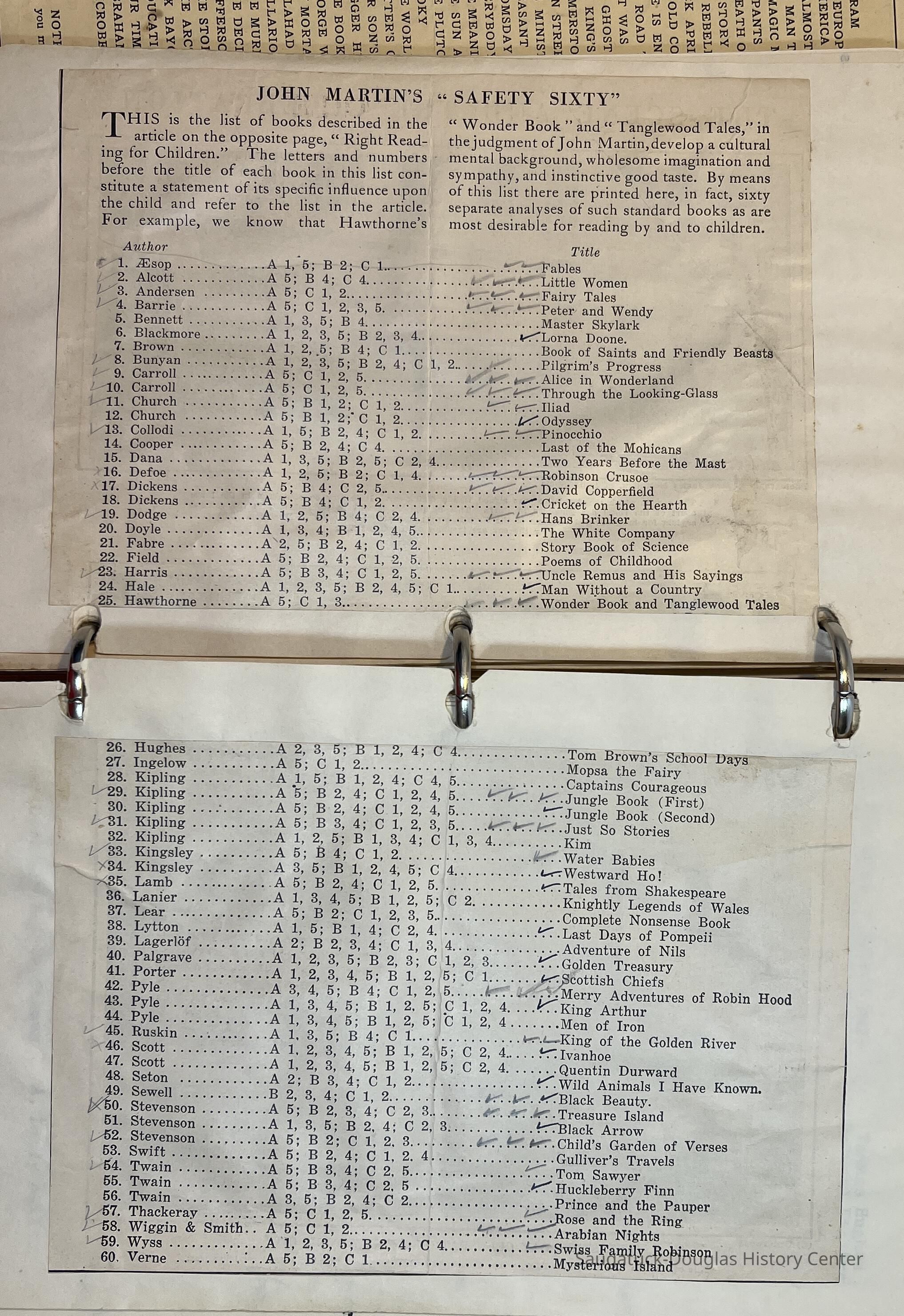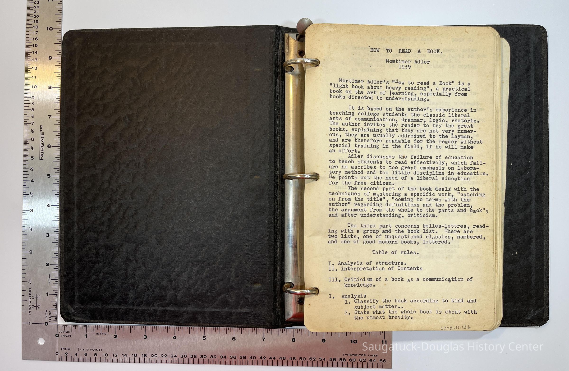 Binder one is book-lovers notes with lists of "great books," critic- recommended and top books from the 1940s to 1950s.