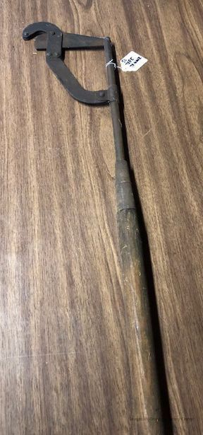 Metal tree-trimming apparatus mounted on a long, wooden pole.Context