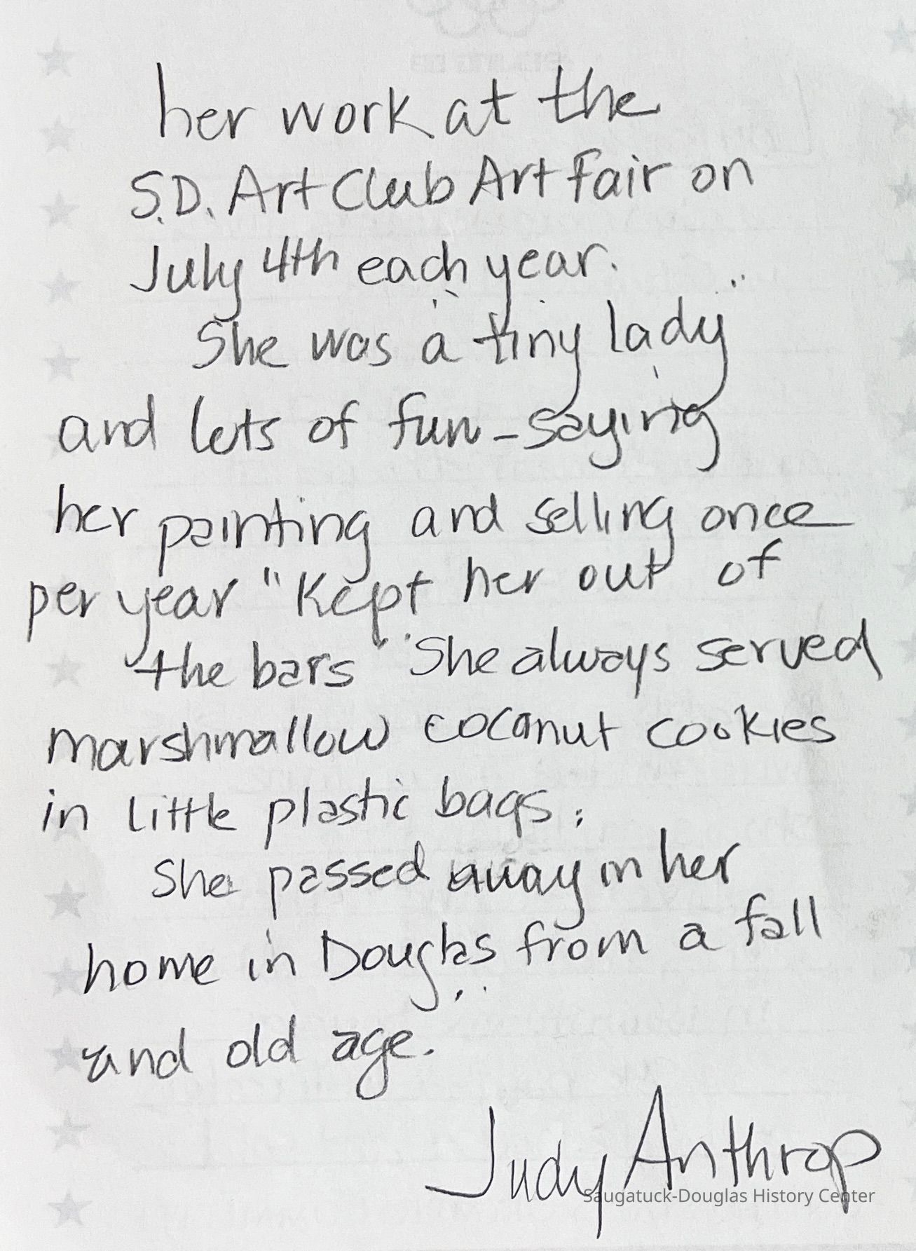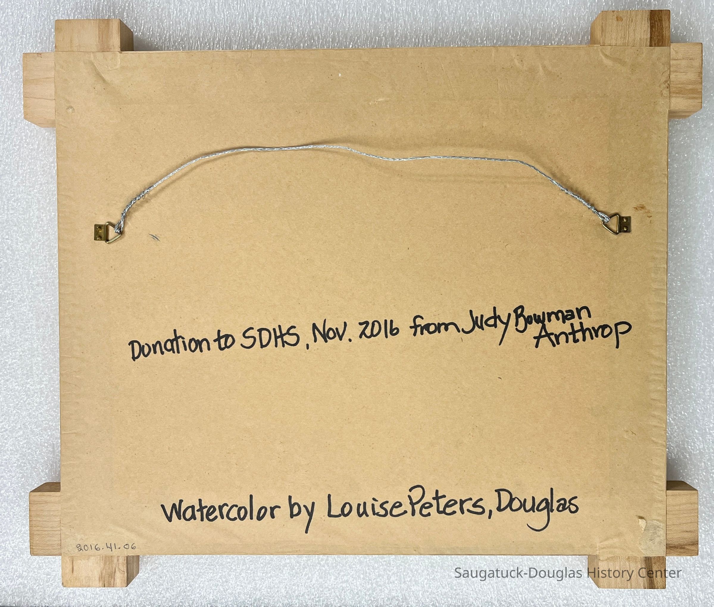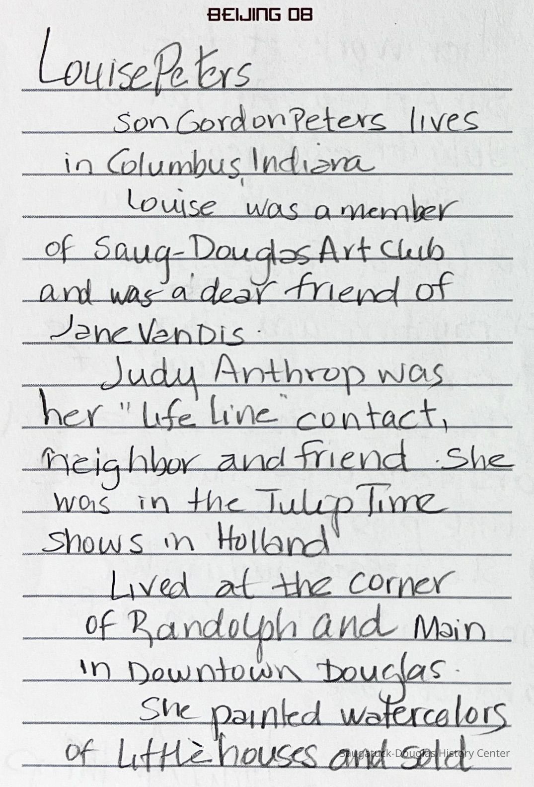 Louise Peters was a member of the Saugatuck-Douglas Art Club and was a dear friend of Jane Van Dis. Judy Anthrop was her 'lifeline" contact, neighbor and friend.