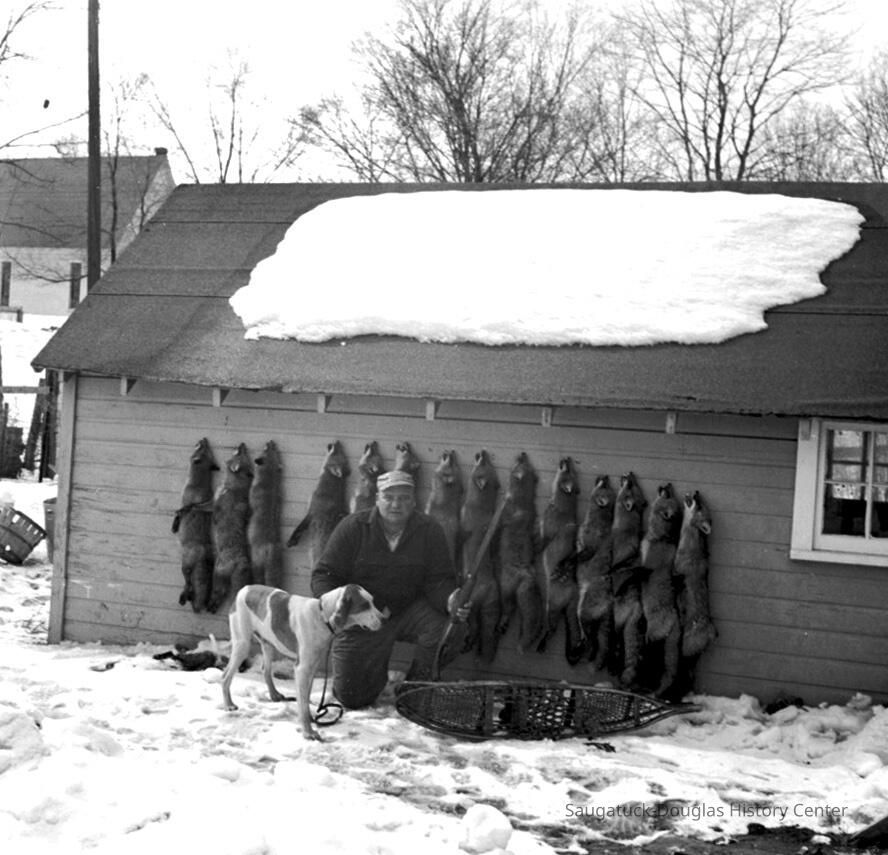 Lloyd Engel kneeling with his hunting dog and a rifle in front of a building with fourteen fox bodies hanging from the wall.