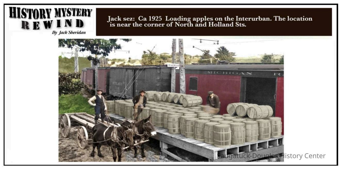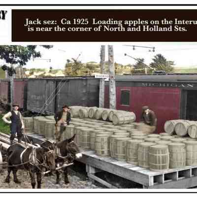 According to Jack Sheridan, a very similar image is described as circa 1925, loading apples on the Interurban. The location is near the corner of North and Holland streets.Collection