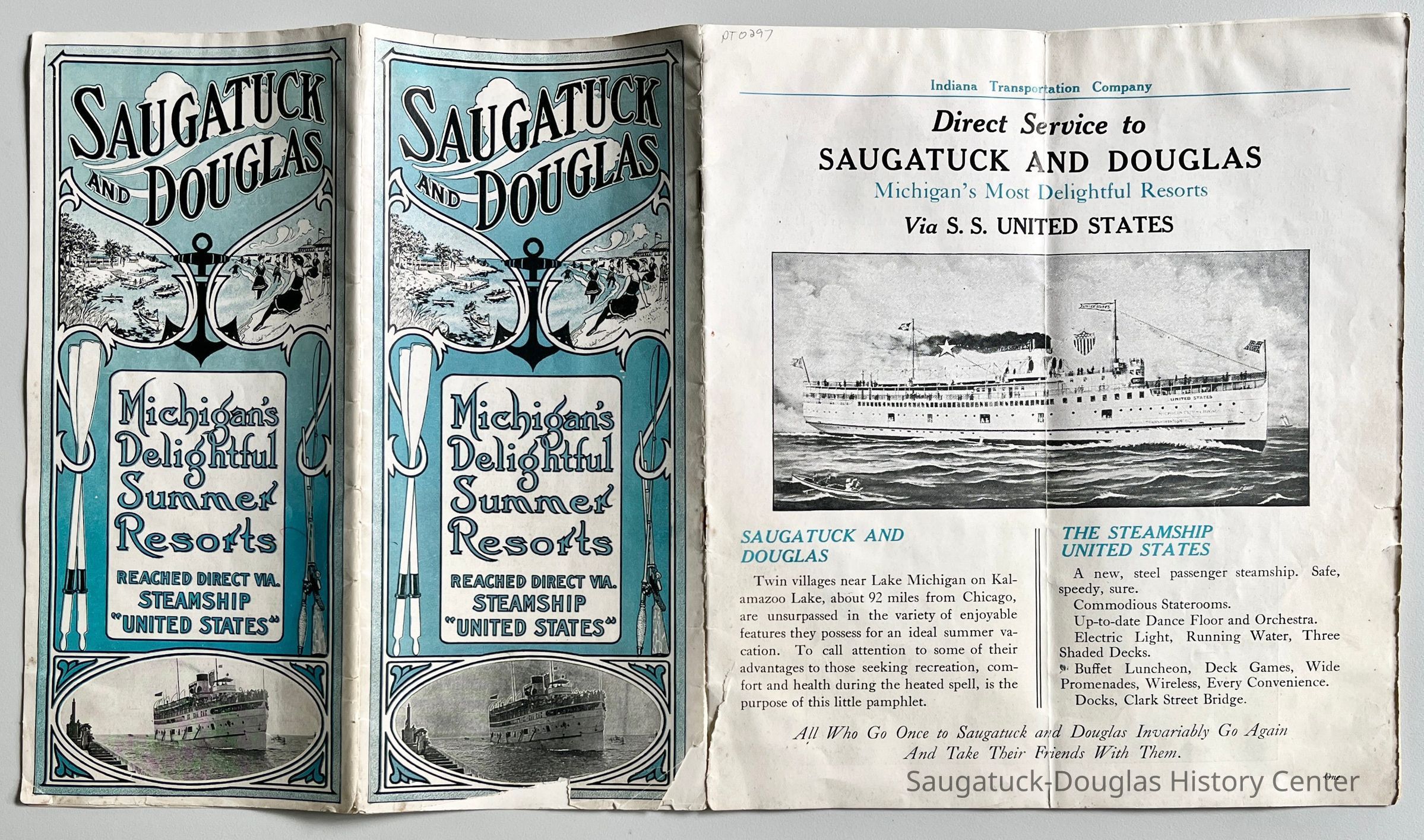 "Saugatuck and Douglas Michigan's Delightful Summer Resorts reached direct via steamship United States" 1915 Indiana Transportation Company brochure (2nd copy in Archive collection)Context