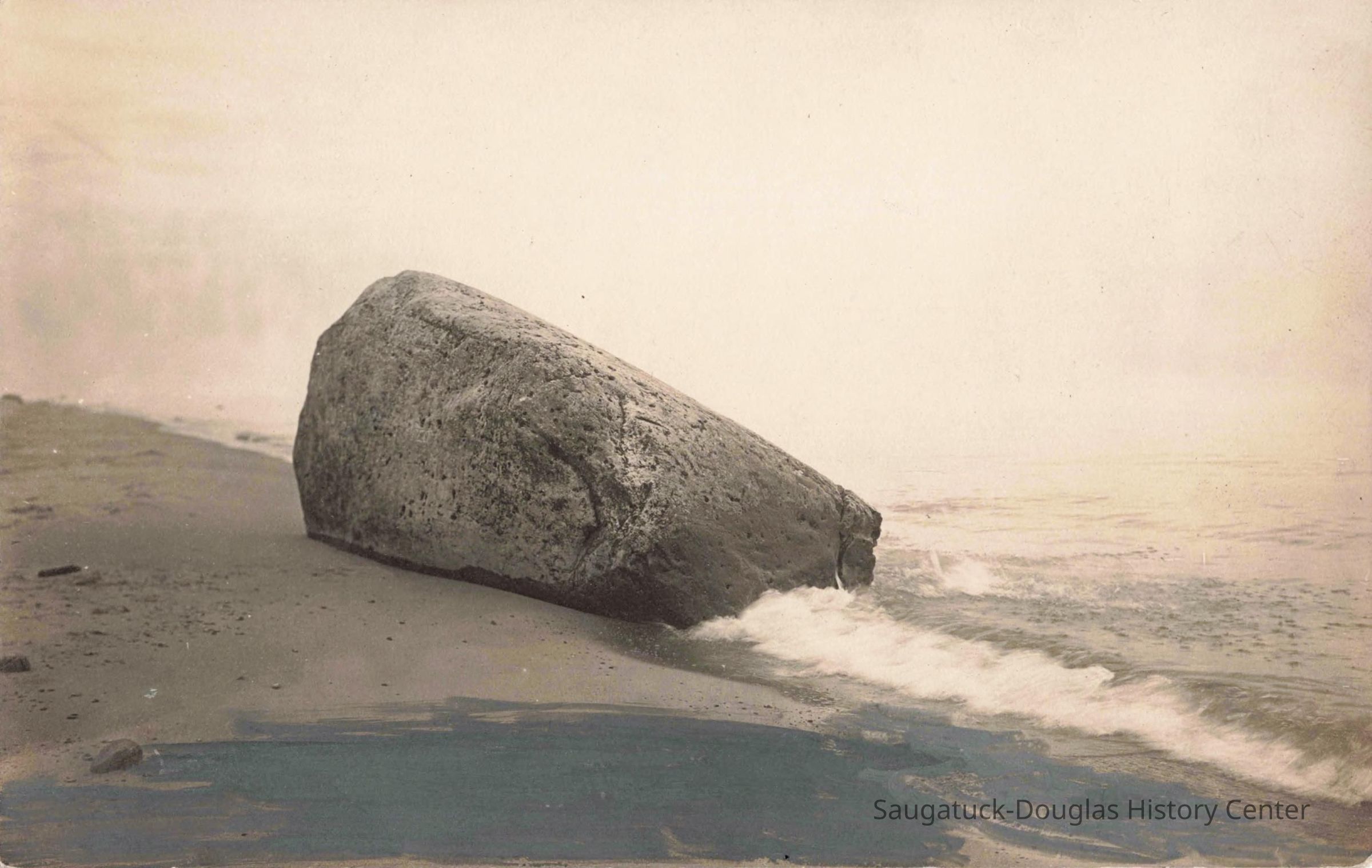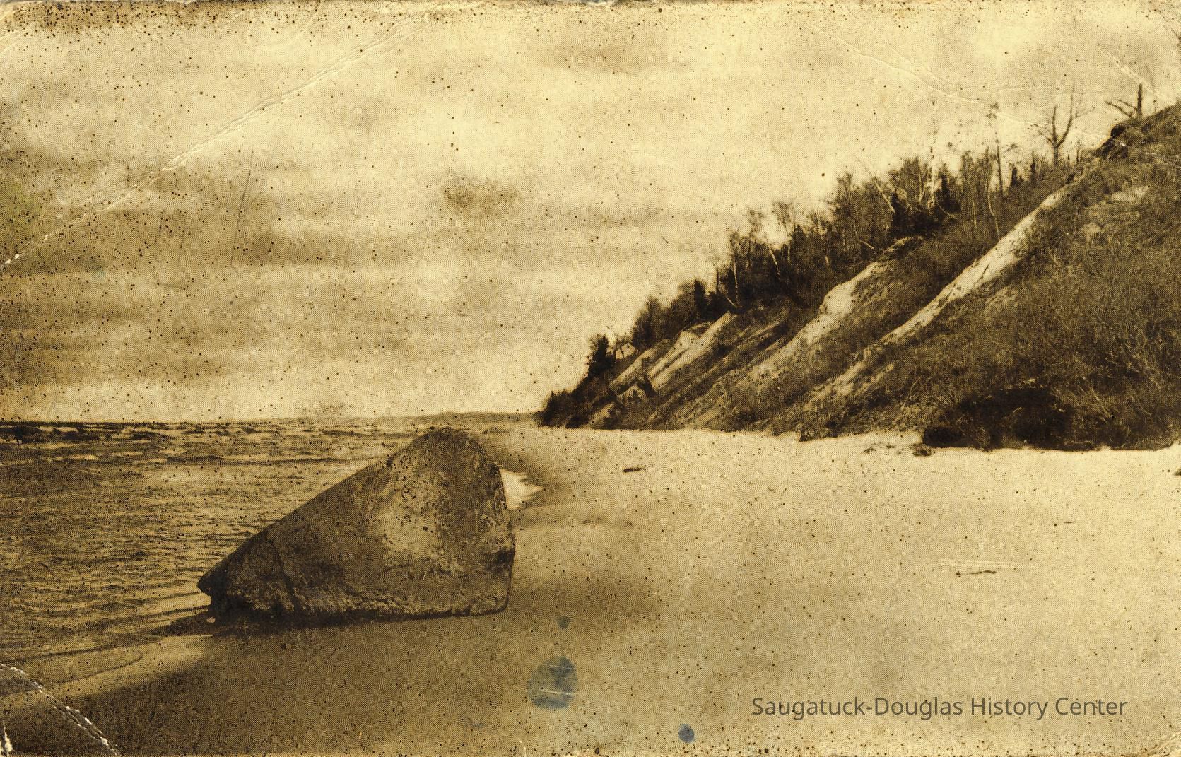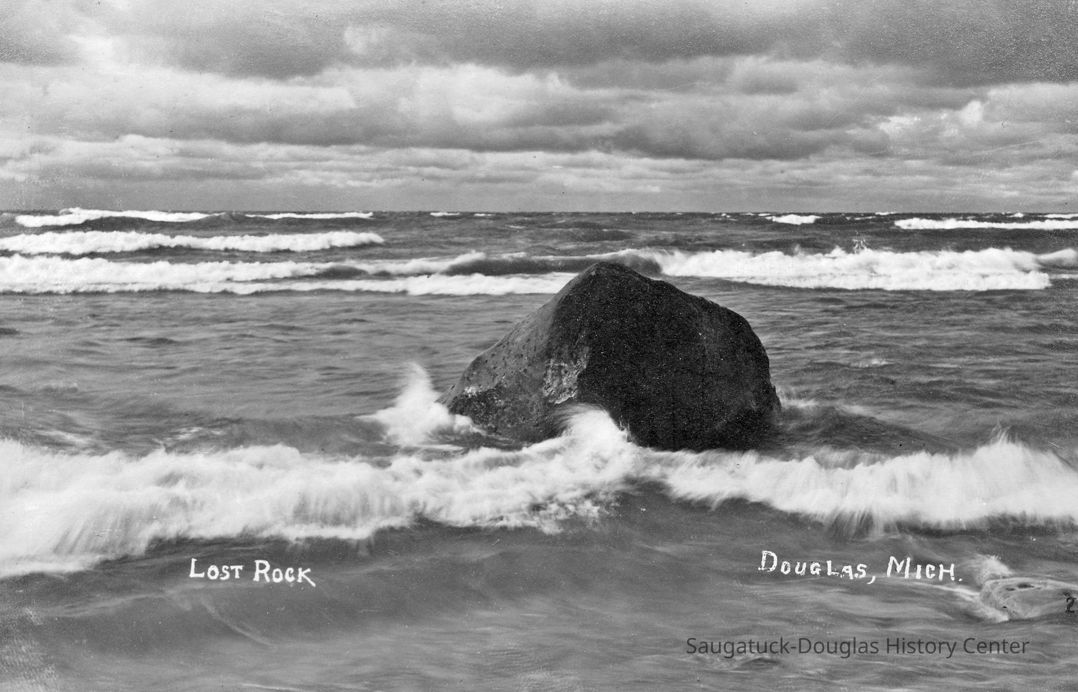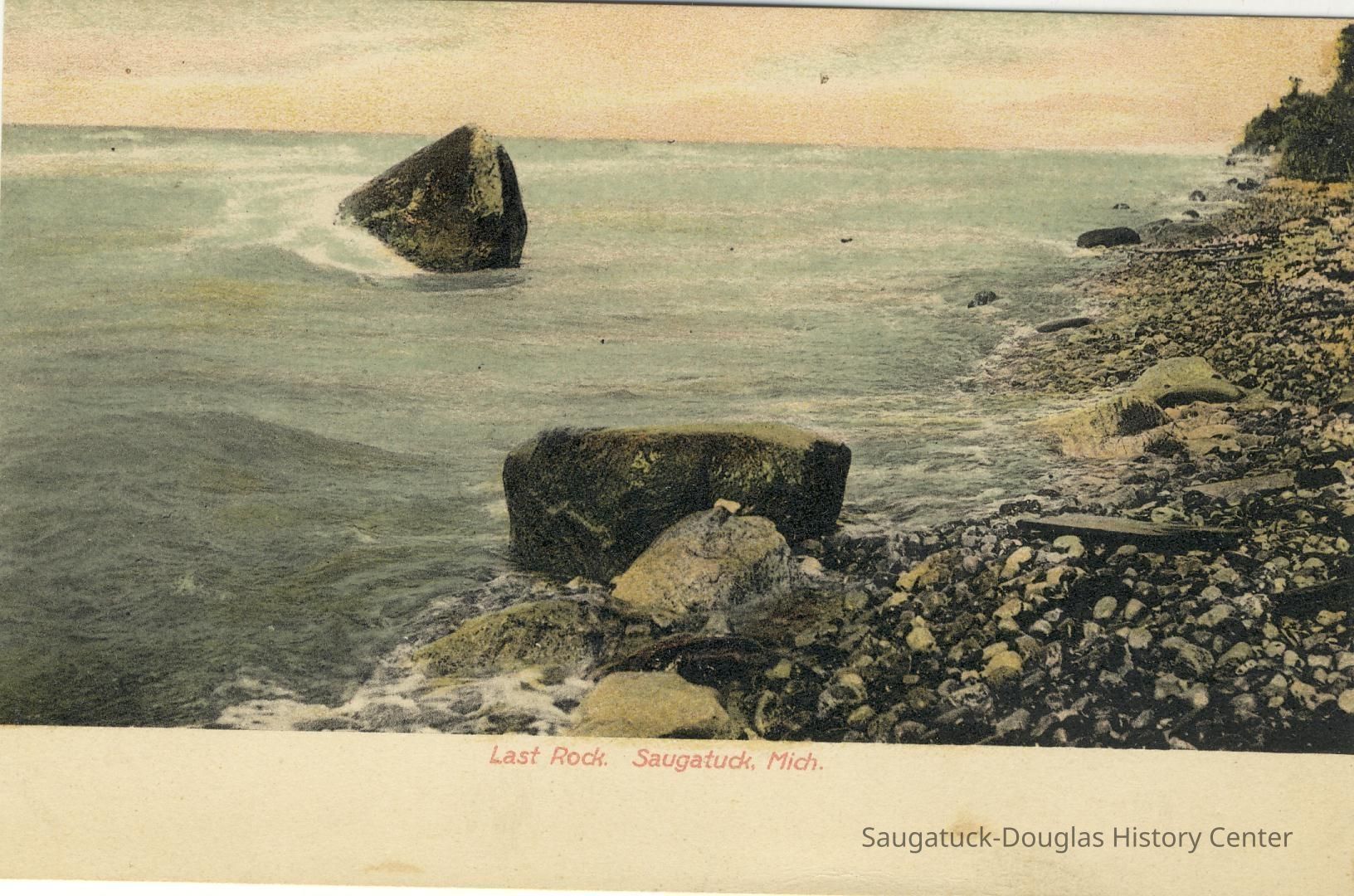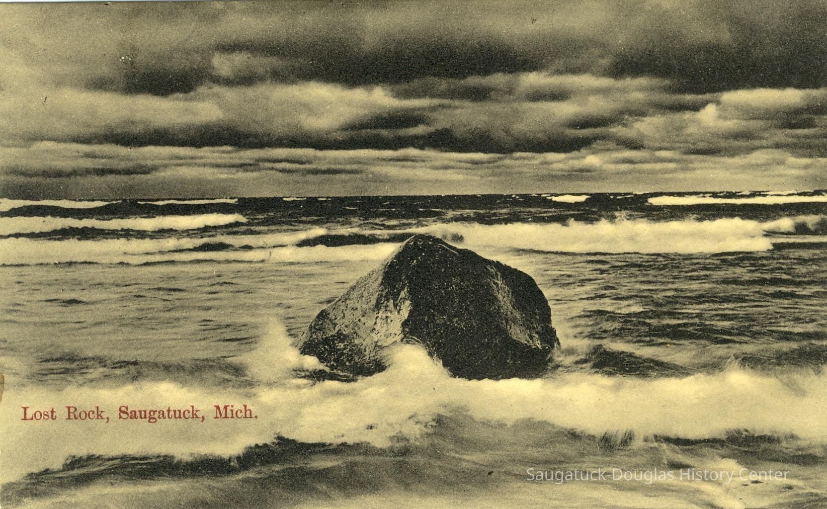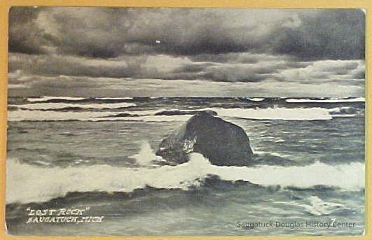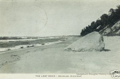 Most feature very large rock, etched with initials and graffiti, that sits on the beach with Lake Michigan in the background. This is the famous "Lost Rock" or "Last Rock" that appears and disappears as lake levels rise and fall and the contours of the beach shift. It is possible multiple rocks that have appeared south of the Douglas Beach have worn the Lost Rock title.