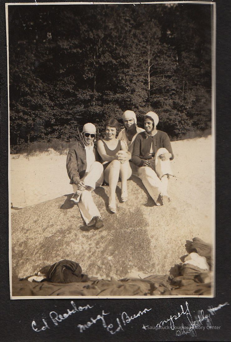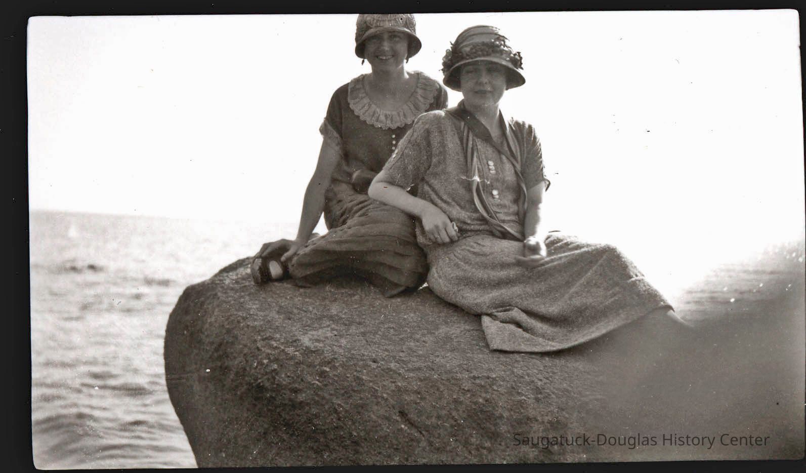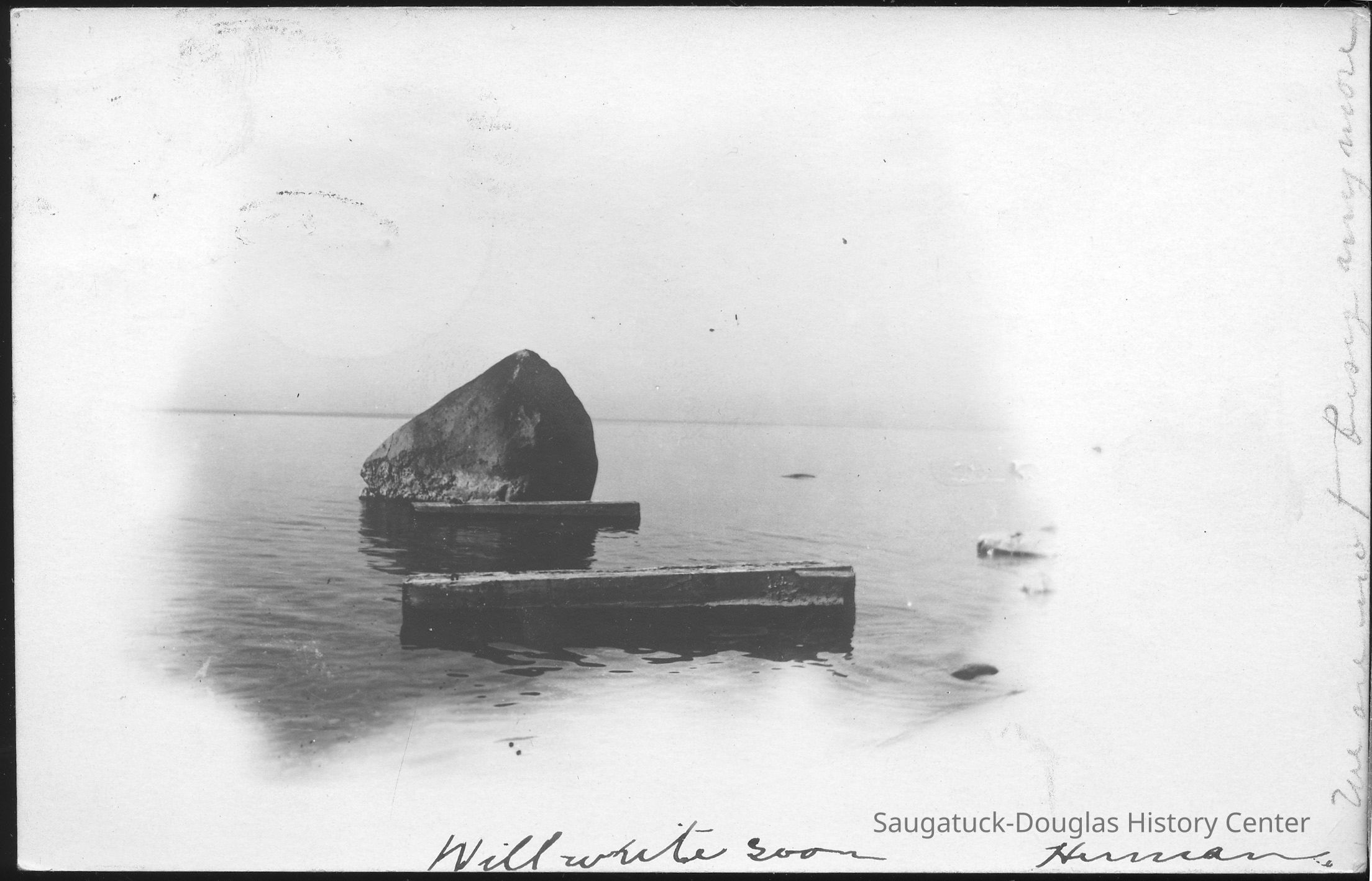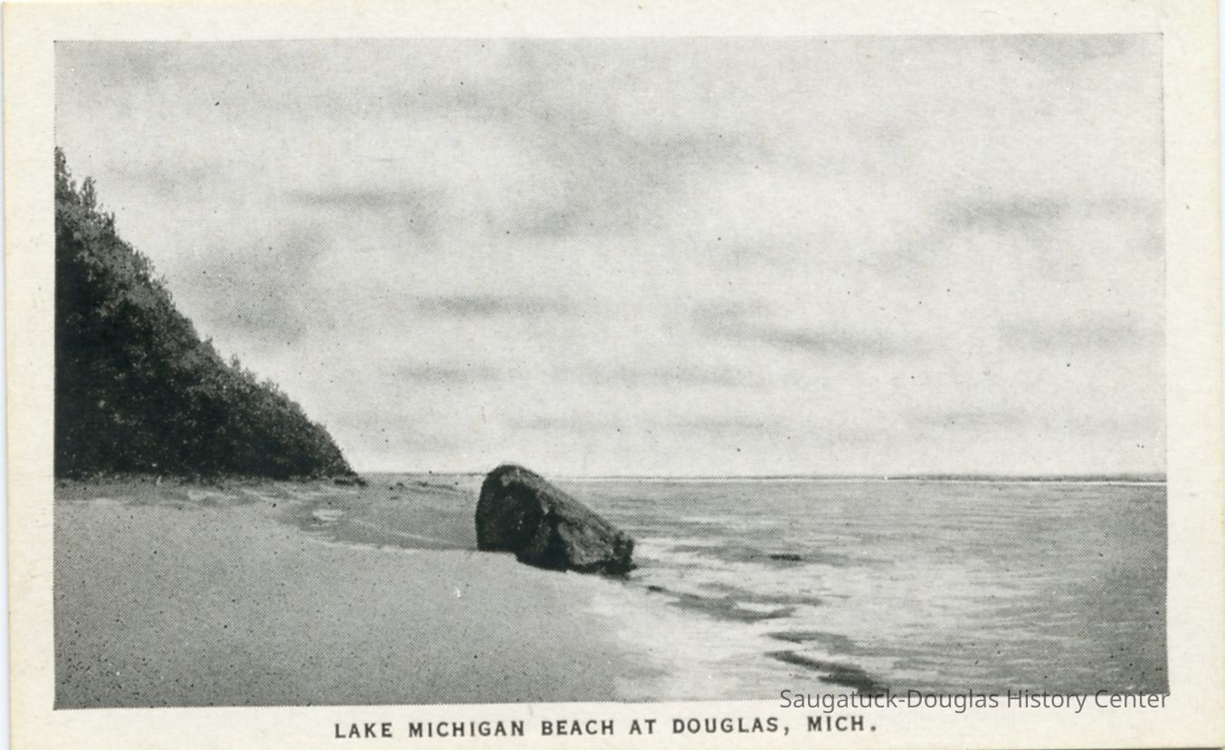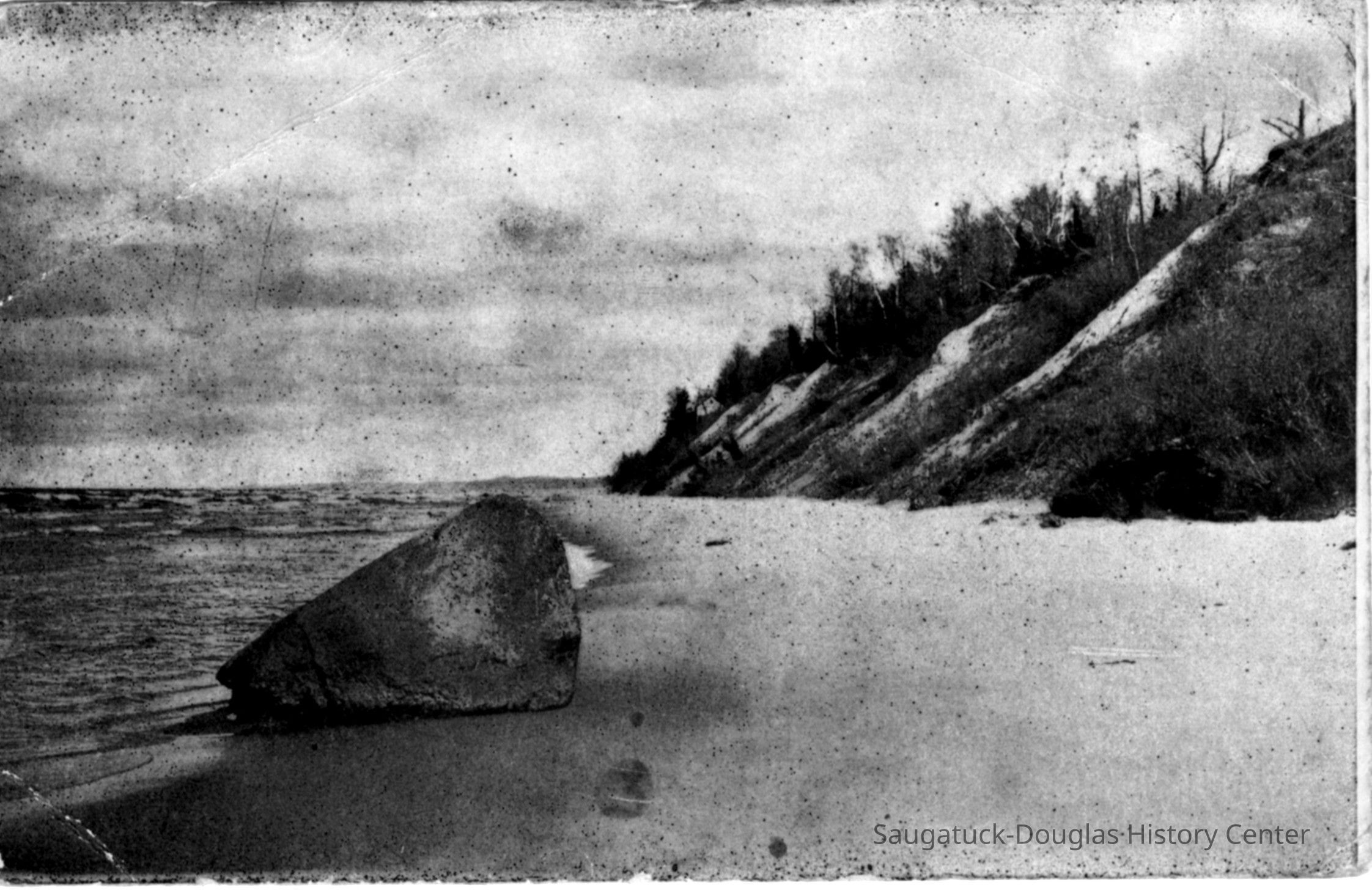 Most feature very large rock, etched with initials and graffiti, that sits on the beach with Lake Michigan in the background. This is the famous "Lost Rock" or "Last Rock" that appears and disappears as lake levels rise and fall and the contours of the beach shift. It is possible multiple rocks that have appeared south of the Douglas Beach have worn the Lost Rock title.