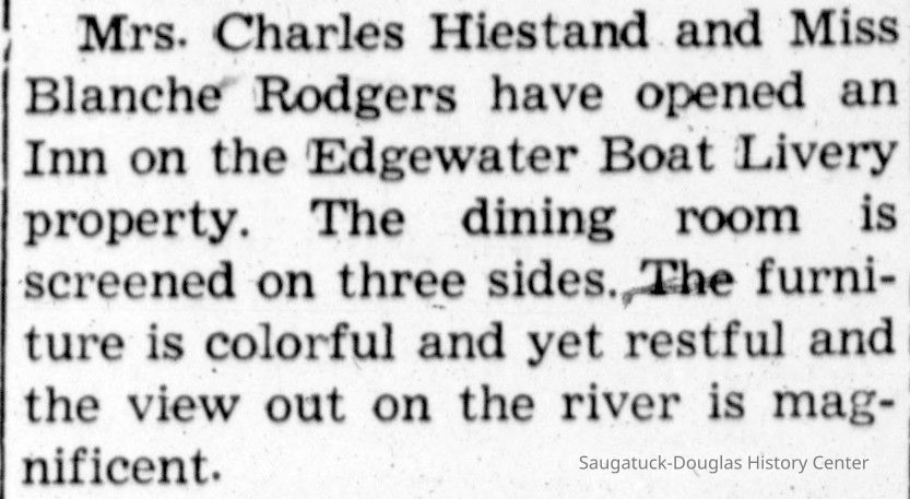 I don't know how many summers the Edgewater Inn was in operation, but I recall how distressed we were when, on our arrival one season, we learned it had closed. Fortunately, then we discovered Wave Crest, run by Ethel Marcotte, Louise Hiestand's sister, in an attractive converted dwelling, quite far south on the Douglas lakeshore. No unique specialties still tickle my taste buds, except for the hot breads and desserts , but I always looked forward to what I knew would be a delicious meal when we planned to go there.