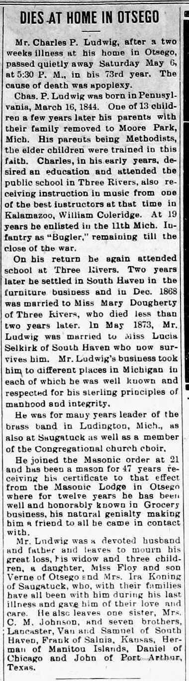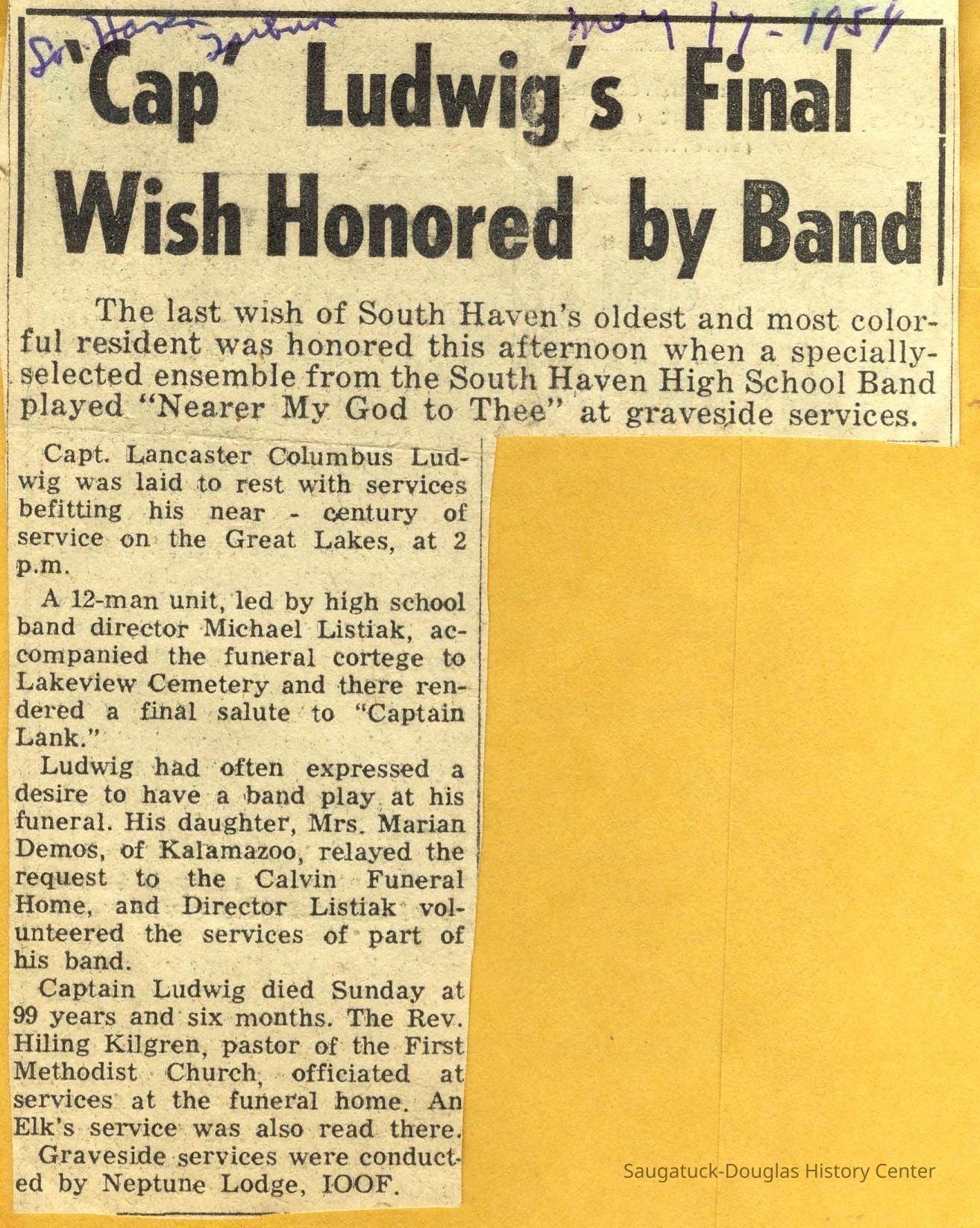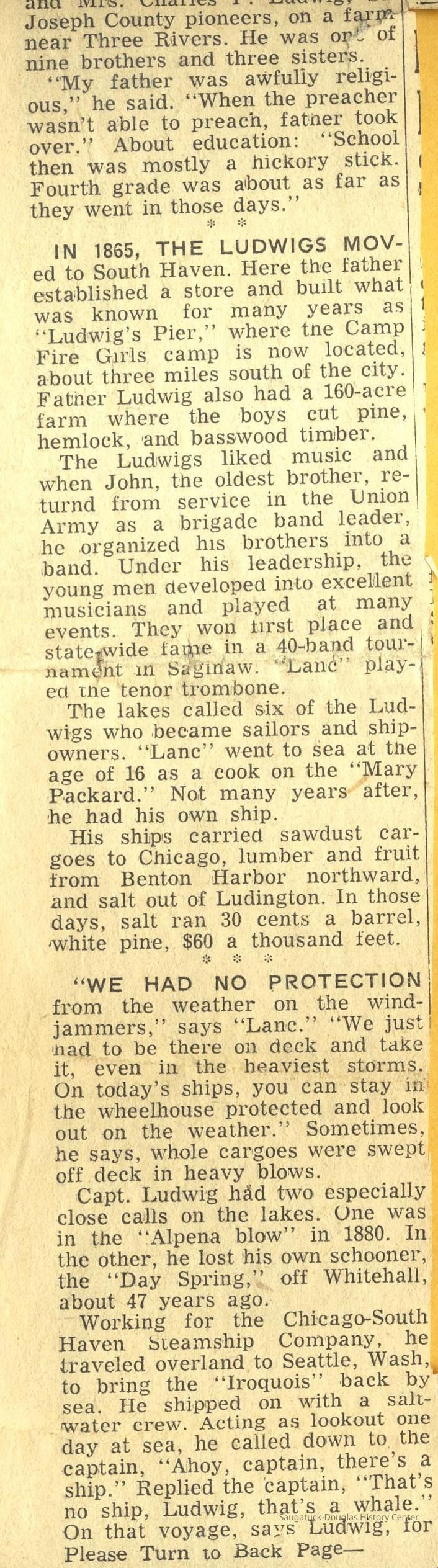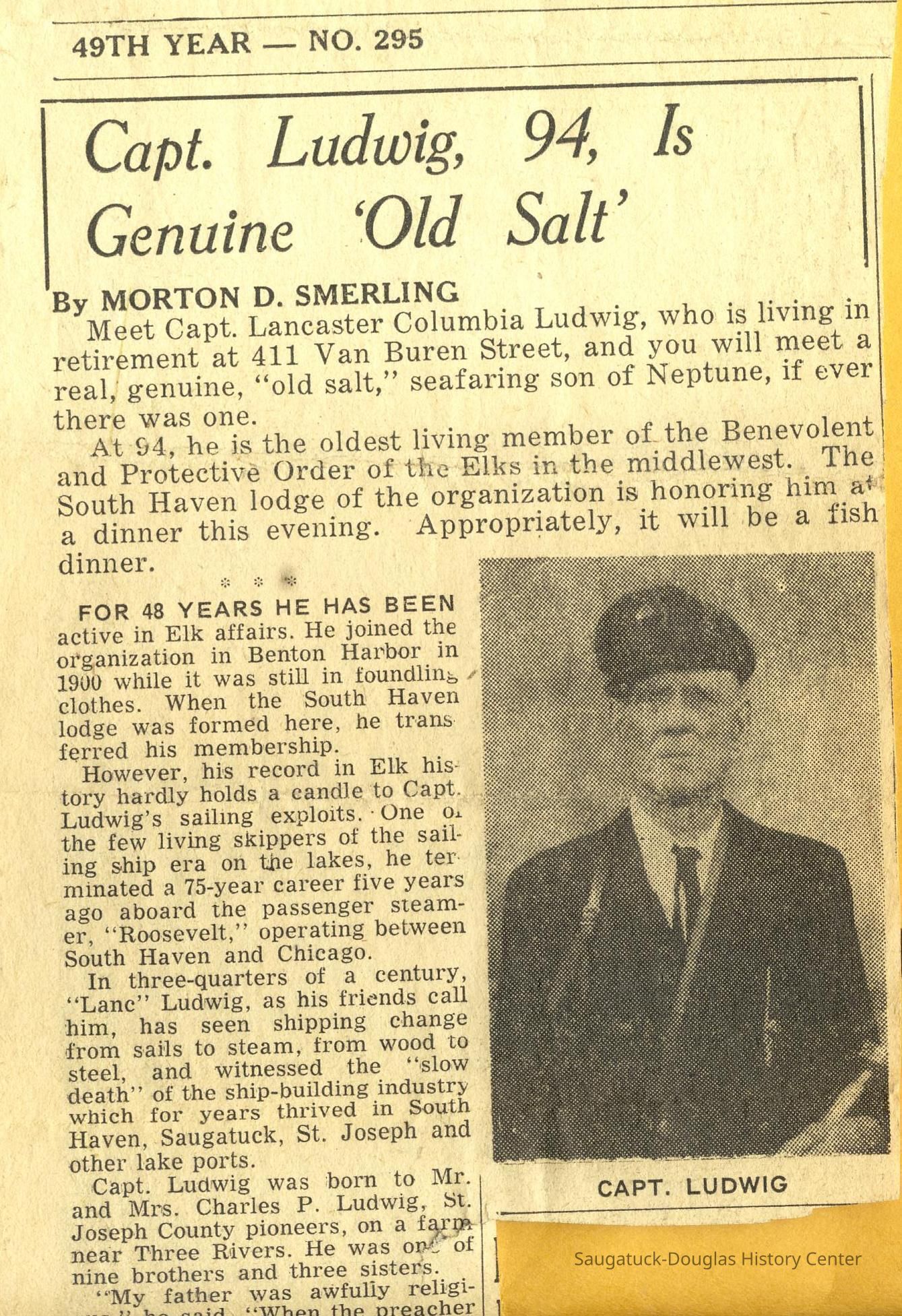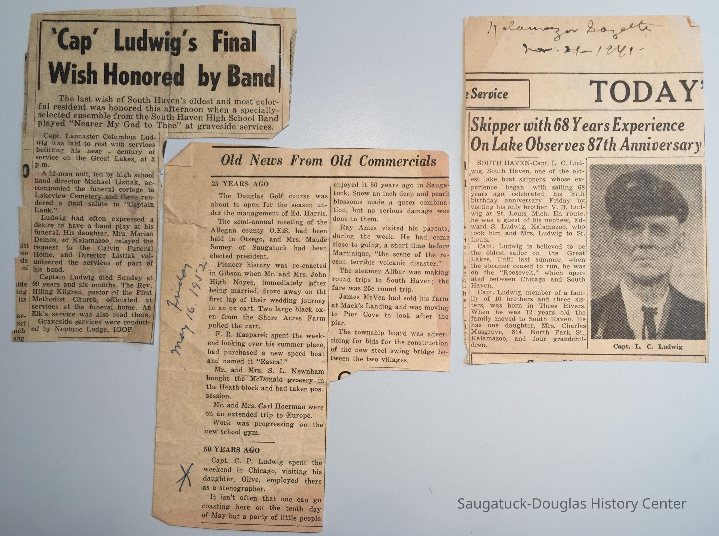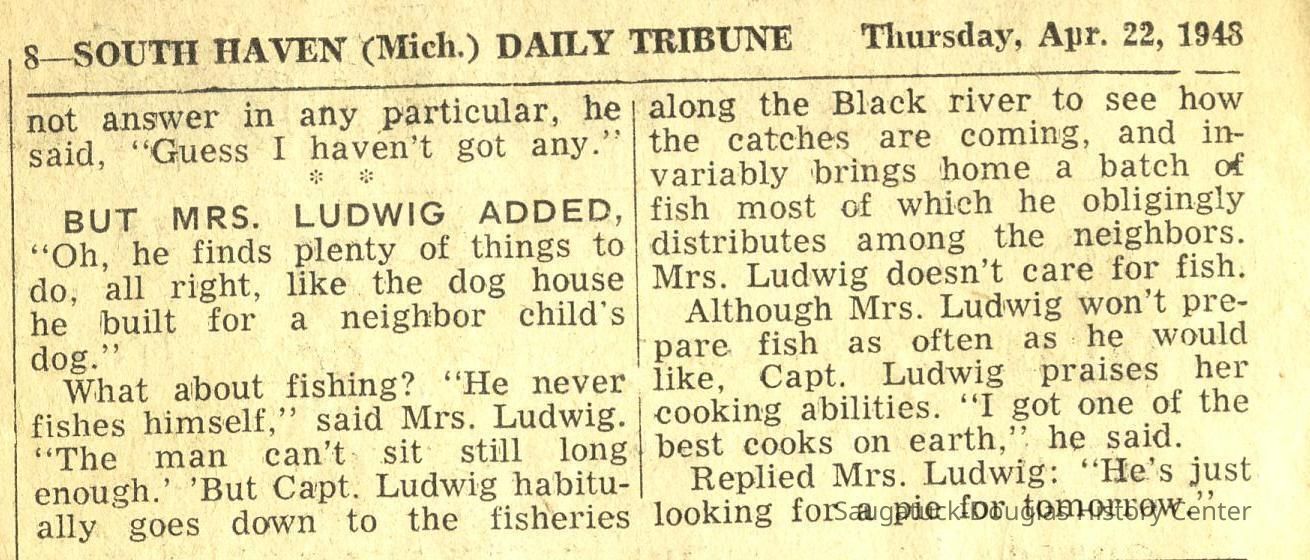 Capt. L.C. Ludwig was a captain based in South Haven and the 1941 Kalamazoo Gazette clip with his photo reports he has one daughter, Mrs. Charles Musgrove of Kalamazoo.