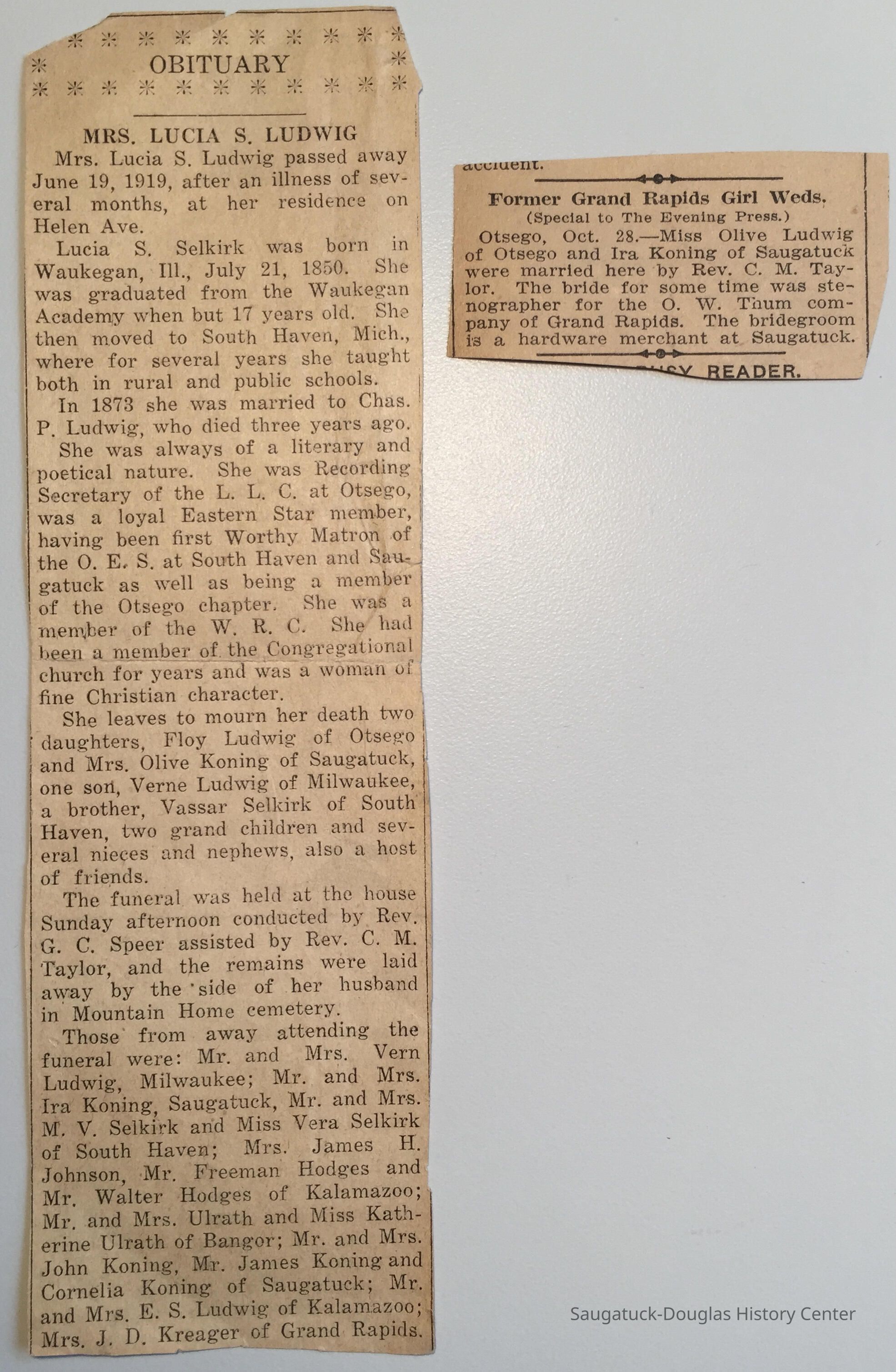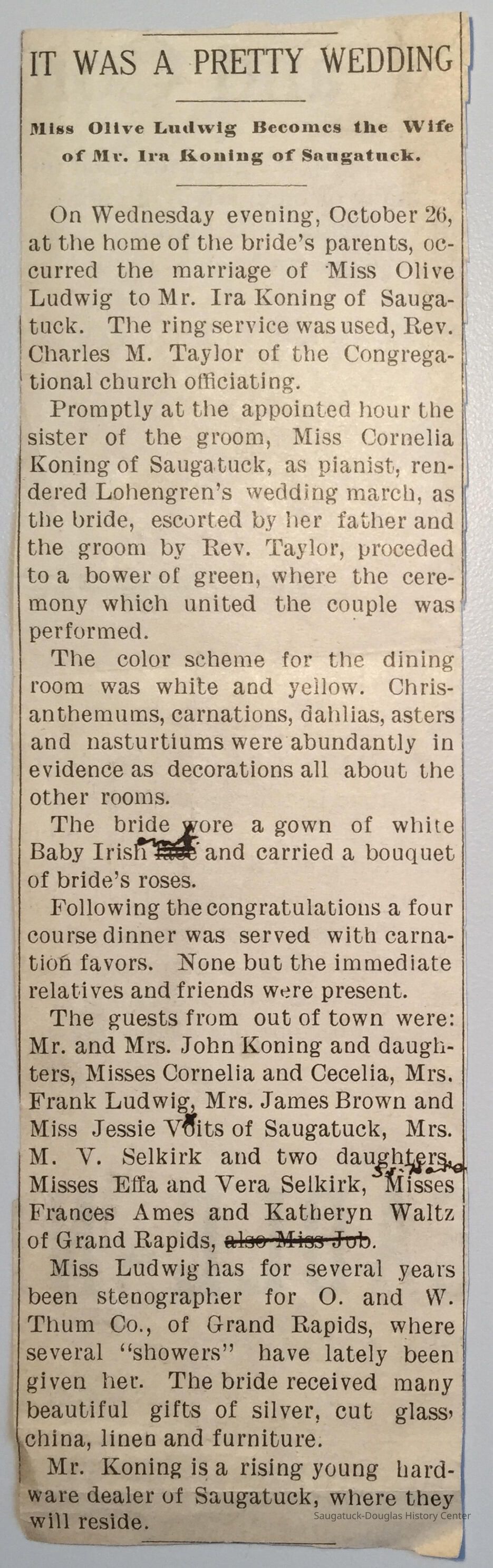 Wedding notice of Miss Olive Ludwig to Mr. Ira Koning. Publication unknown but ads on reverse side is for companies in South Haven and Ostego. Handwritten note gives date of Oct. 26, 1910