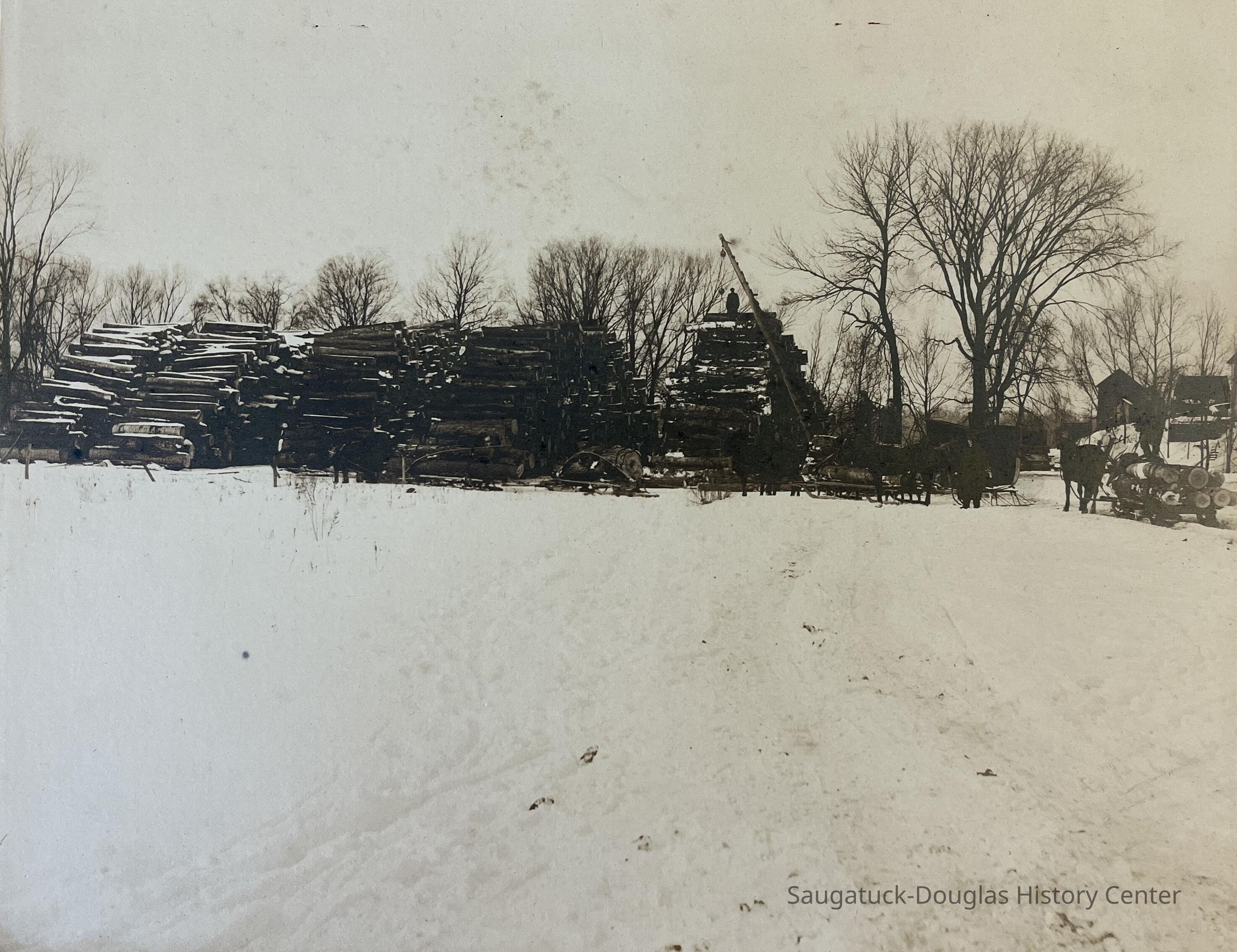 Lumbering in winter, hoisting logs into a large pile. James G. Wark on right standing near cutterPhotograph Details