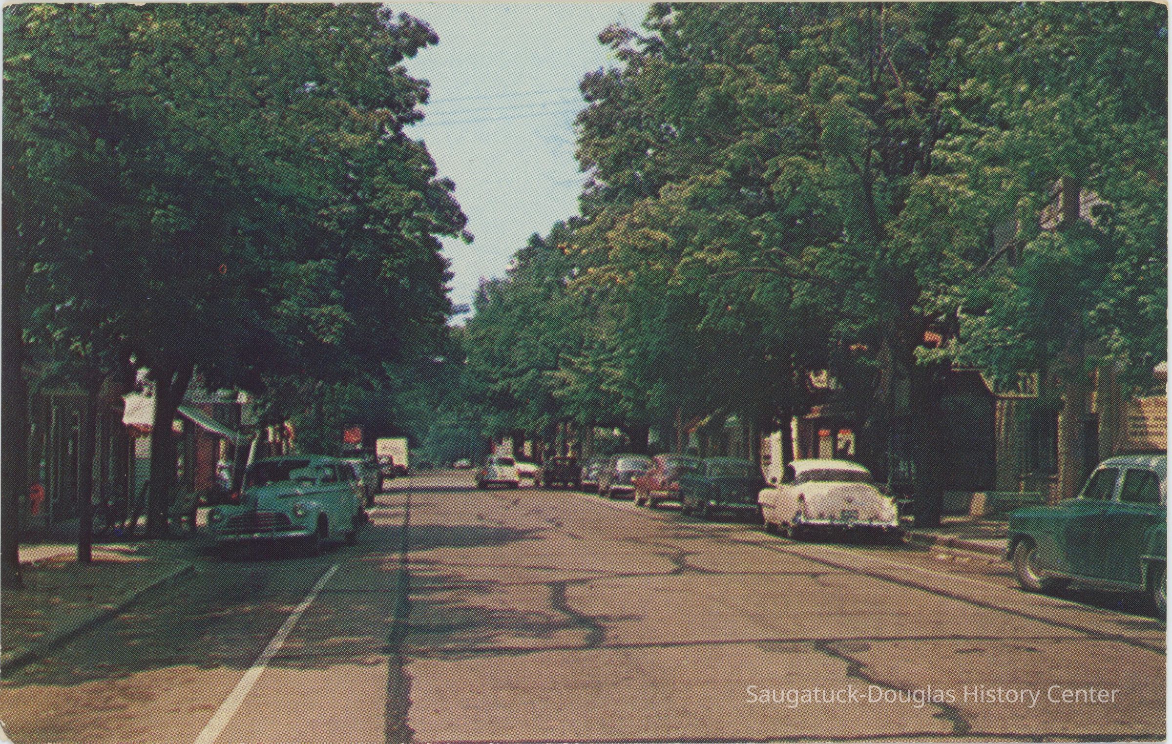 A color postcard showing a street view of Saugatuck. Cars are parallel parked alongside the road on a quiet summer day.Subject Place