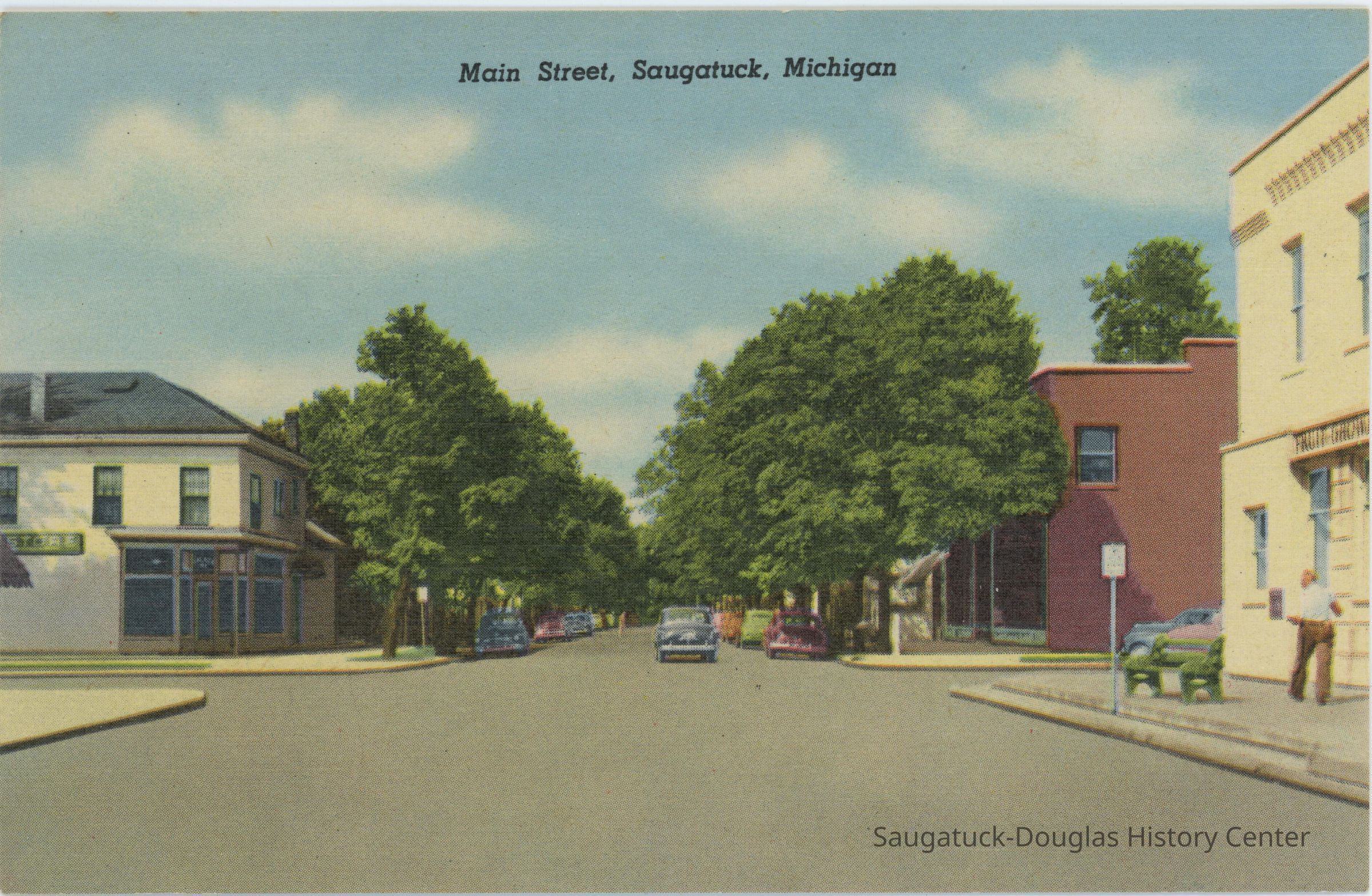 A color postcard showing a street view of Main St in Saugatuck, Michigan. A man can be seen walking on the sidewalk on the right of the image. A car drives away in the center. Three buildings can be seen on each of the visible corners of the intersection.Subject Place