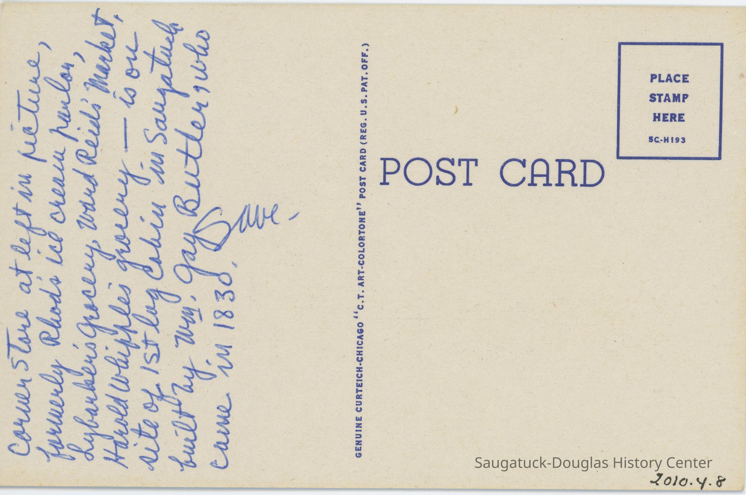 Corner store at left in picture, formerly Rhod's ice cream parlor, Lybarber's grocery, Ward Reid's market, Harold Whipple's grocery---is on site of 1st log cabin in Saugatuck built by [illegible, Mr?] Gay Butler, who came in 1830.Dimensions