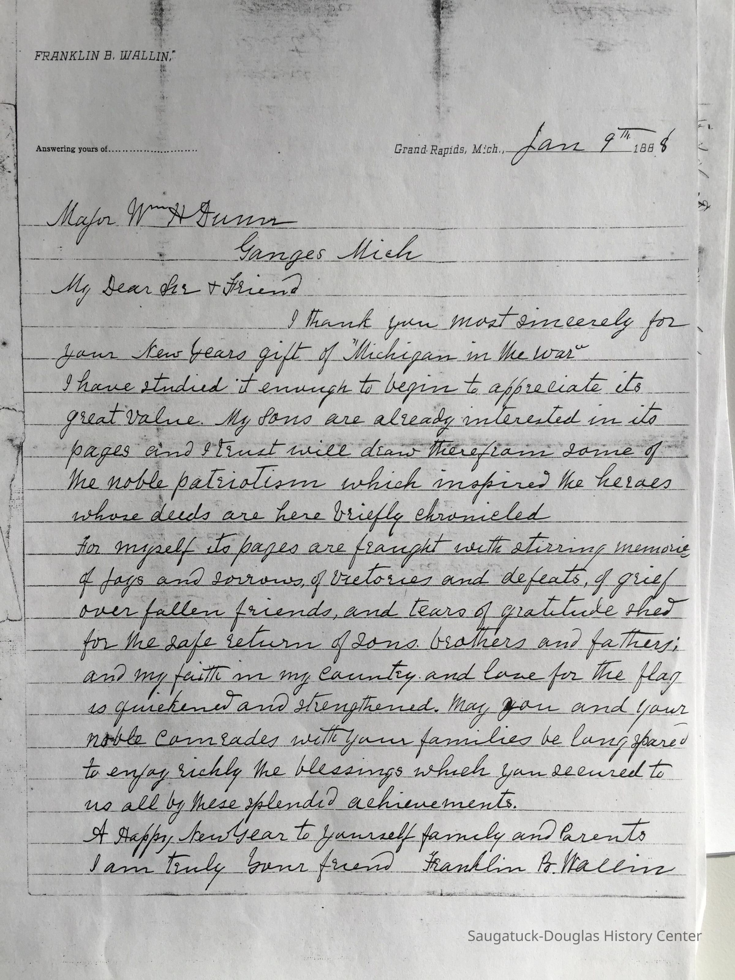 I thank you most sincerely for your New Years gift of "Michigan in the War." I have studied it enough to begin to appreciate its great value. My sons are already interested in its pages and I trust will draw therefrom some of the noble patriotism which inspired the heroes whose deeds are here briefly chronicled. For myself its pages are fraught with stirring memories of joys and sorrows of victories and defeats, of grief over fallen friends and tears of gratitude shed for the safe return of sons, brothers and fathers; and my faith in my country and love for the flag is quickened and strengthened. May you and your noble comrades with your families be long spared to enjoy richly the blessings which you secured to us all by these splendid achievements. A Happy New Year to yourself family and parents. I am truly your friend.