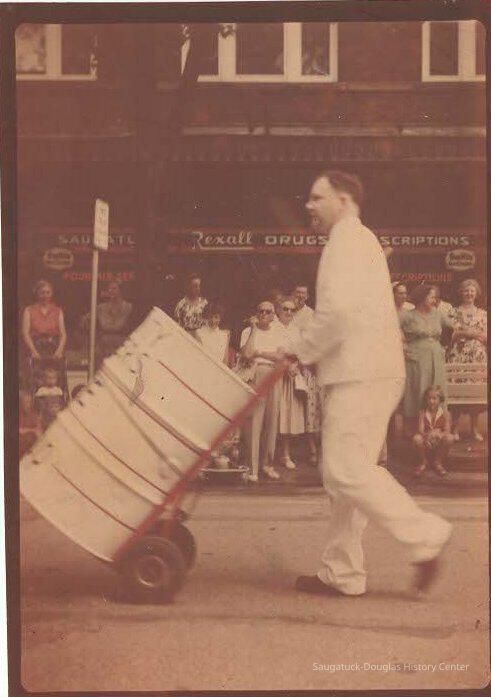 5"x7" color photo of a man in a white work uniform pushing a white metal drum on a cart through the Saugatuck parade. Photo taken in front of the Rexall Drug Store on the corner of Mason and Butler.Photograph Details