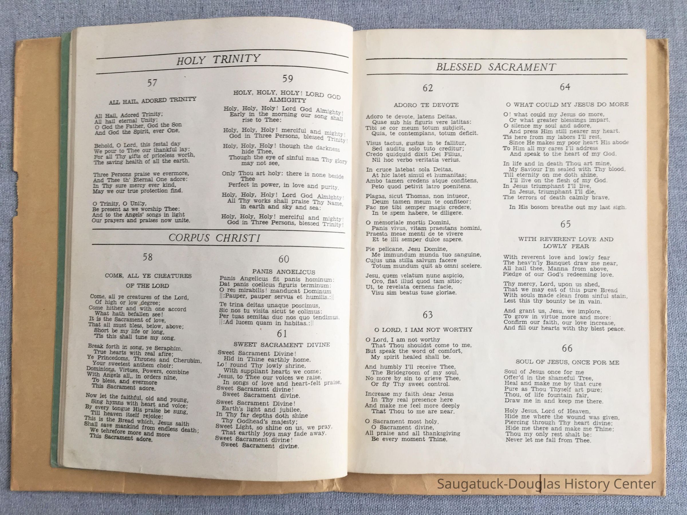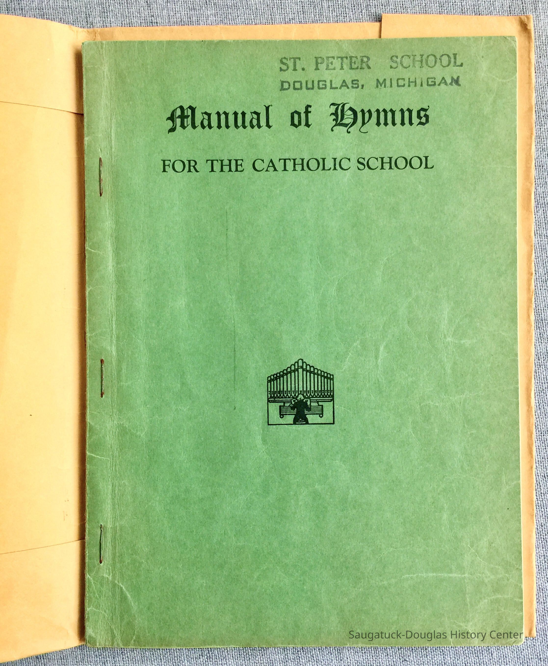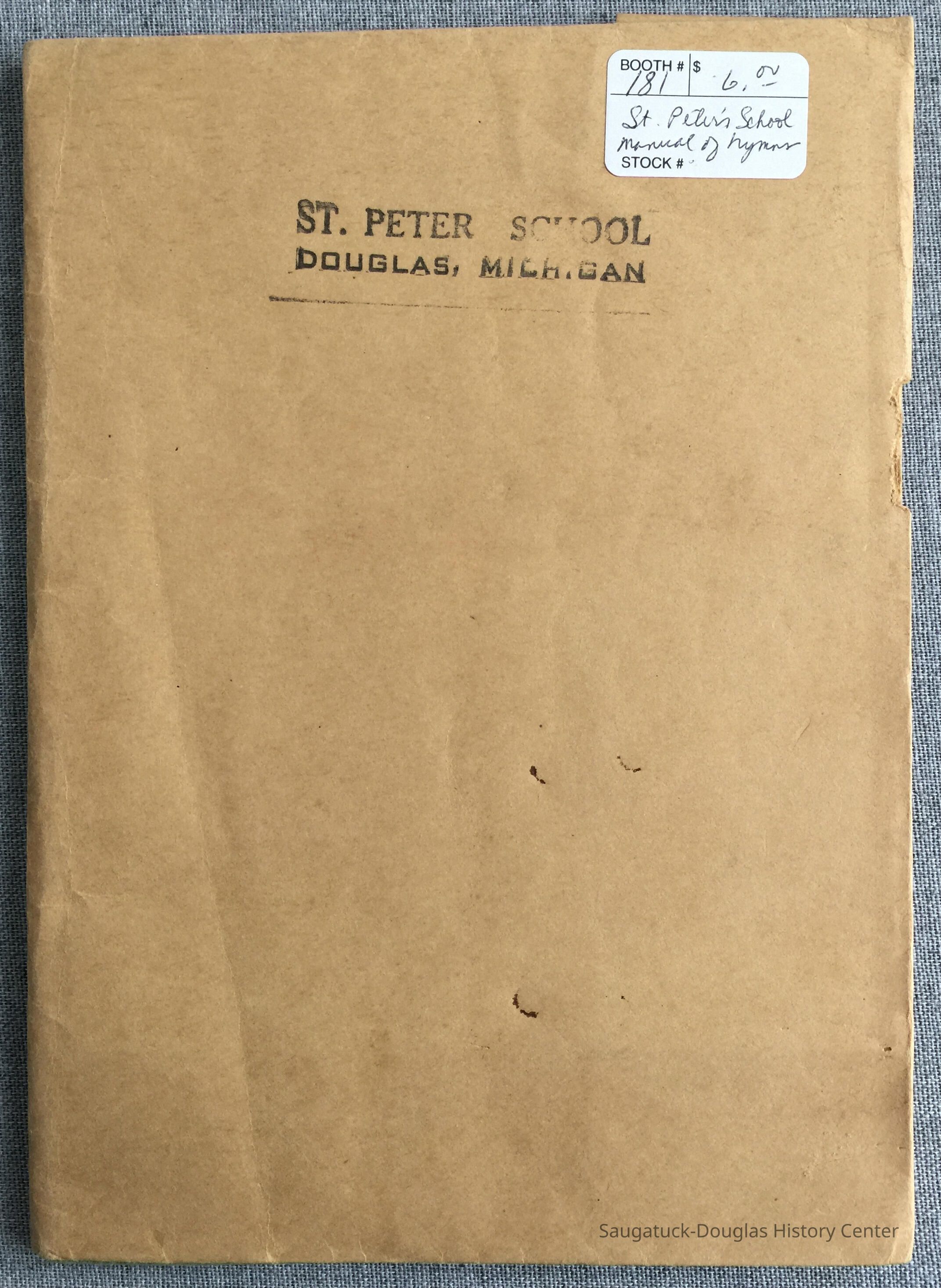 Green stapled booklet with kraft-paper protective cover, both items stamped "St. Peter School, Douglas, Michigan"Cataloged By
