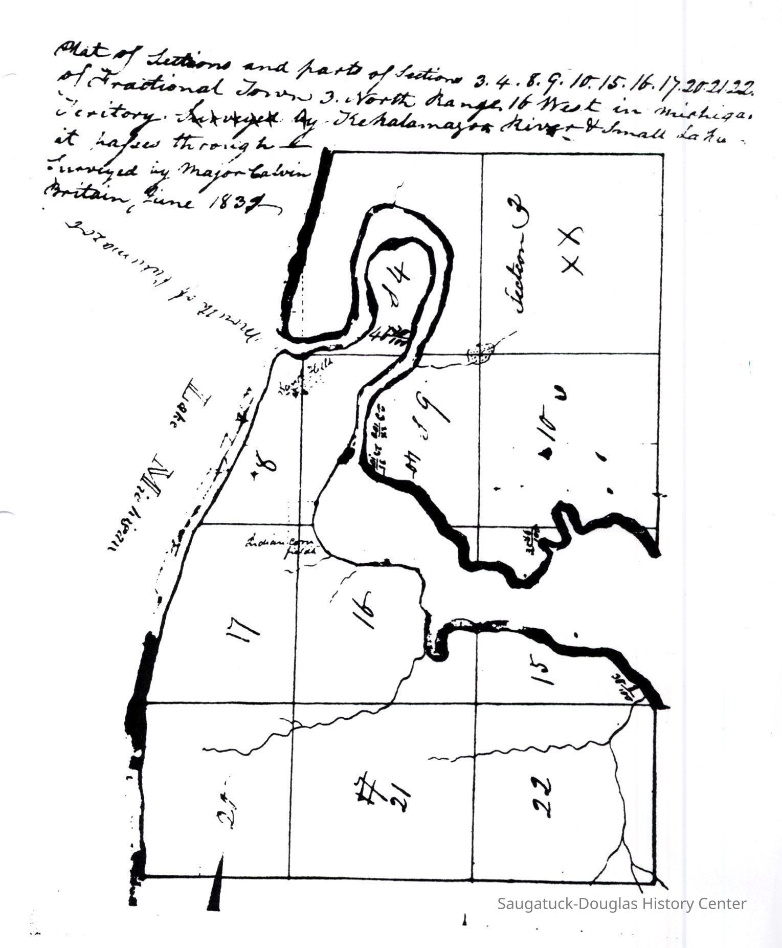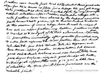 A recently discovered map drawn of the land around Saugatuck in 1831 or 1832. The notes are in the hand of William G. Butler, the first settler who arrived in 1830. It is unclear who the letter was written to, or when. Below is a somewhat speculative transliteration of the words. The meaning is often unclear because of lack of punctuation. Butler writes that there was an old Indian village at the site.Collection