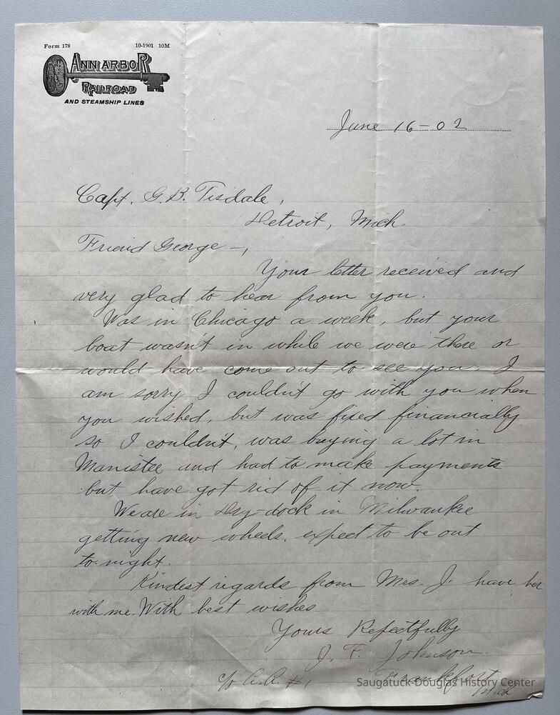 Reverse side is personal letter dated June 16, 1902 to Capt. George B. Tisdale, Detroit, Mich. from J.F. Johnson, Frankfort, Mich.