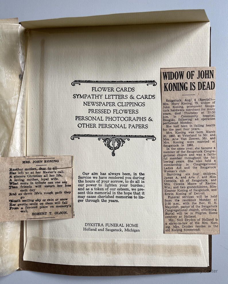 Pages includes lists of family members, funeral attendants, names of people who called, sent flowers, loaned automobiles, and an envelope attached to the inside back cover to stash cards. The envelope contains two newspaper clippings: Mary's death notice and a poem in her honor submitted by Robert T. Olson. Both clippings have the date trimmed away.Context