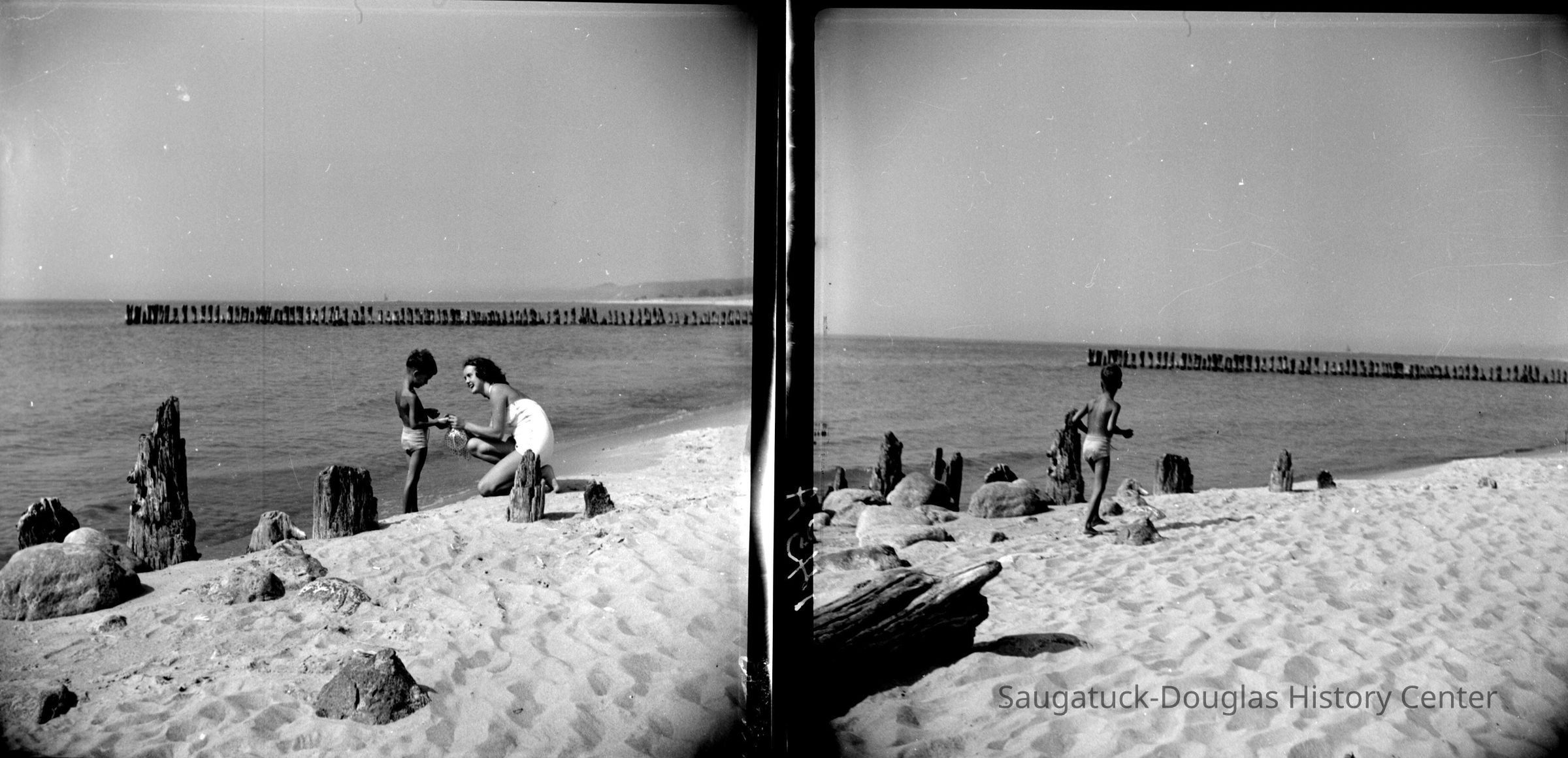 A young boy and a woman play at the beach near the remains of the old channel pilings. If woman is Donna Dee Parish Masselink, then the boy is likely Gerrit Parrish Masselink.