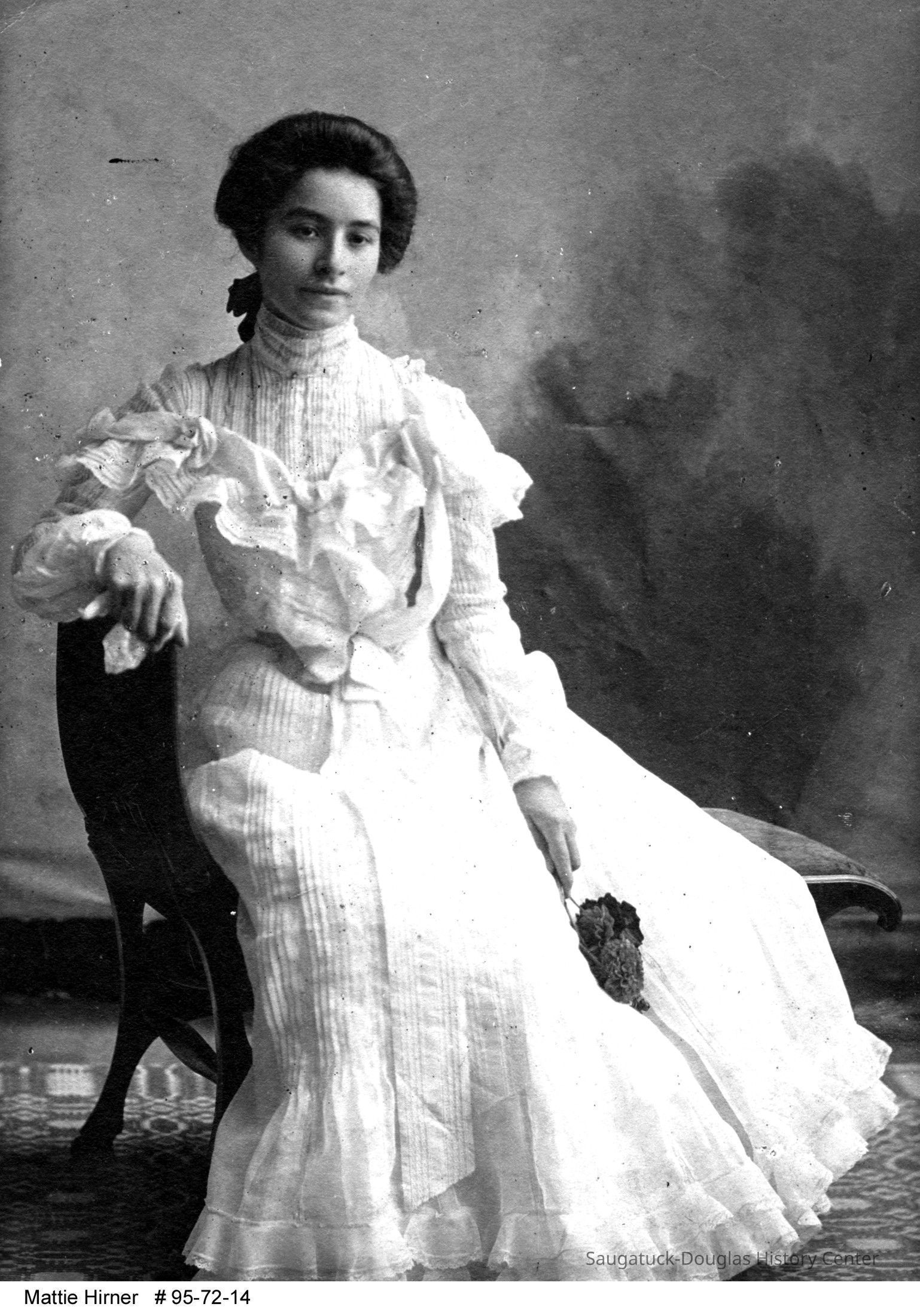Saugatuck High School graduation photo of Mattie Hirner. As was typical of female graduates in that day, Ms. Hirner is wearing a long white gown with many ruffles, pintuks and fine details. She is holding a flower and her hair is neatly drawn back from her young face. Studio portrait.