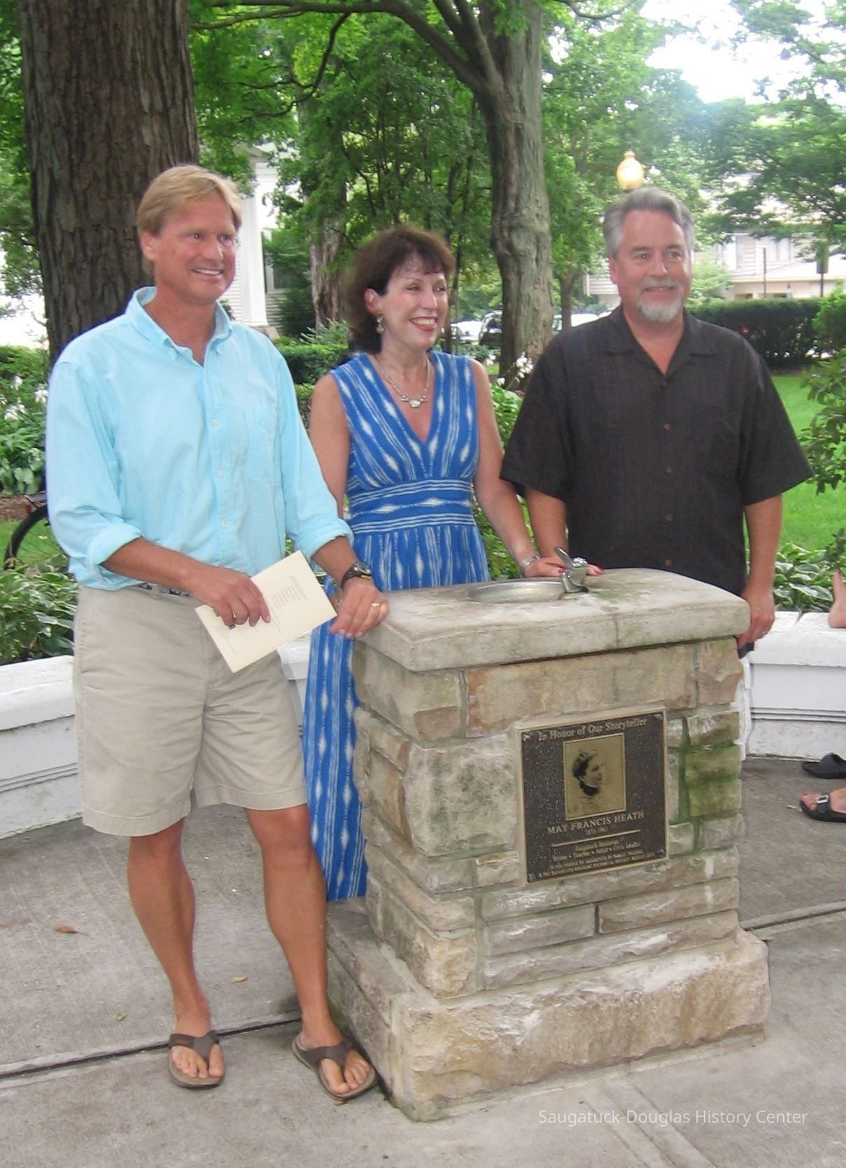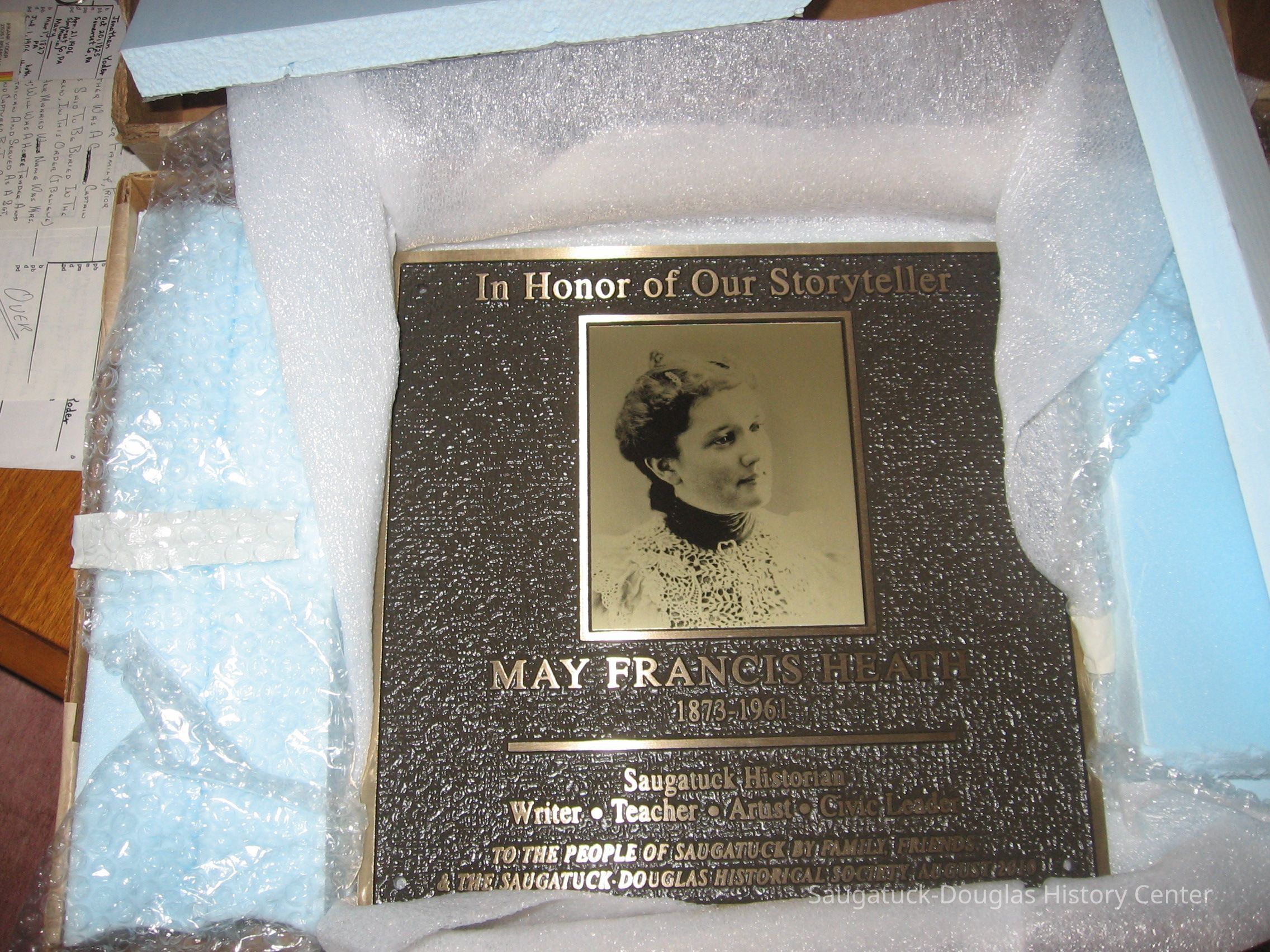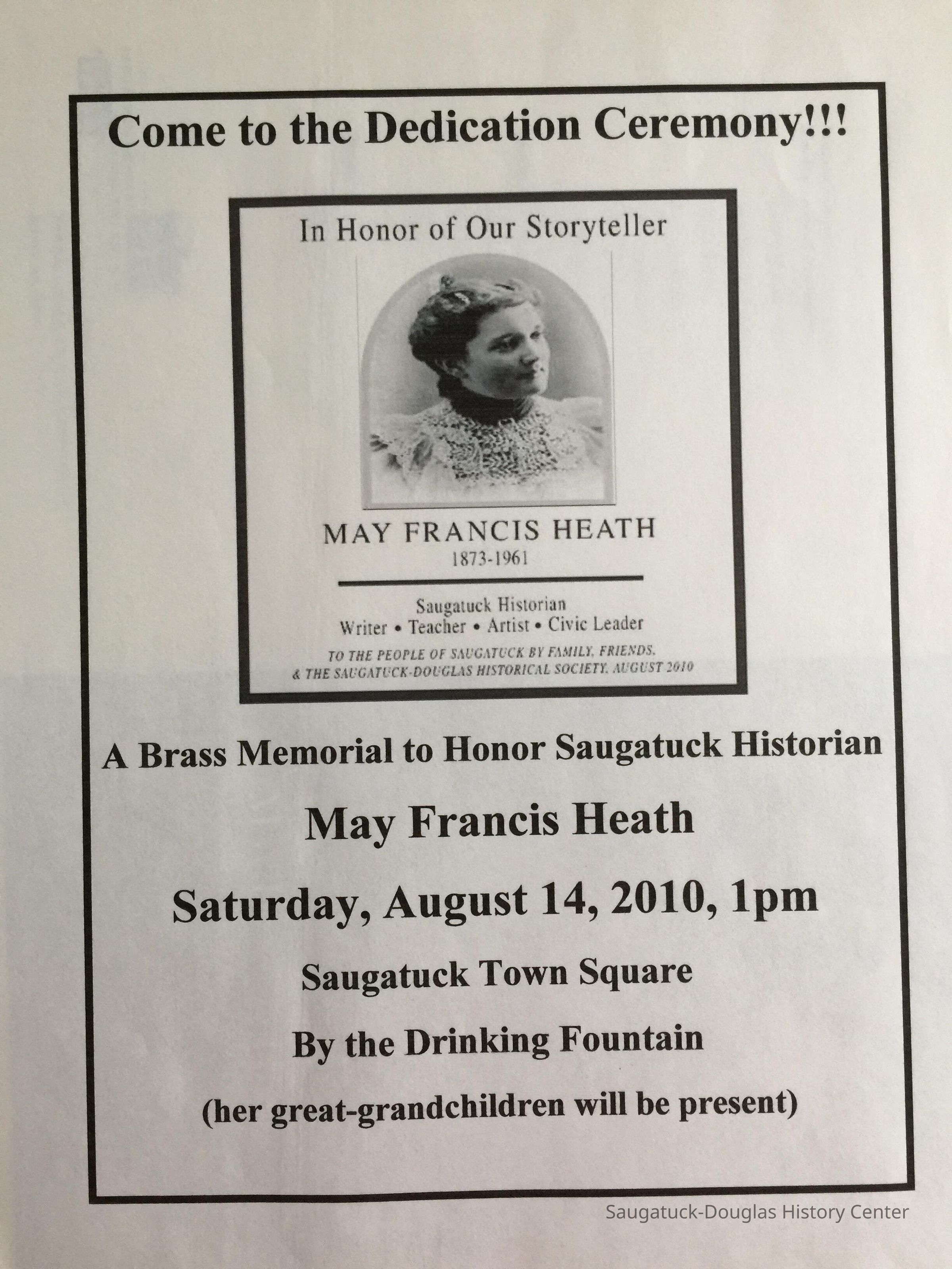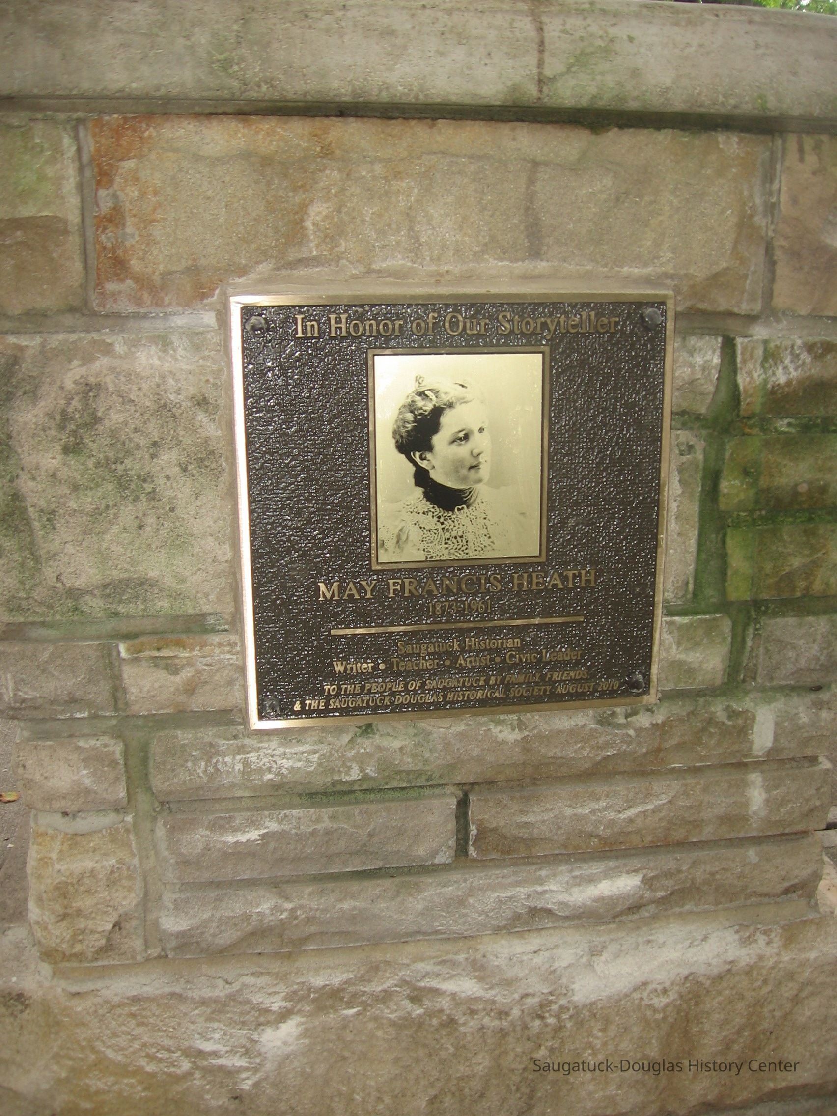 A bronze plaque memorial honoring May Francis Heath (1873-1961), early Saugatuck historian, writer, teacher, artist and civic leader, will be unveiled and dedicated to the people of Saugatuck in a public ceremony at the water fountain in Saugatuck Village Square on Saturday, August 14 at 1pm.