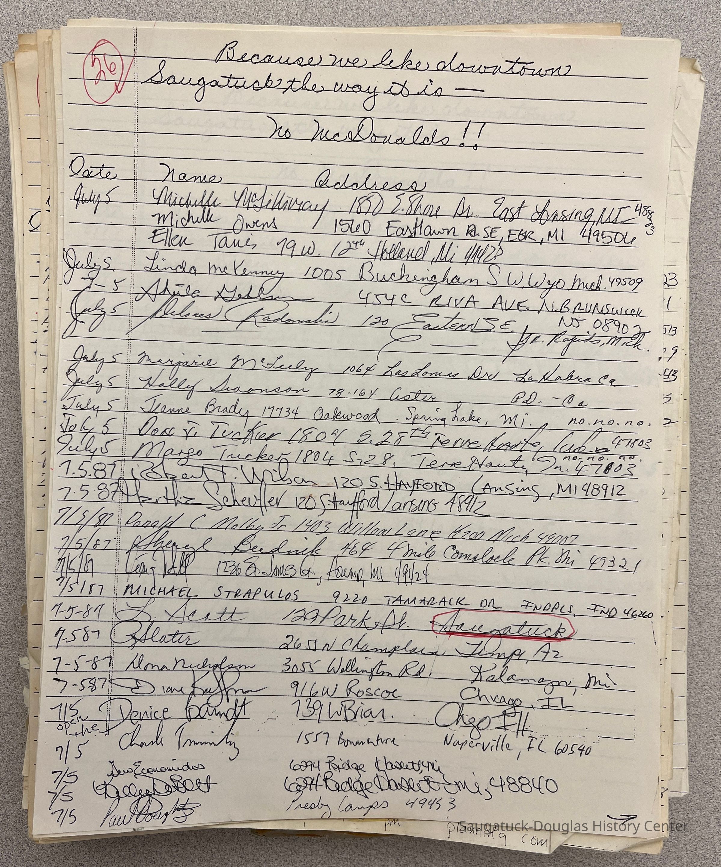 Signed petition pages collected by Joyce Petter and others to document resistance to the prospect of a McDonalds franchise coming to Saugatuck.Context
