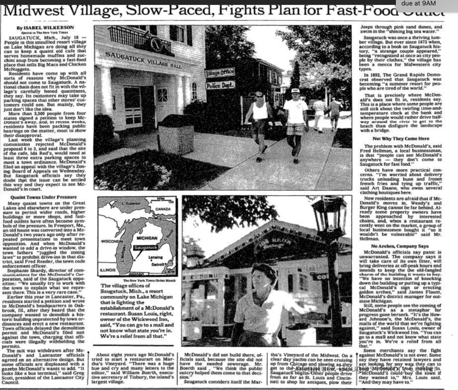 A New York Times article from 19 July 1987 states "more than 3,500 people from four states signed a petition to keep McDonald's away." The article goes on to outline the town's history as a resort from the first "city people" sighting in 1873 to "in 1892, The Grand Rapids Democrat observed that Saugatuck was becoming 'a summer resort for people who are tired of the world.' "Collection