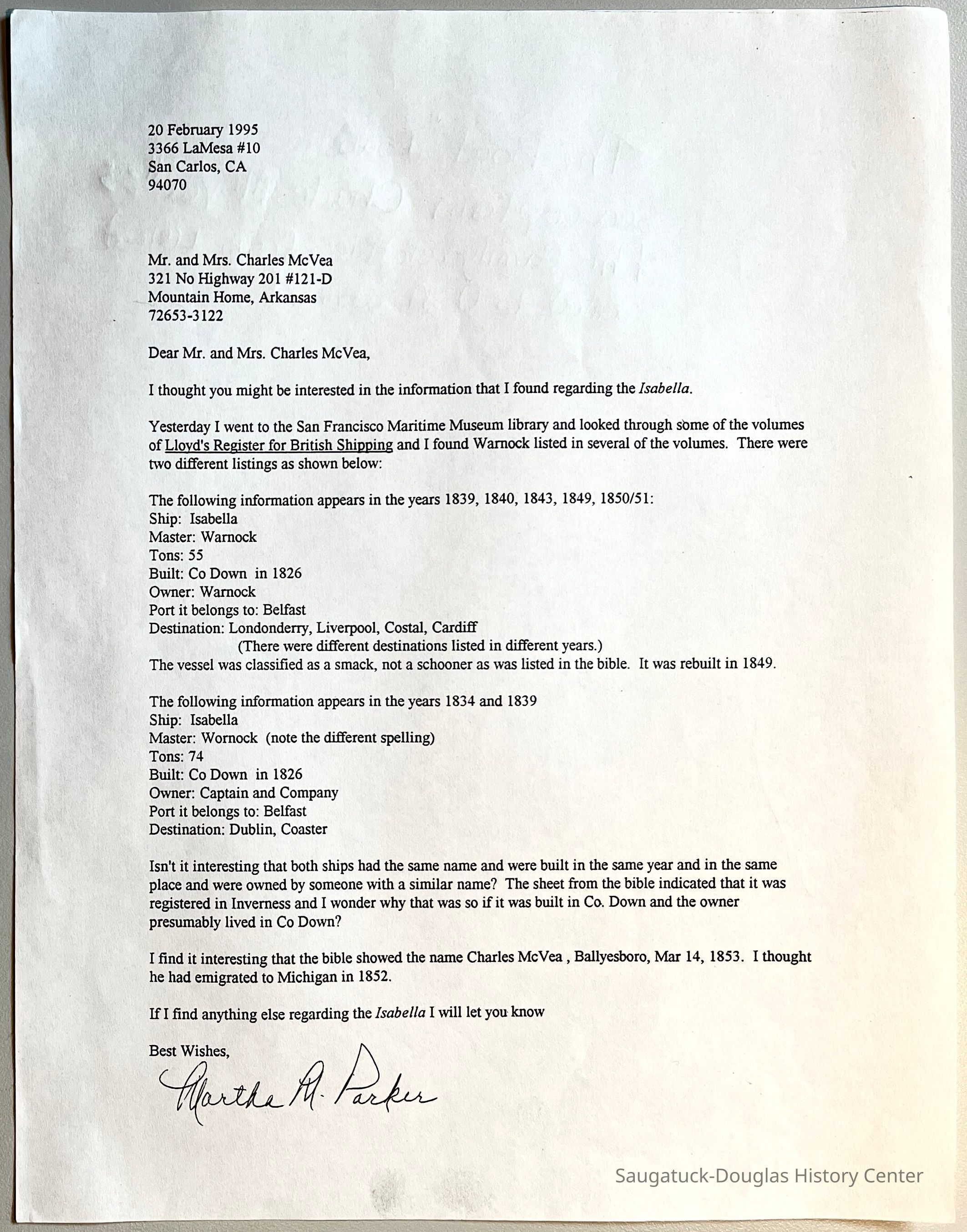 P. 1995 letter to Charles McVea of Mountain Home, Arkansas with information about a ship named the Isabella that was built in 1826.