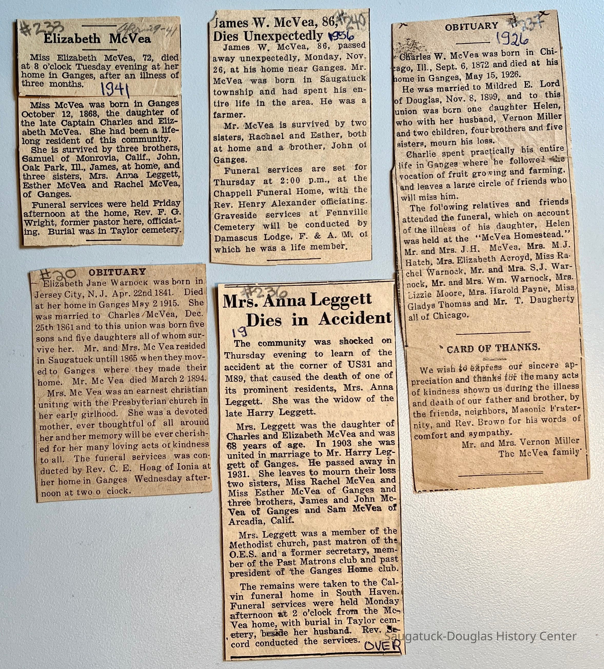 J. Newspaper clippings of obituaries for Elizabeth McVea #233 marked 1941, Elizabeth Jane Warnock #20, James W. McVea #240, Mrs. Anna (McVea) Leggett #236 and Charles W. McVea #237 marked 1926.
